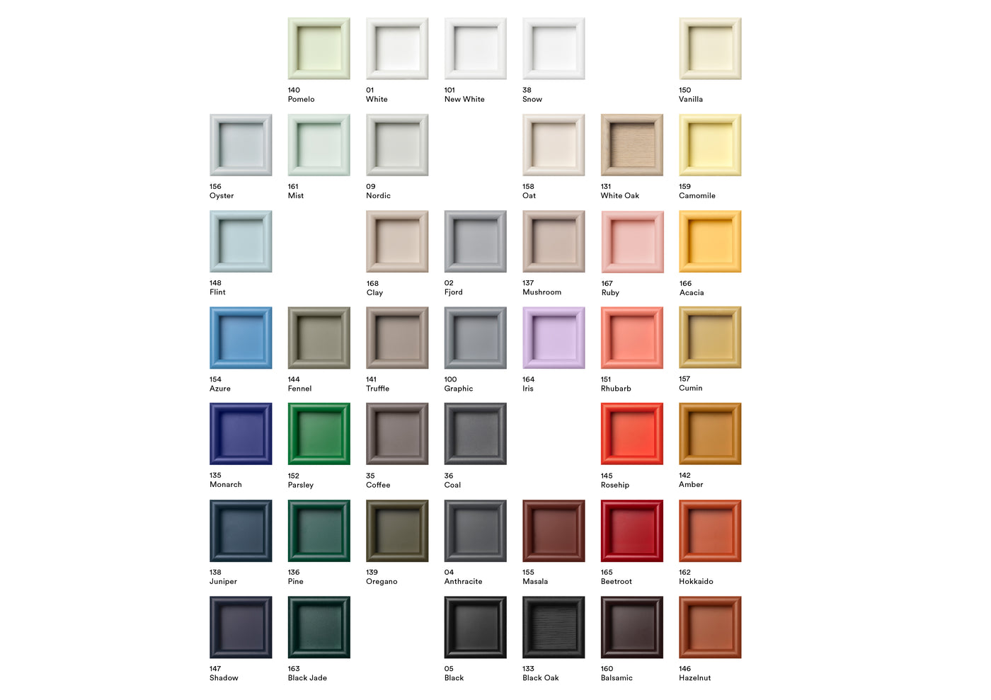 De nyeste farver er hedder; Acacia, Clay, Ruby, Pomelo, Vanilla, Oyster, Mist, Oat, Camomile, Flint, Mushroom, Cumin, Azure, Fennel, Truffel, Iris, Rhubarb, Amber, Monarch, Parsley, Rosehip, Juniper, Pine, Oregano, Masala, Beetroot, Hokkaido, Shadow, Black Jade, Balsamic, Hazelnut og kan nu bestilles sammen med de 12 farver der bliver i sortimentet; Coffee, Black, Coal, Fjord, White, Antrachite, New White, Snow, Nordic, Graphic samt de to finér-udgaver White Oak & Black Oak. Der vil være et tillæg på bestillinger med White Oak eller Black Oak, da dette er finér-udgaver.