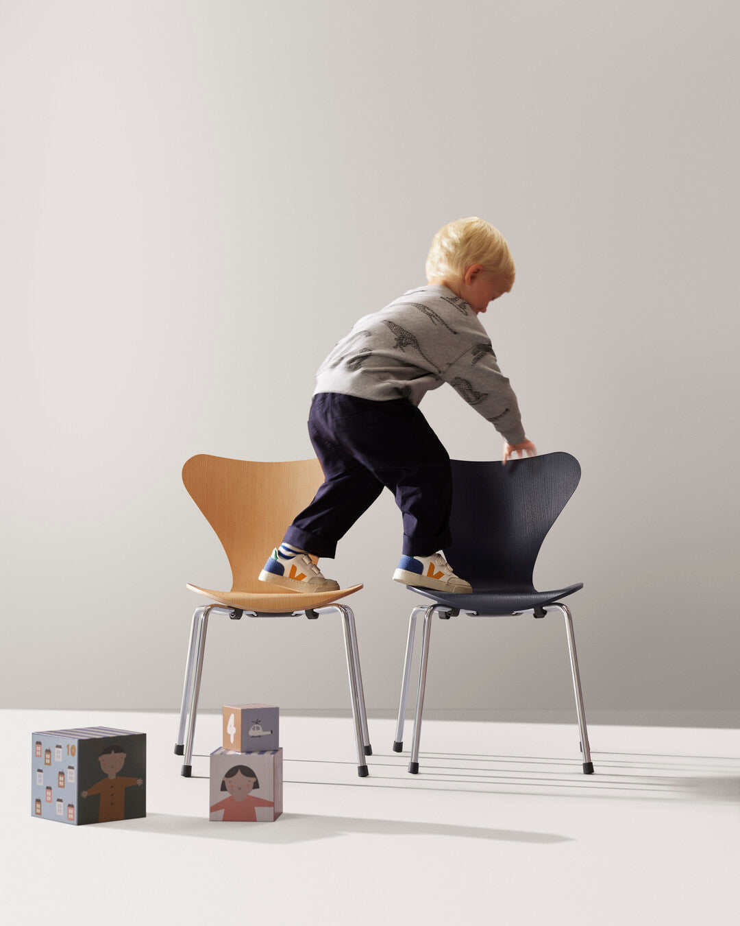 3177 barnestol af Arne Jacobsen. Den ikoniske syverstol blev for første lanceret til børn i 2005. Den introduceres her i tre nye farver. Oplev en palette af midnight blue, wild rose og oregon pine. Stolen vil pynte ethvert børneværelse.