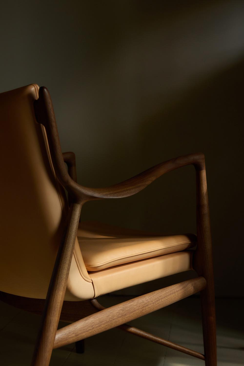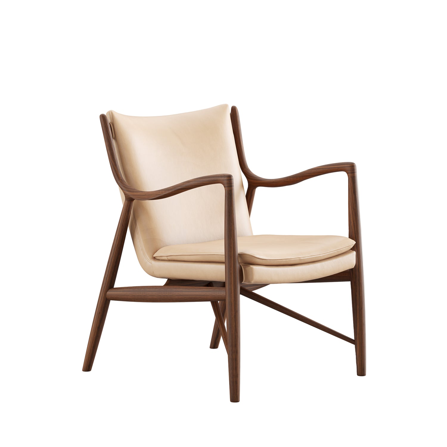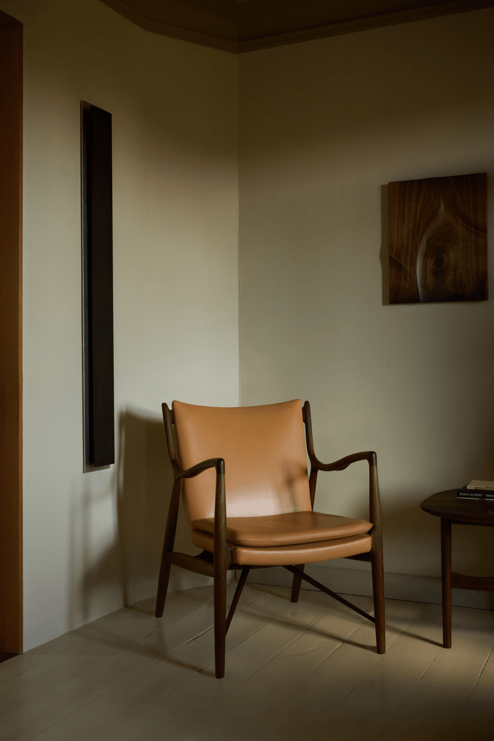 Oplev skulpturel elegance med 45 Lænestol i valnød – en ikonisk klassiker af Finn Juhl, fremstillet med kompromisløst håndværk og udsøgt træ. Denne version med stel i massivt valnød fremhæver stolens varme og naturlige karakter, mens det organiske formsprog og det opgivne, svævende sæde skaber en visuel lethed, der svæver i rummet. Lænestolen tilføjer både funktionel komfort og kunstnerisk identitet til ethvert eksklusivt interiør – perfekt til designelskere, der søger det bedste i dansk møbelkunst.