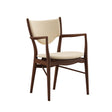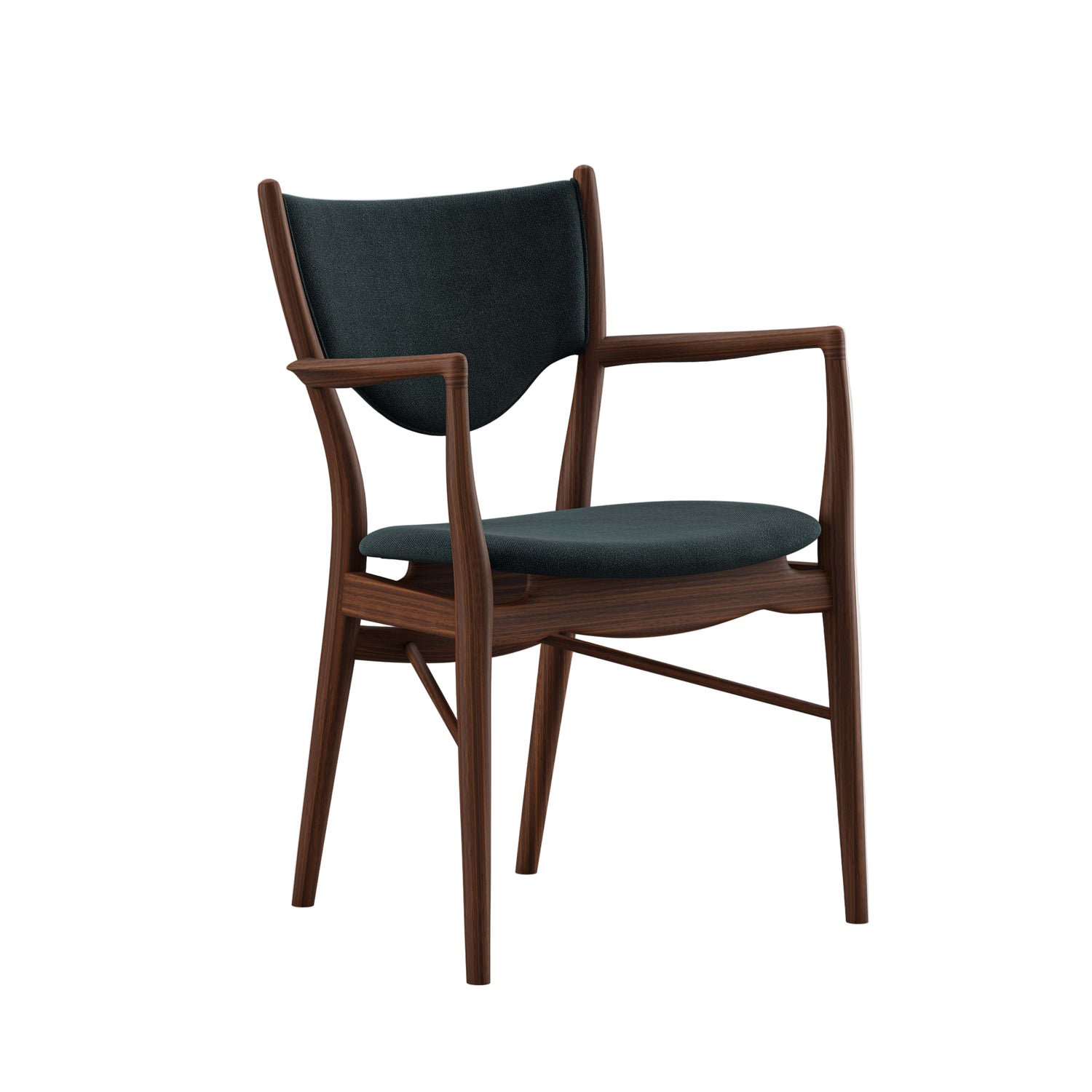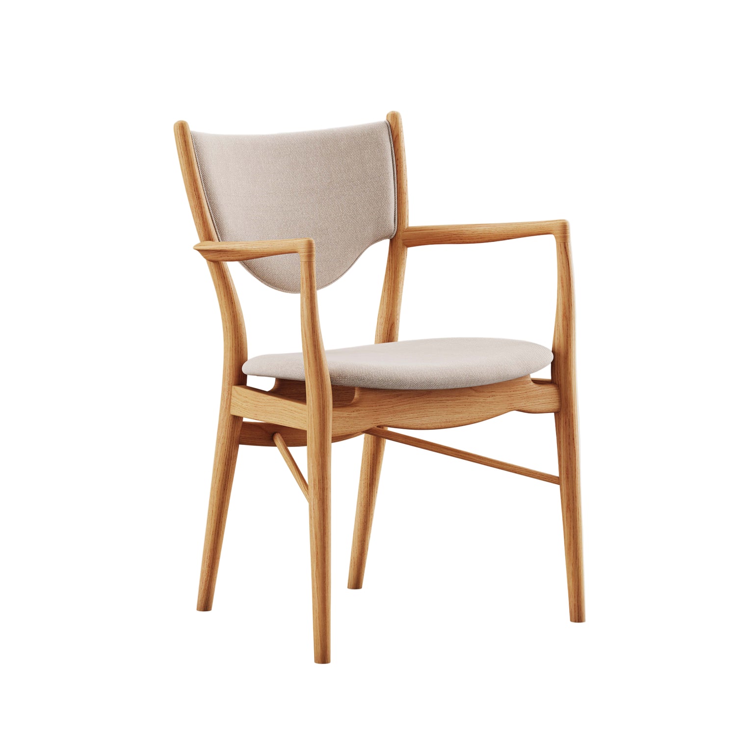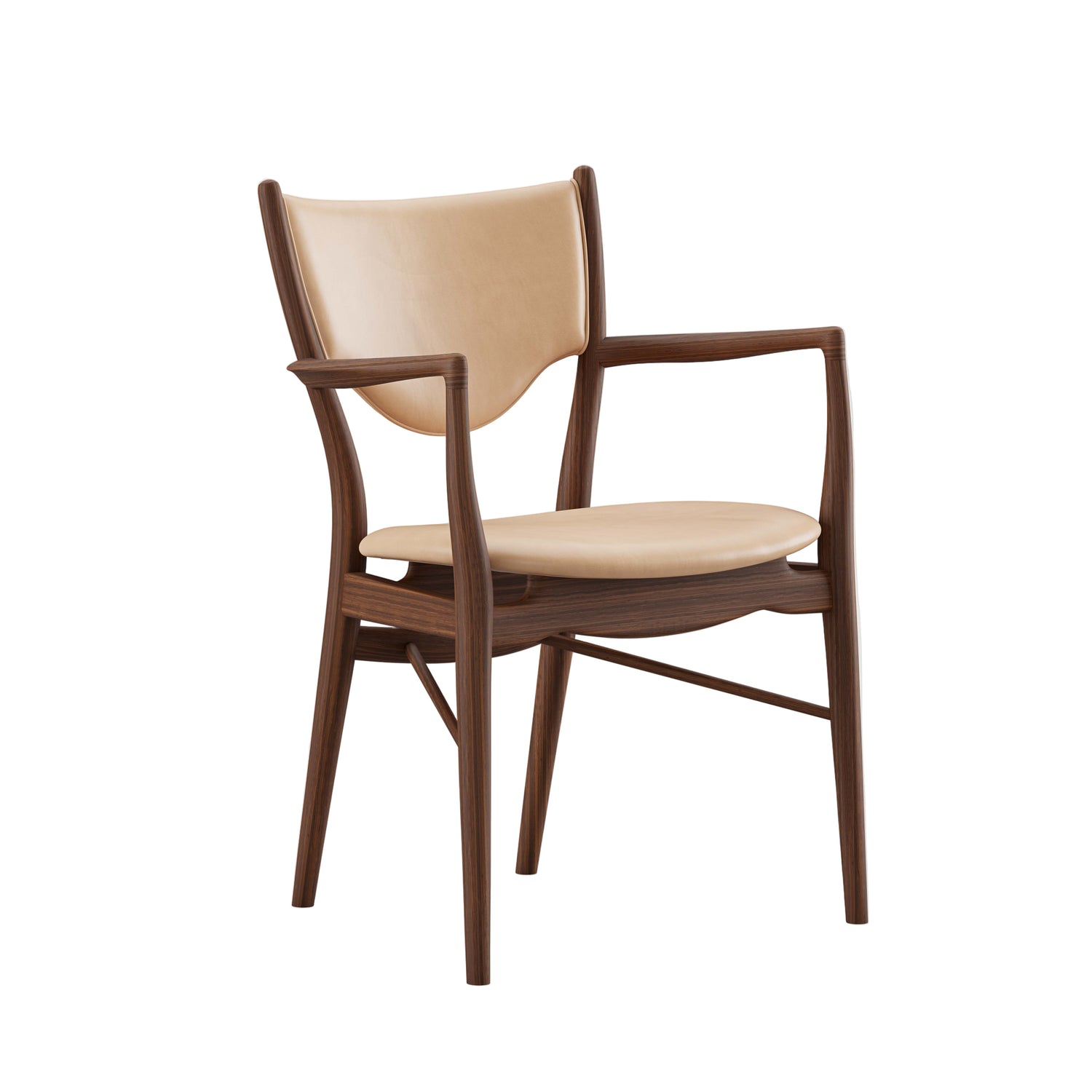 46 Armchair fra House of Finn Juhl er en raffineret spisebordsstol, der forener organisk lethed med udsøgt komfort. Formen er svævende og skulpturel med de karakteristiske frie armlæn, som følger armens naturlige vinkel. Den solide ramme i valnød understreger den varme glød og den fine åretegning, mens det polstrede sæde og ryglæn giver en behagelig støtte ved måltider og lange samtaler. Stolen blev tegnet i 1946 og relanceret i 2008 med respekt for de originale snedkertraditioner, hvilket mærkes i de bløde overgange, præcise samlinger og den balancerede siddekomfort. 46 Armchair er et ikon i dansk design og et klassisk valg til det krævende spiseområde, hvor æstetik og holdbarhed skal gå hånd i hånd. Vælg mellem tekstil eller læder for at skabe det udtryk, der passer til dit hjem, og oplev hvordan stolen tilfører ro, kvalitet og personlighed til rummet.