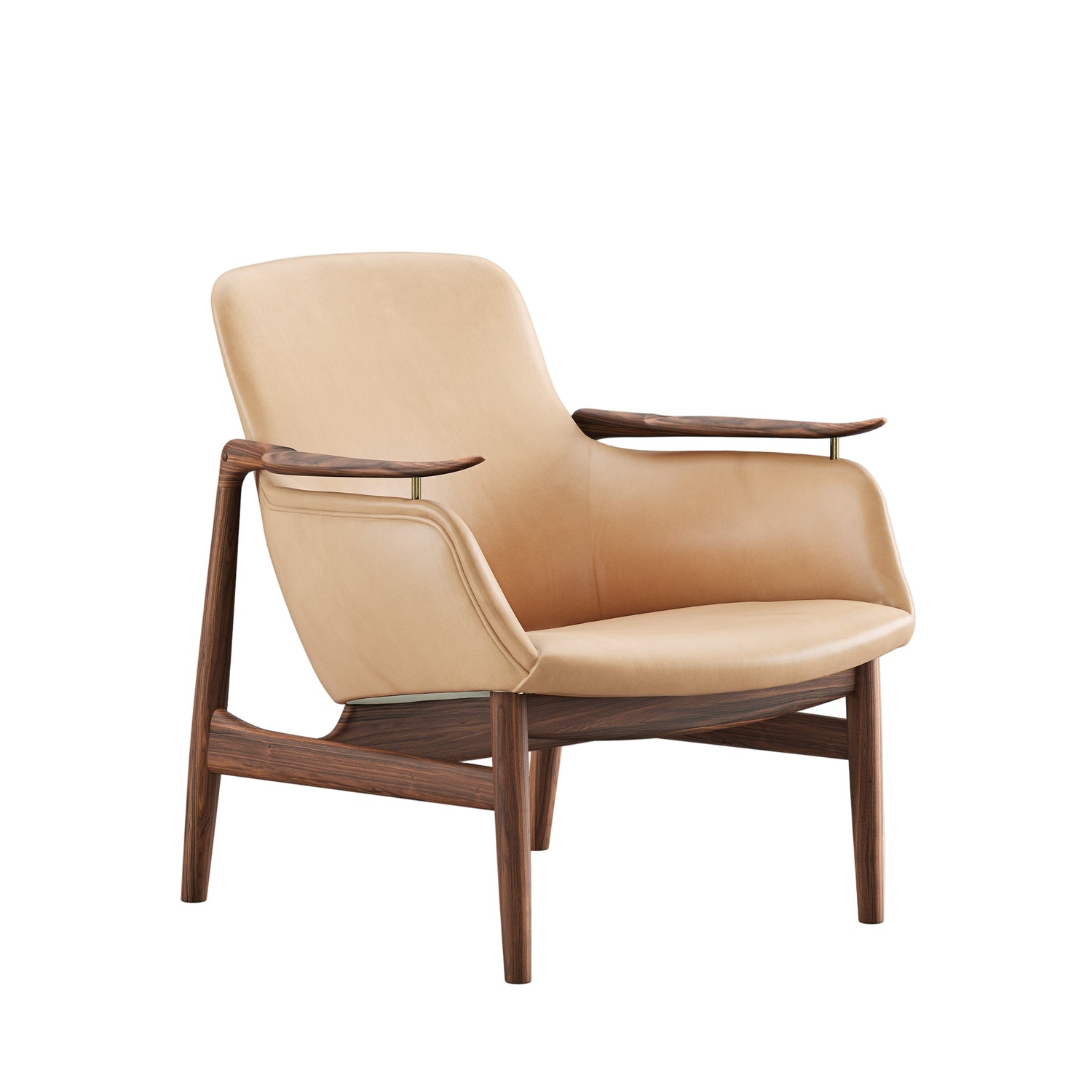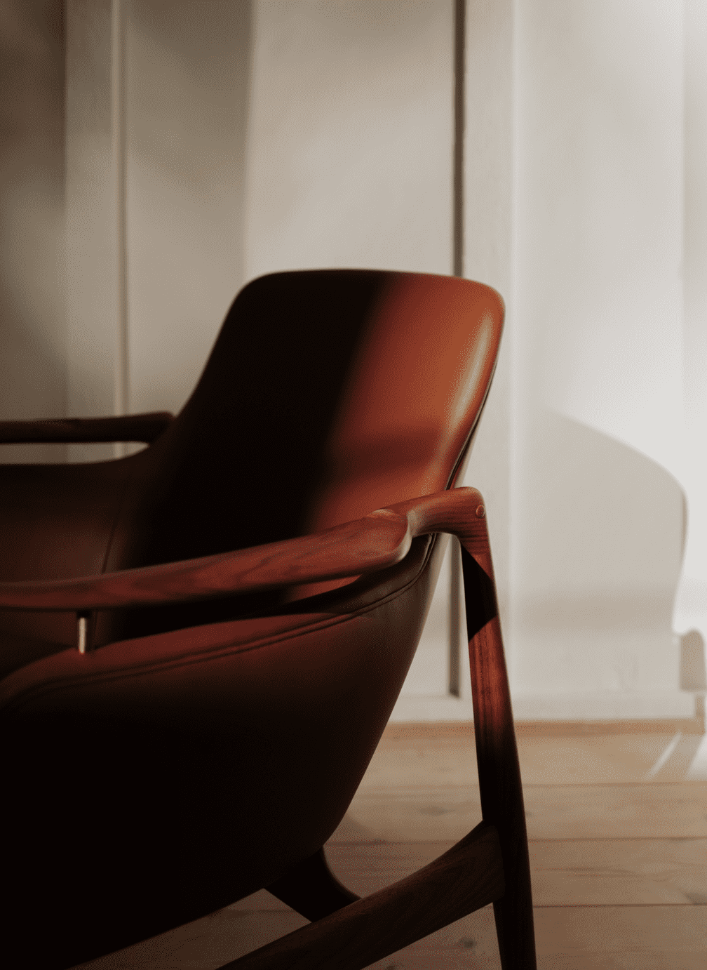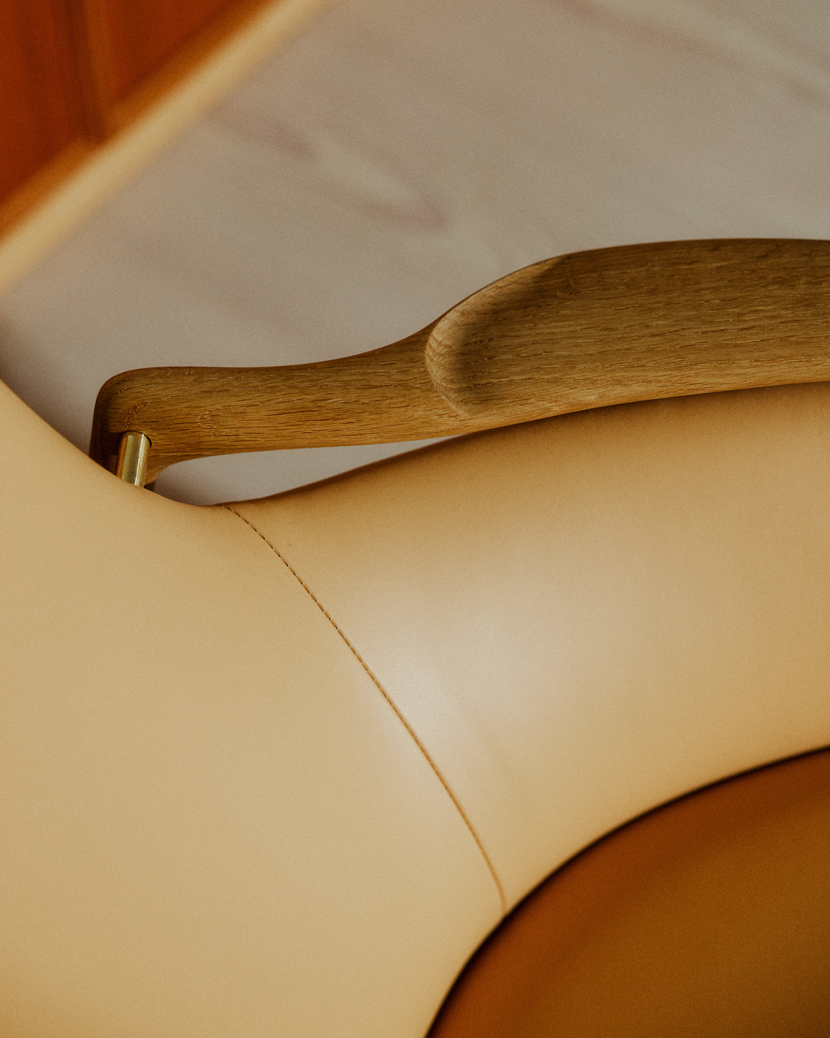 FJ 53 er et ekstravagant møbel, hvor træstolens lethed og elegance forenes med et polstret korpus, der omfavner kroppen med en markant og indbydende komfort. Finn Juhls karakteristiske greb – adskillelsen mellem det bærende og det bårne – kommer tydeligt til udtryk i FJ 53, her udført i en endnu mere raffineret og elegant udgave end tidligere. Bagbenene, udført i eg olie og helt frigjort fra polstringen, rejser sig smukt fra gulvet og fortsætter i én ubrudt bevægelse, hvor de drejer ud i et organisk formet armlæn med næsten dyrisk karakter. Armlænet svæver let hen over polstringen og afsluttes i en blød, let opadgående spids, der næsten inviterer til berøring.