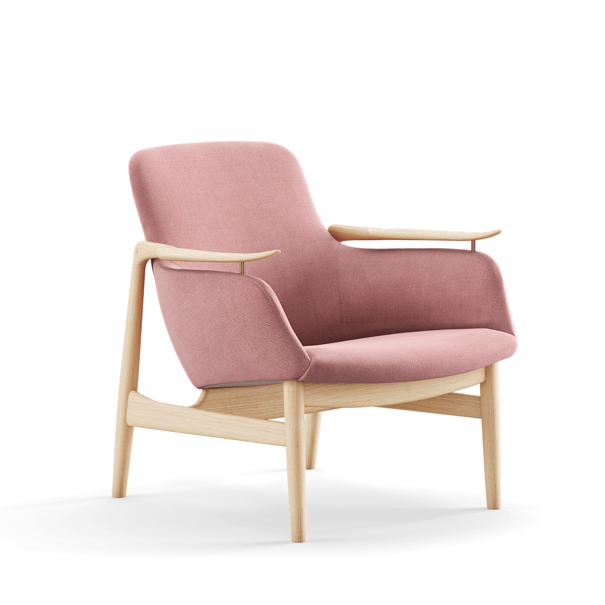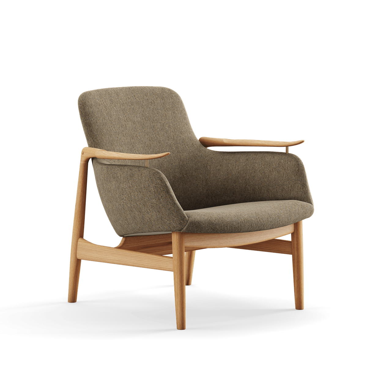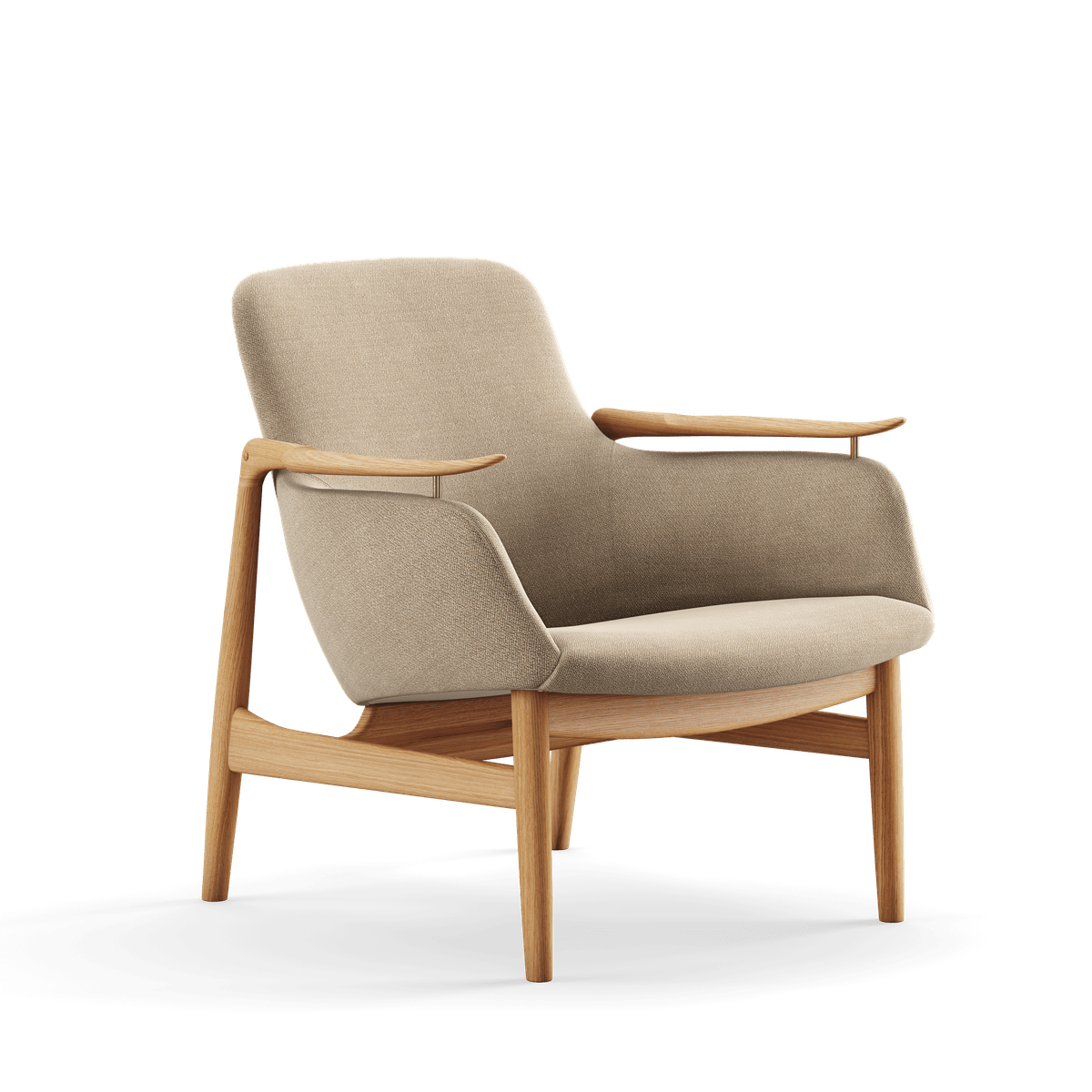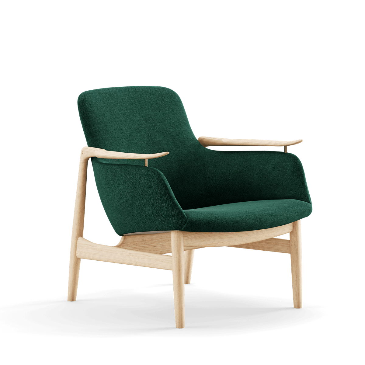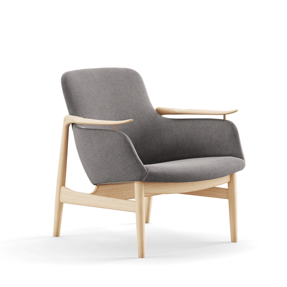 I varianten med stel i eg klar olie står træets lyse og naturlige udtryk skarpt frem. Bagbenene er helt fritlagte fra polstringen og rejser sig fra gulvet i en organisk, ubrudt bevægelse, der fortsætter ud i armlænet. Det formede armlæn hviler let svævende over polstringen og afsluttes i en blød, svagt opadgående spids, der næsten kalder på at blive rørt ved.