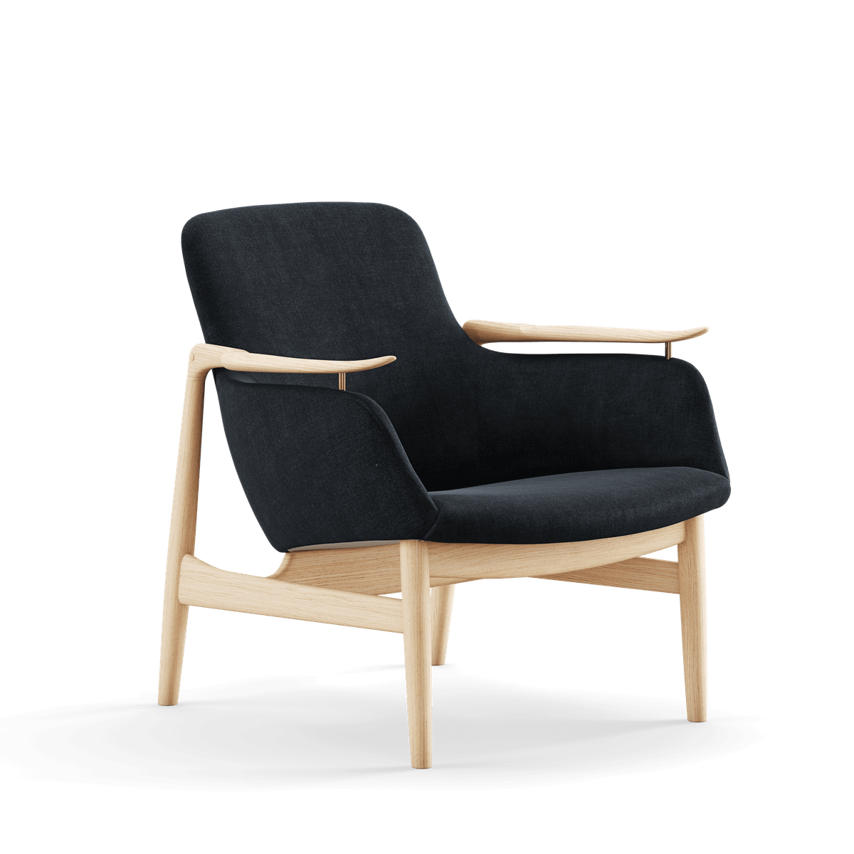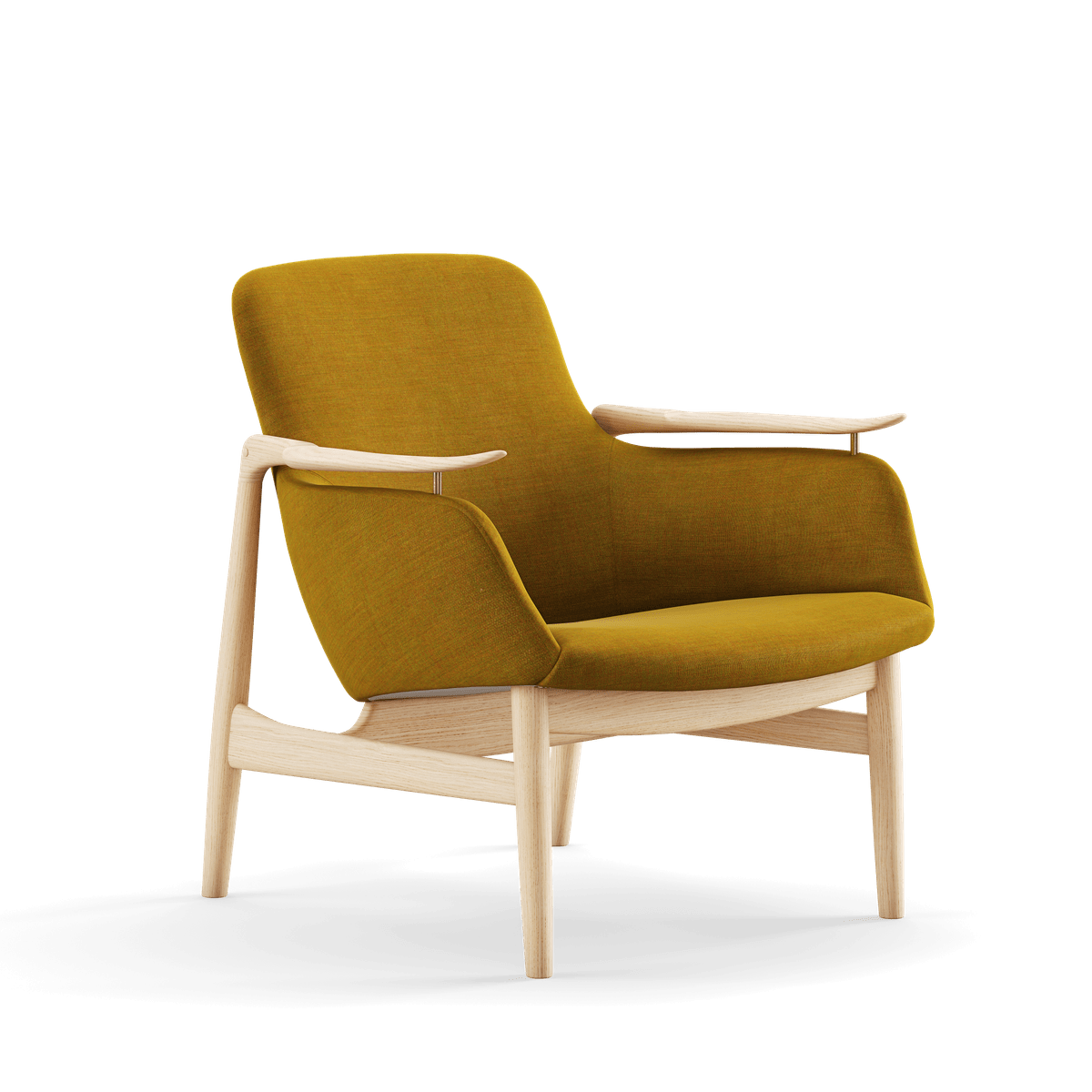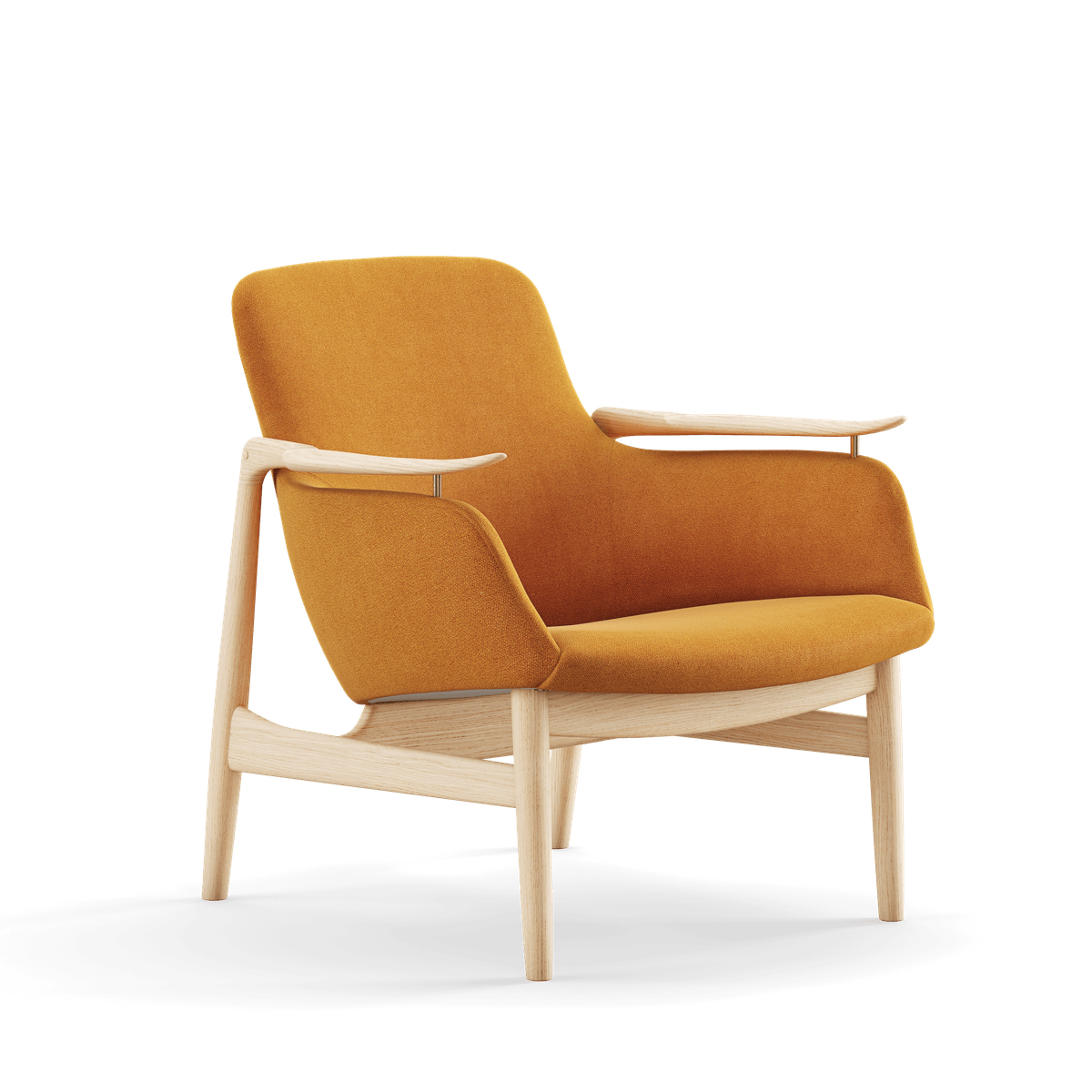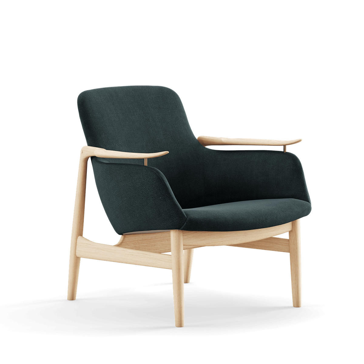 I varianten med stel i eg klar olie står træets lyse og naturlige udtryk skarpt frem. Bagbenene er helt fritlagte fra polstringen og rejser sig fra gulvet i en organisk, ubrudt bevægelse, der fortsætter ud i armlænet. Det formede armlæn hviler let svævende over polstringen og afsluttes i en blød, svagt opadgående spids, der næsten kalder på at blive rørt ved.