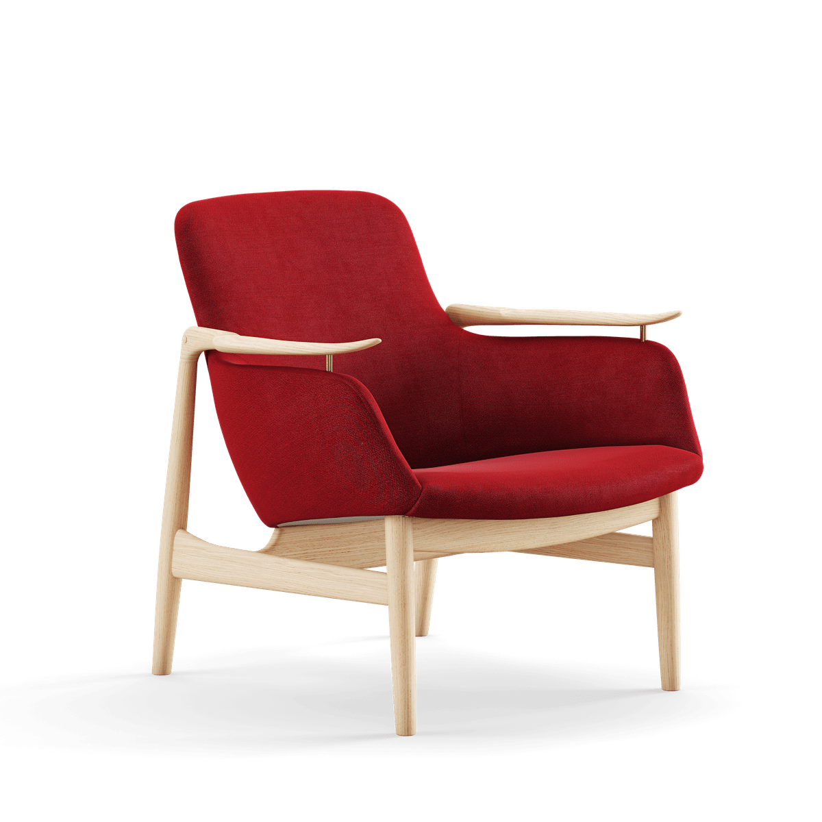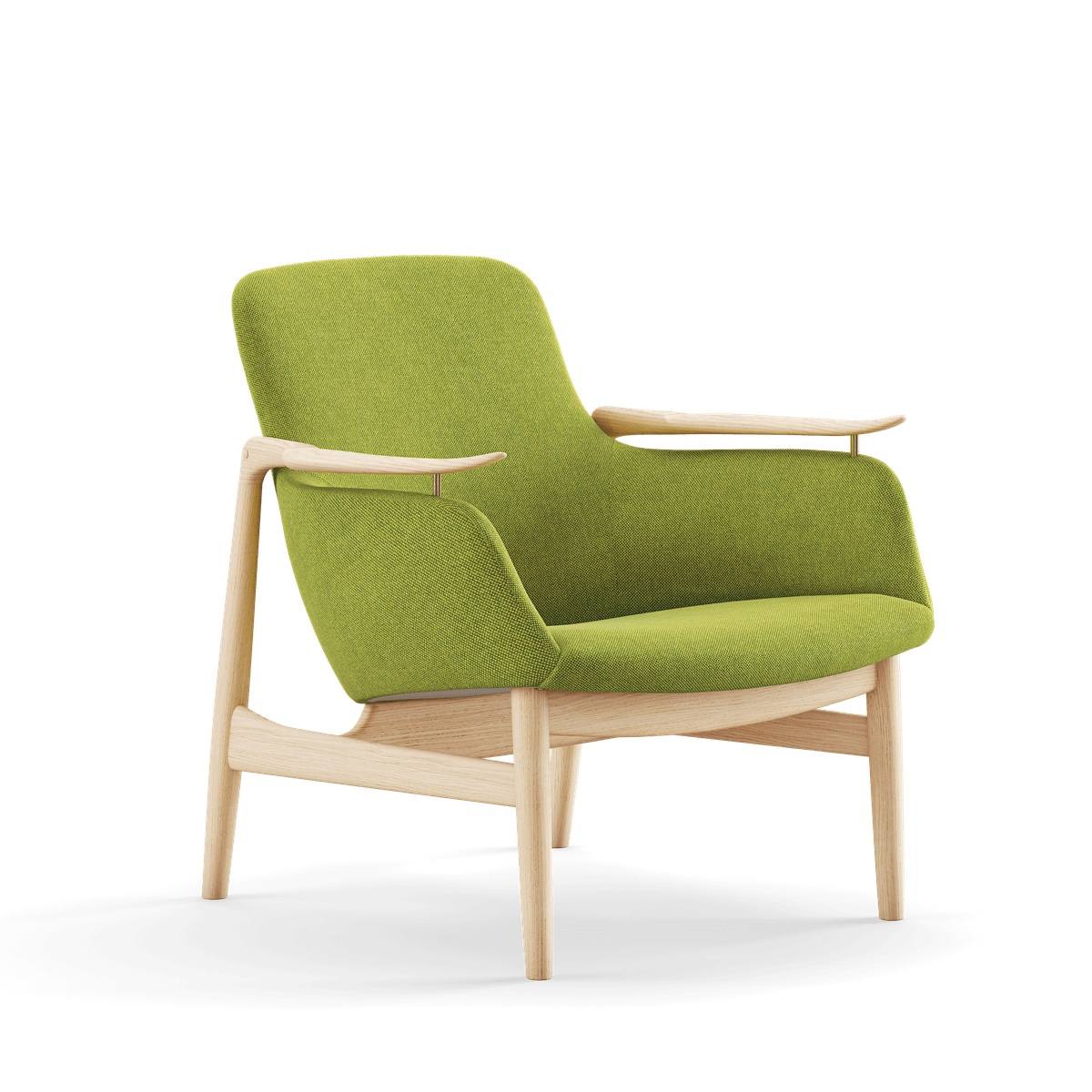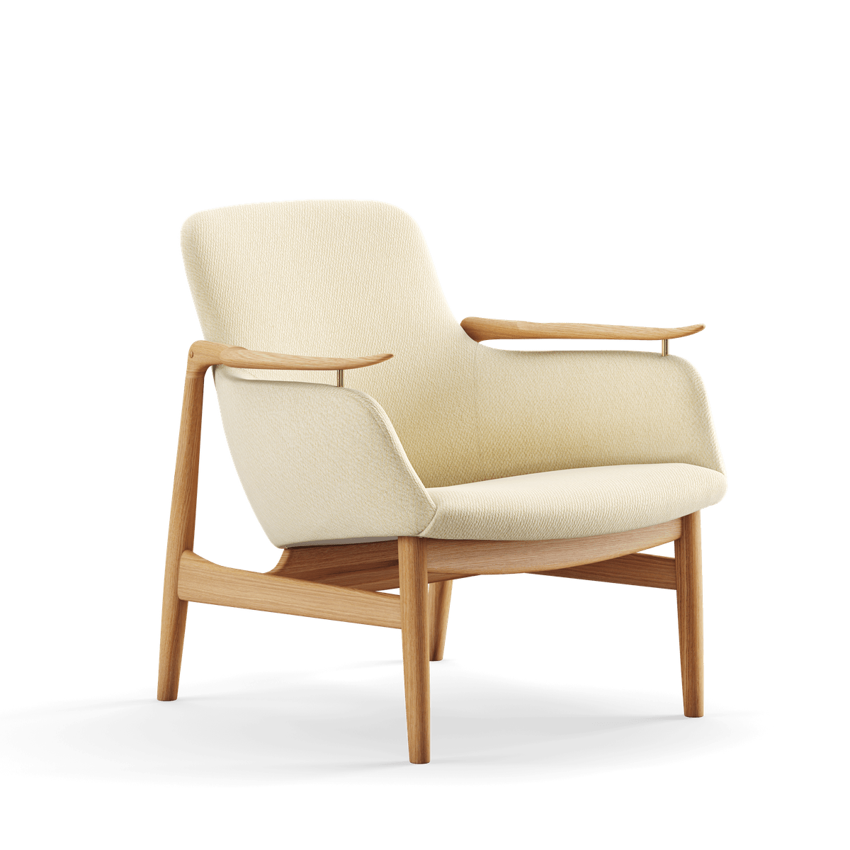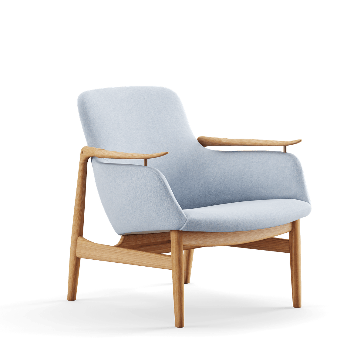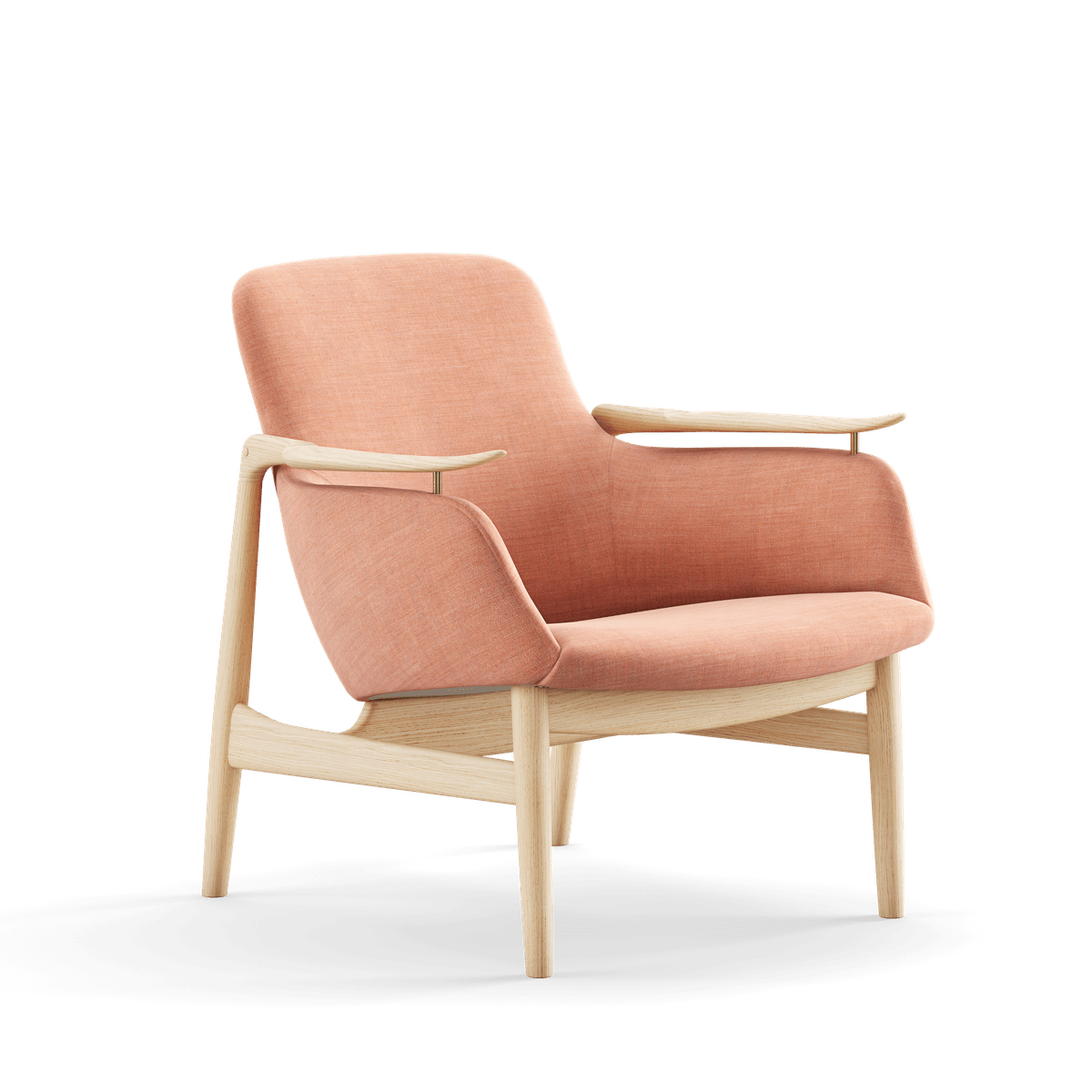 I varianten med stel i eg klar olie står træets lyse og naturlige udtryk skarpt frem. Bagbenene er helt fritlagte fra polstringen og rejser sig fra gulvet i en organisk, ubrudt bevægelse, der fortsætter ud i armlænet. Det formede armlæn hviler let svævende over polstringen og afsluttes i en blød, svagt opadgående spids, der næsten kalder på at blive rørt ved.