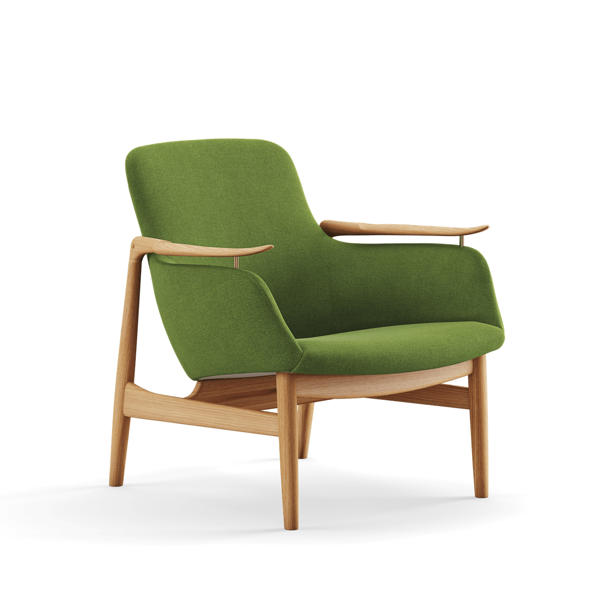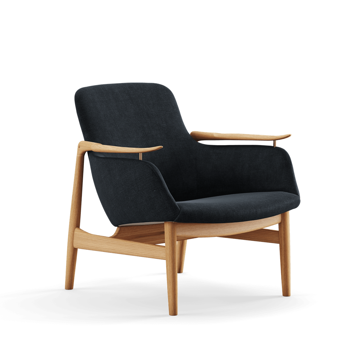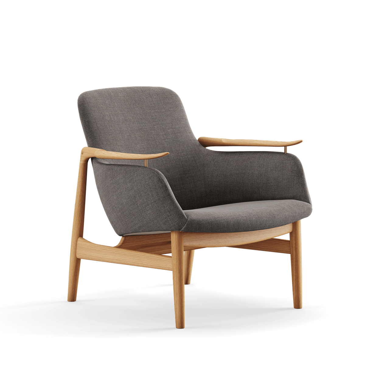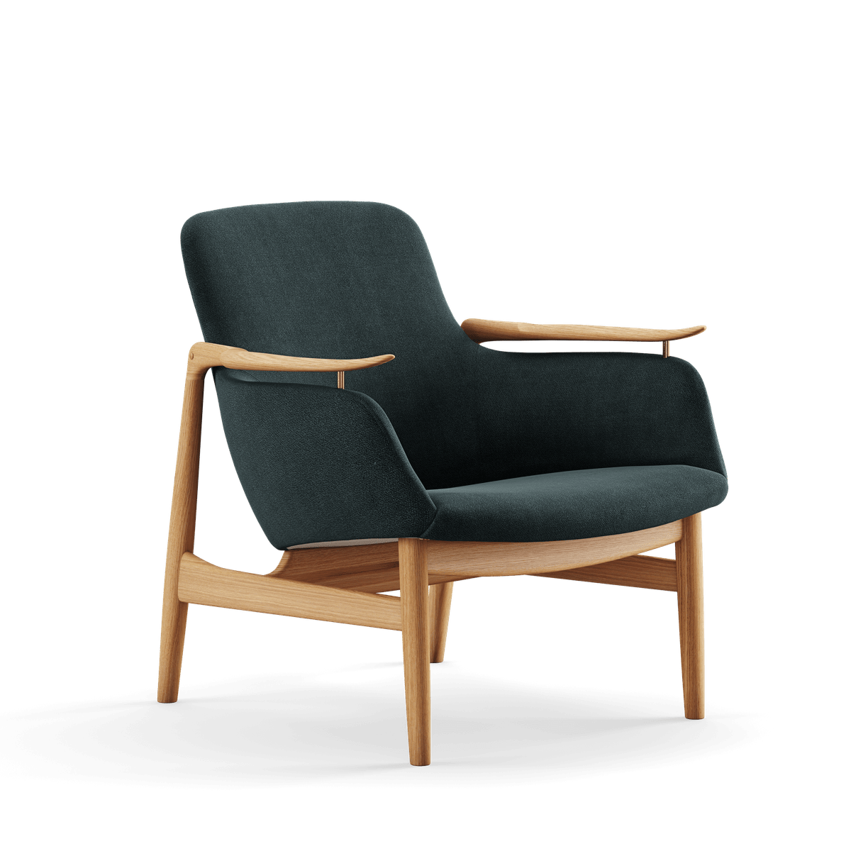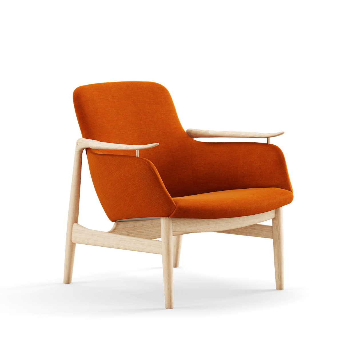I varianten med stel i eg klar olie står træets lyse og naturlige udtryk skarpt frem. Bagbenene er helt fritlagte fra polstringen og rejser sig fra gulvet i en organisk, ubrudt bevægelse, der fortsætter ud i armlænet. Det formede armlæn hviler let svævende over polstringen og afsluttes i en blød, svagt opadgående spids, der næsten kalder på at blive rørt ved.