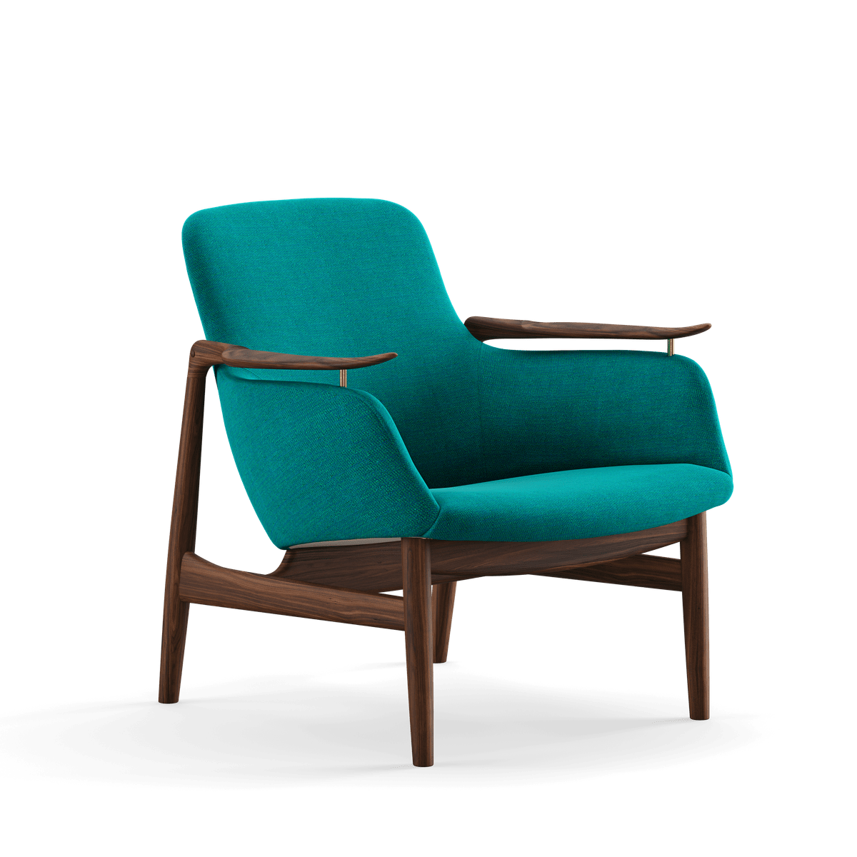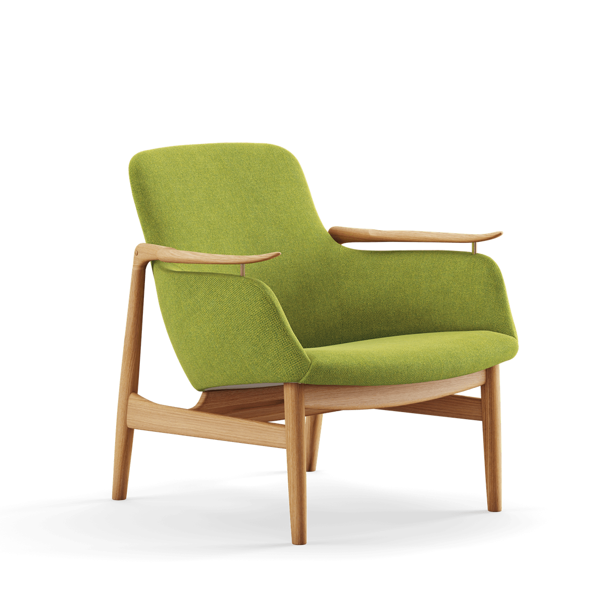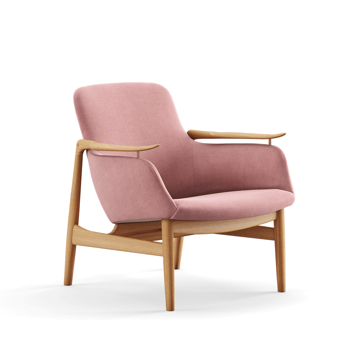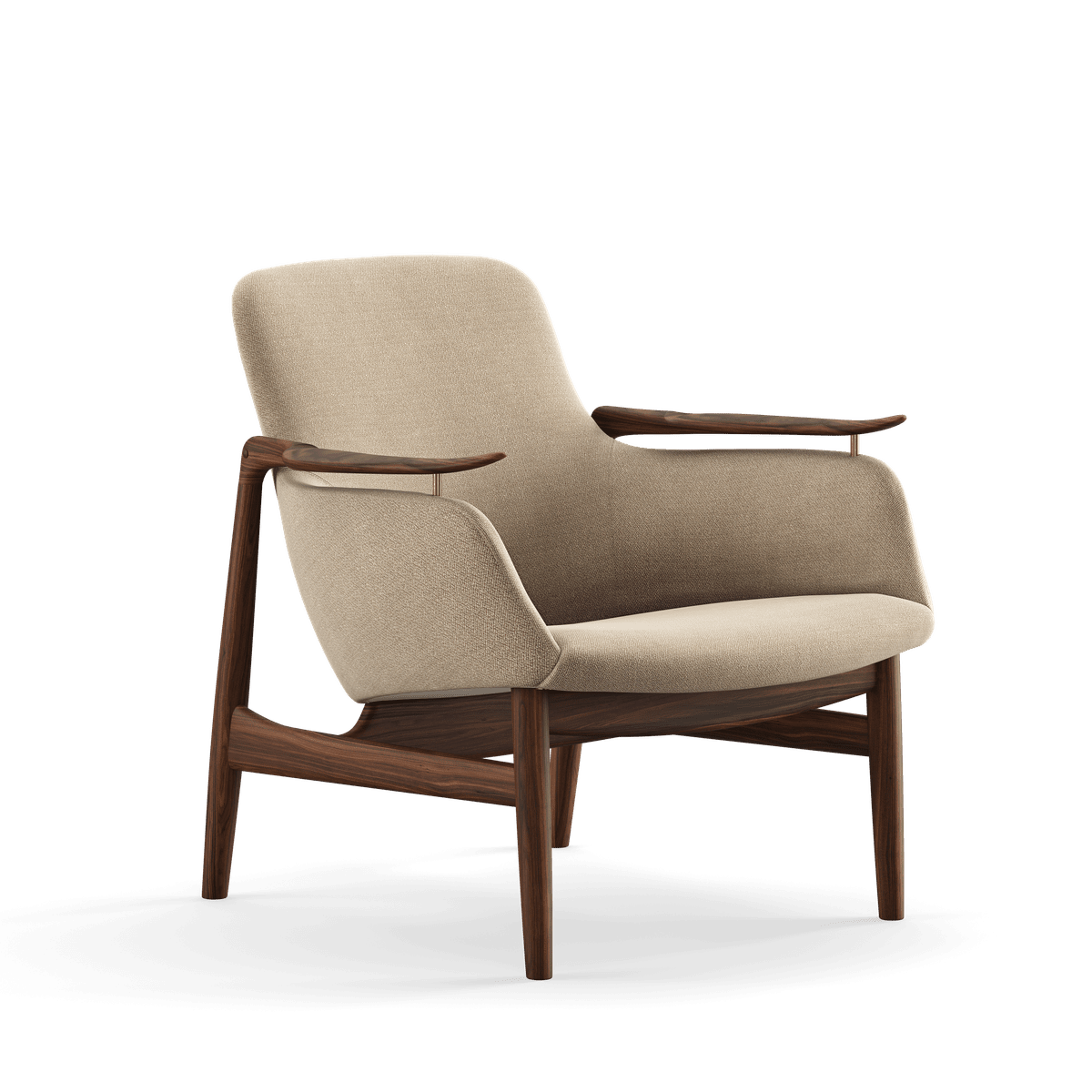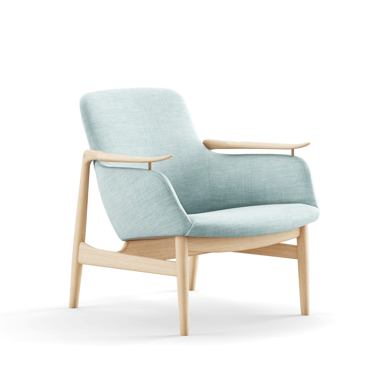 FJ 53 præsenterer sig som et ekstravagant møbel, hvor den klassiske træstols lethed kombineres med et polstret korpus, der giver en omsluttende og behagelig komfort. Finn Juhls særlige designprincip – den tydelige adskillelse mellem det bærende og det bårne – er smukt videreført i FJ 53 og udført med en særlig finesse, der tilfører møblet en let og elegant fremtoning.