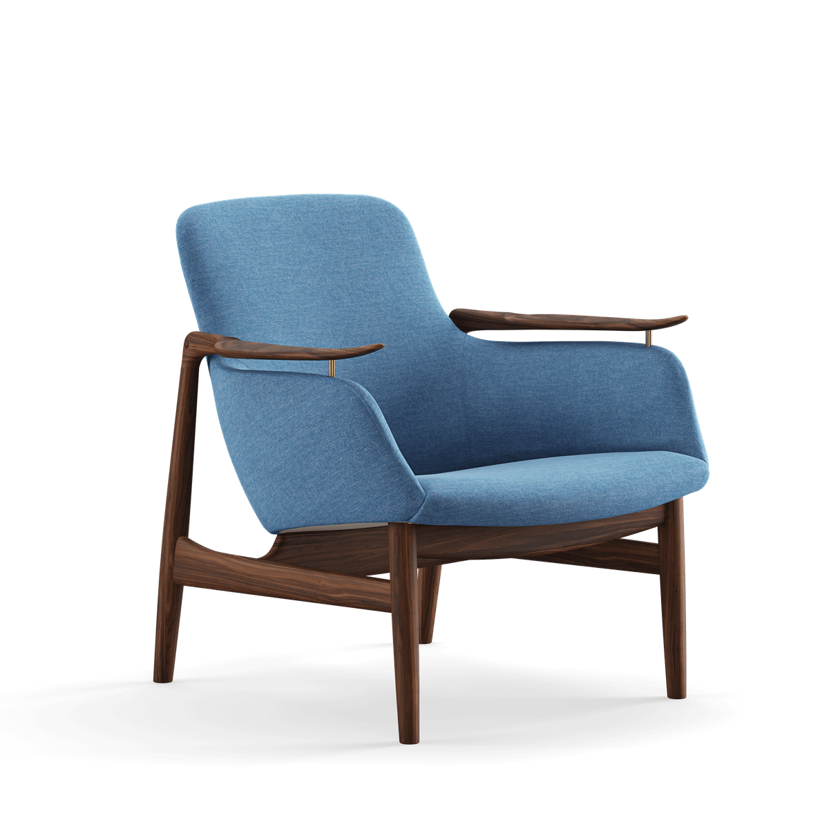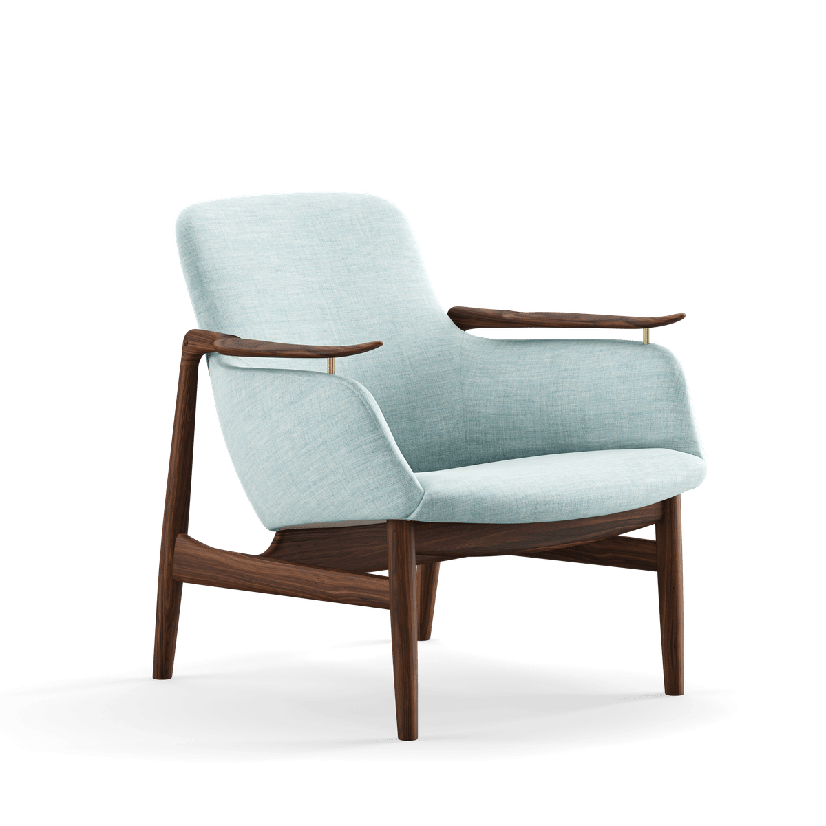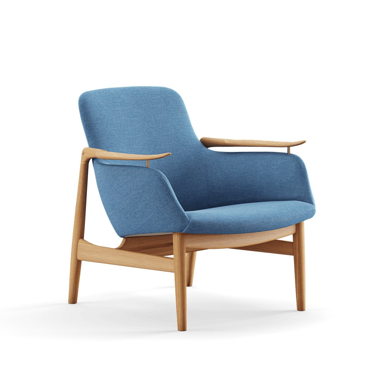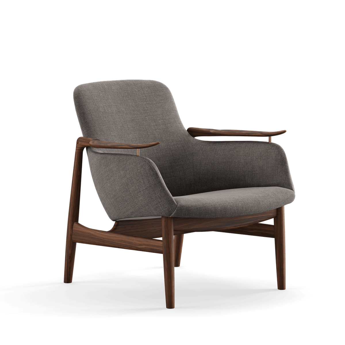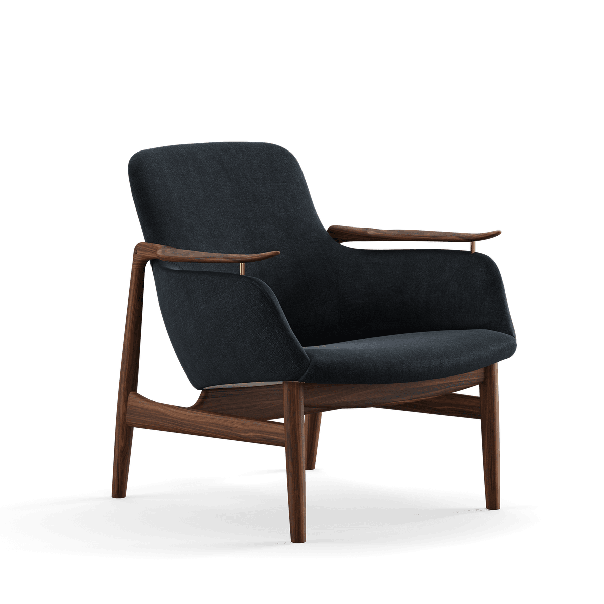 FJ 53 præsenterer sig som et ekstravagant møbel, hvor den klassiske træstols lethed kombineres med et polstret korpus, der giver en omsluttende og behagelig komfort. Finn Juhls særlige designprincip – den tydelige adskillelse mellem det bærende og det bårne – er smukt videreført i FJ 53 og udført med en særlig finesse, der tilfører møblet en let og elegant fremtoning.