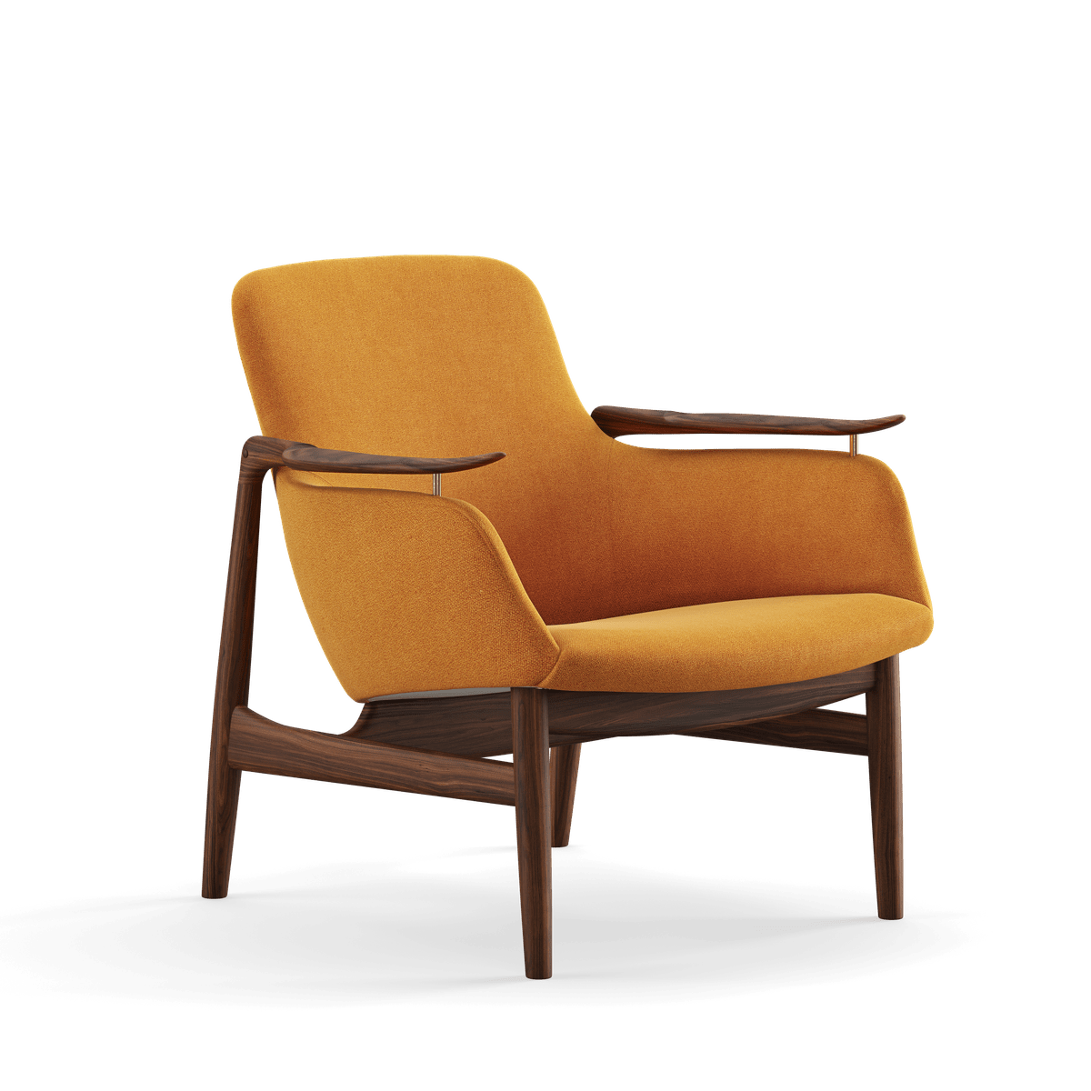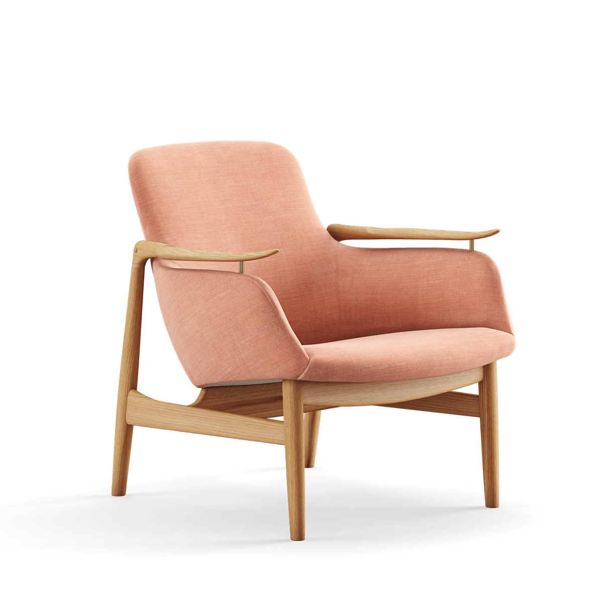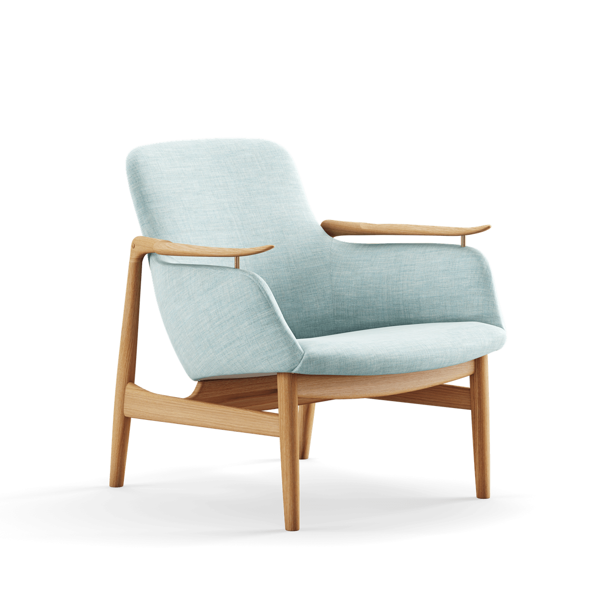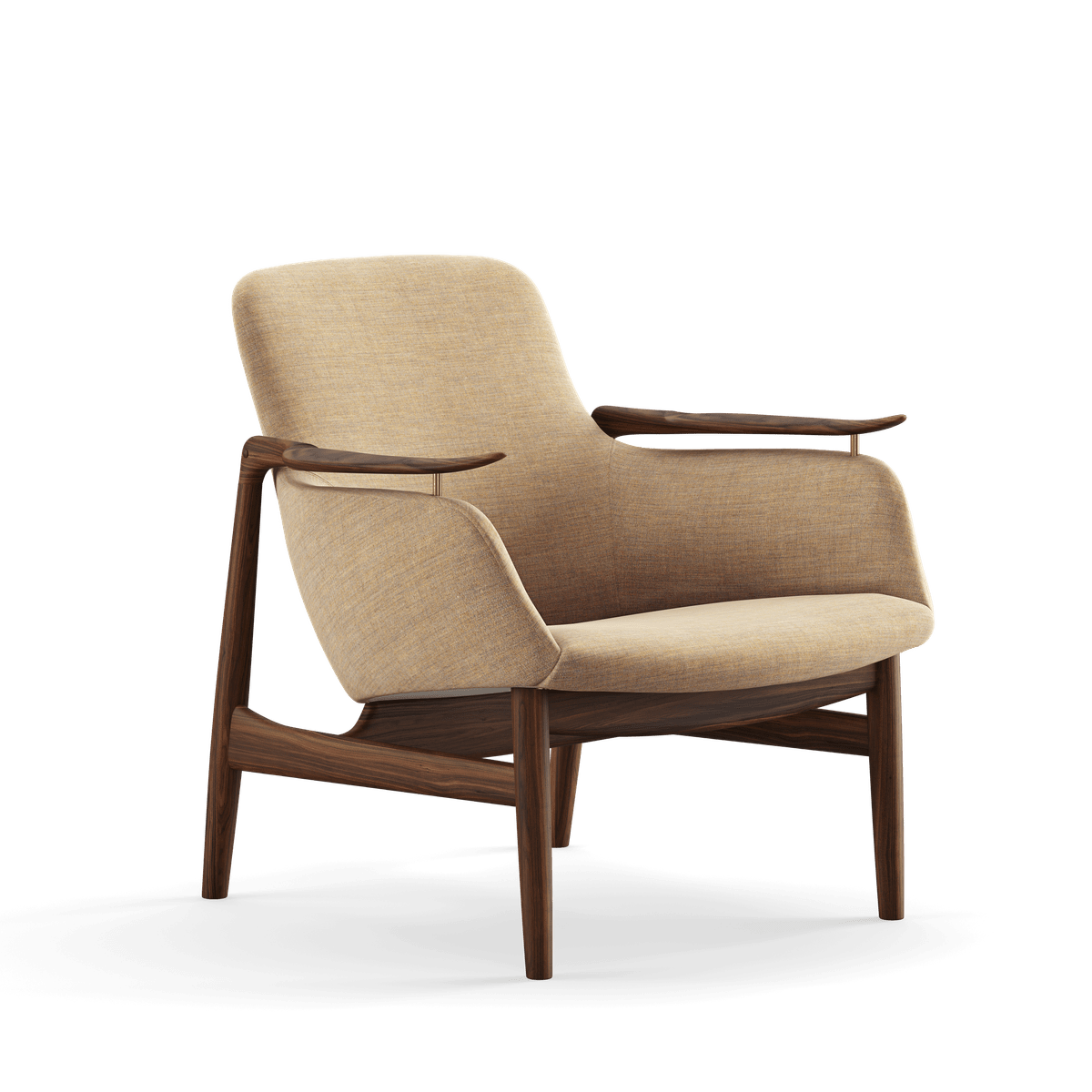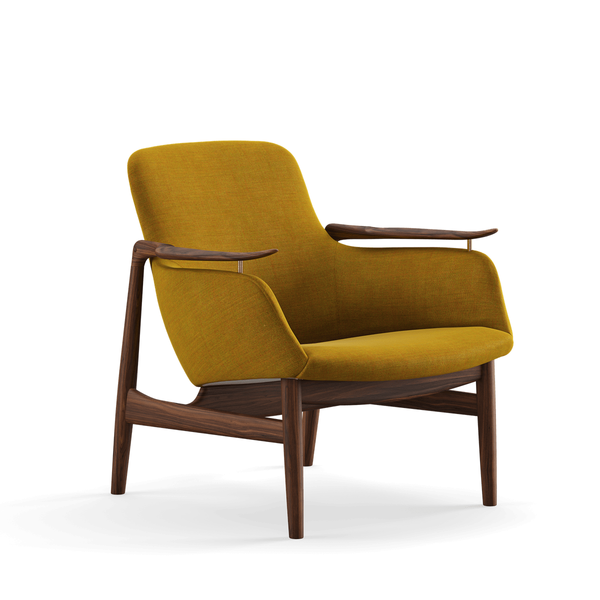 FJ 53 præsenterer sig som et ekstravagant møbel, hvor den klassiske træstols lethed kombineres med et polstret korpus, der giver en omsluttende og behagelig komfort. Finn Juhls særlige designprincip – den tydelige adskillelse mellem det bærende og det bårne – er smukt videreført i FJ 53 og udført med en særlig finesse, der tilfører møblet en let og elegant fremtoning.