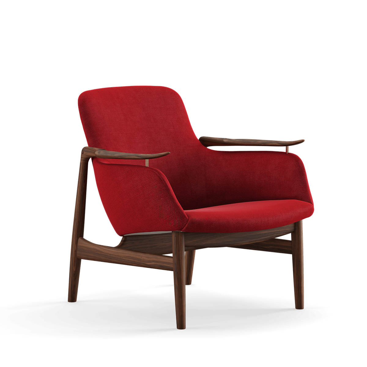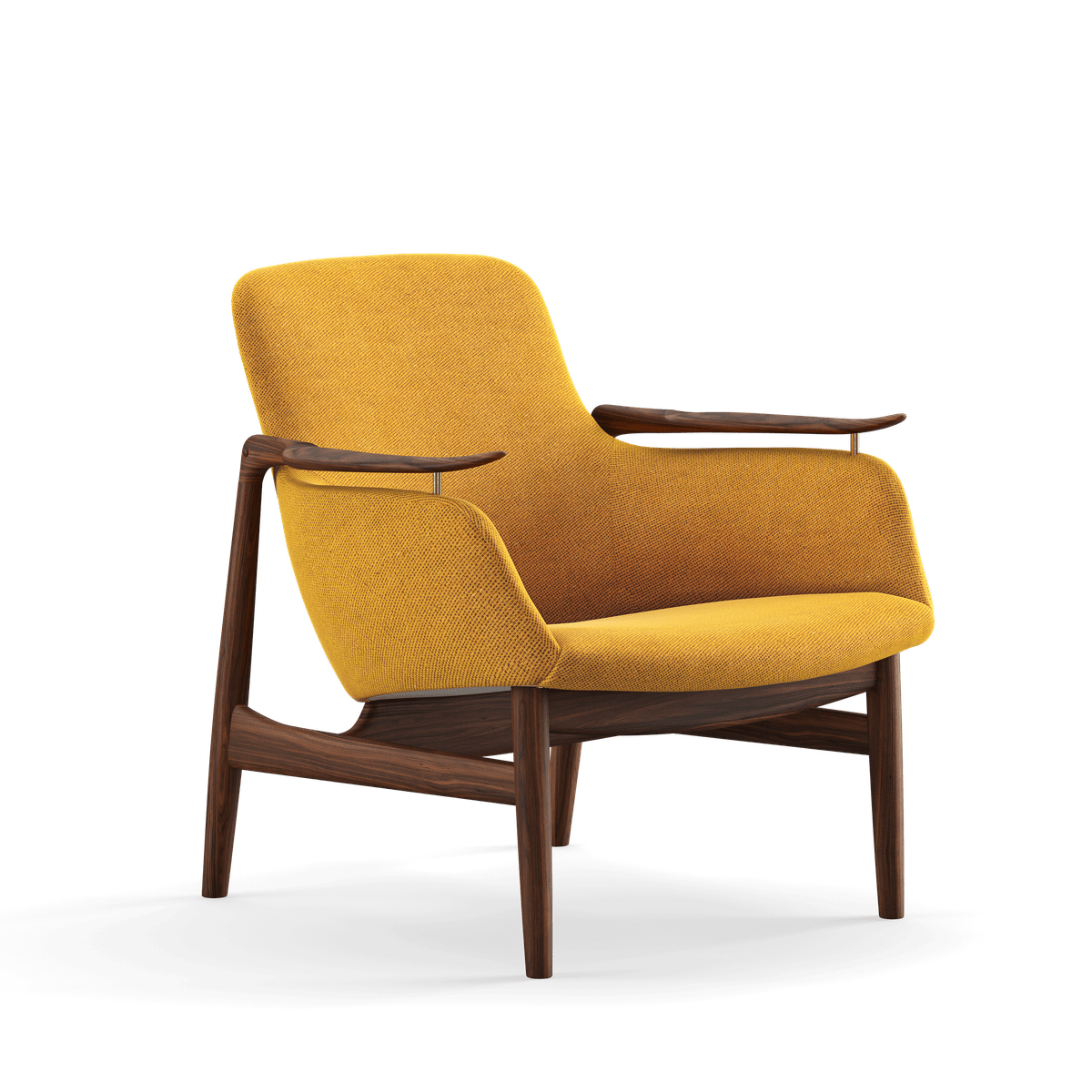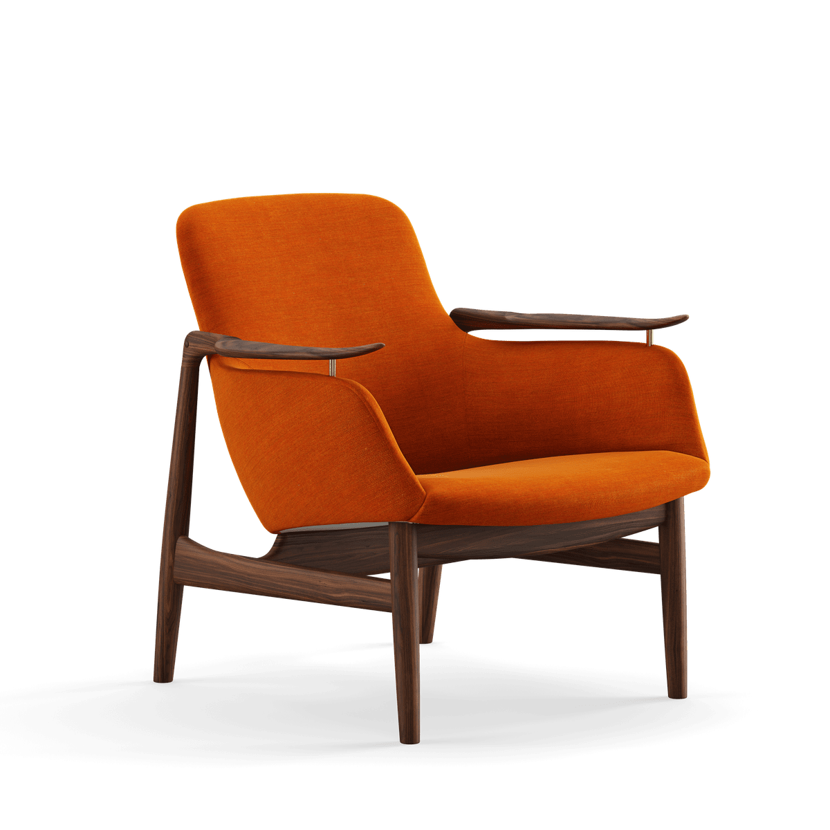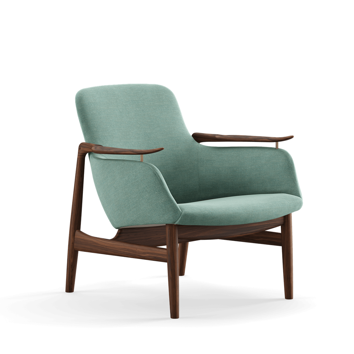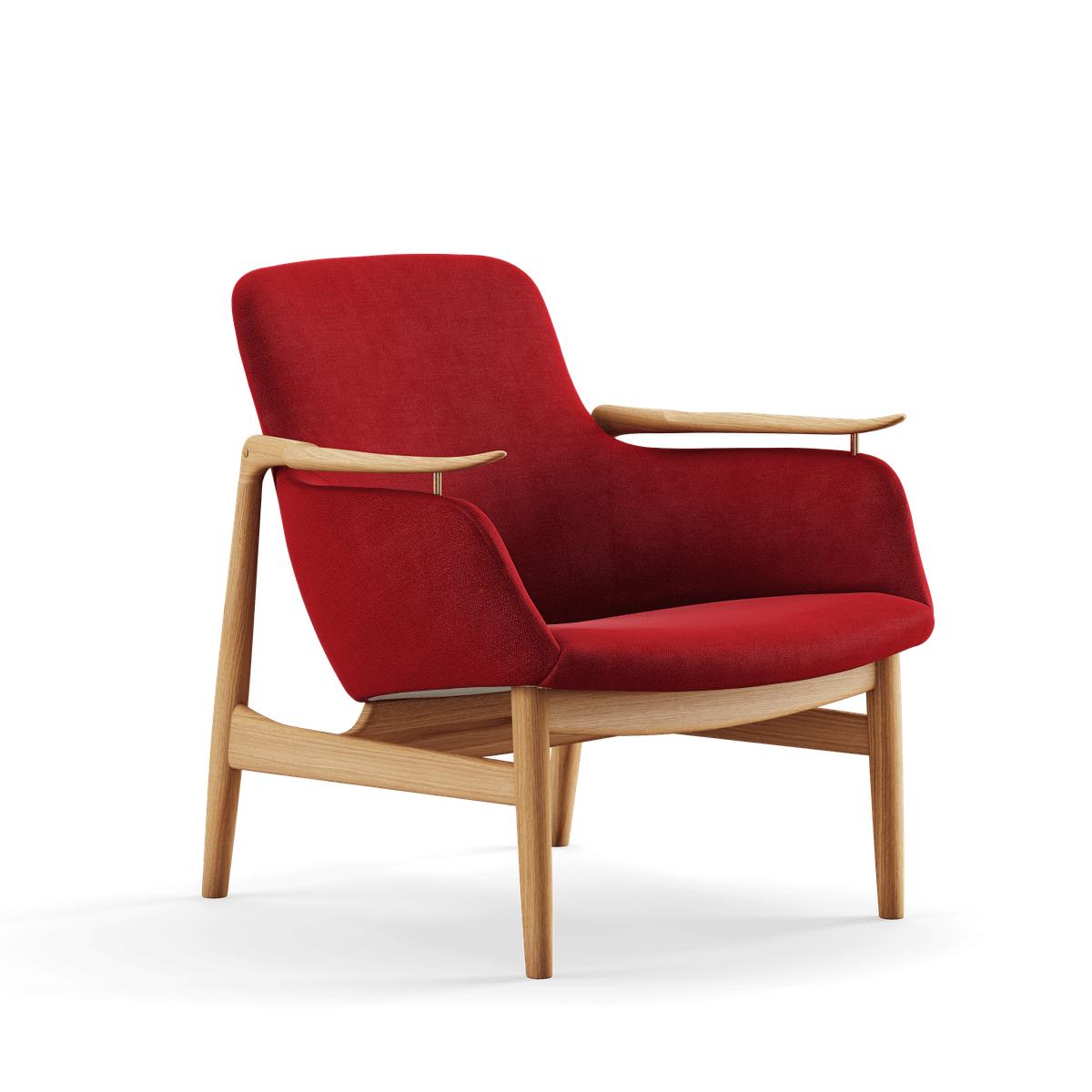 FJ 53 præsenterer sig som et ekstravagant møbel, hvor den klassiske træstols lethed kombineres med et polstret korpus, der giver en omsluttende og behagelig komfort. Finn Juhls særlige designprincip – den tydelige adskillelse mellem det bærende og det bårne – er smukt videreført i FJ 53 og udført med en særlig finesse, der tilfører møblet en let og elegant fremtoning.