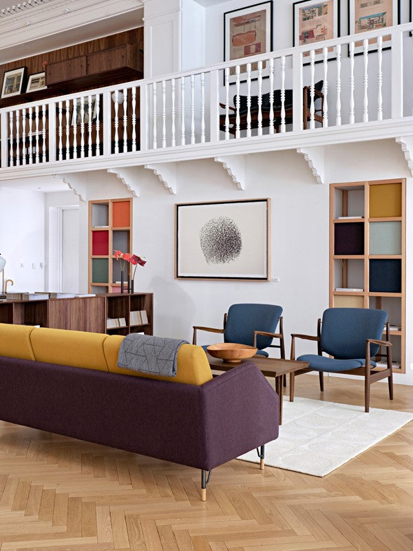 Her får du Finn Juhls ikoniske 77 Sofa i tresædet udgave, klædt i tekstil og løftet elegant på slanke ben med træfødder i valnød. Sofaens stringente linjer og flydende proportioner giver et roligt, arkitektonisk udtryk, som passer perfekt til moderne rum med luft og lys. Det faste sæde og de løse ryghynder, begge med springindlæg, giver en behagelig, varig komfort, mens den håndværksmæssige finish i dansk produktion sikrer et møbel, der holder i generationer. 77-serien er født ud af Finn Juhls møde med industrialismens muligheder i 1950’erne, og den kombinerer raffineret polstring med et næsten svævende udtryk. Vælg mellem et bredt udvalg af kvalitetsstoffer og lad de varme valnødsfødder tilføre et naturligt modspil til det brunerede stål.