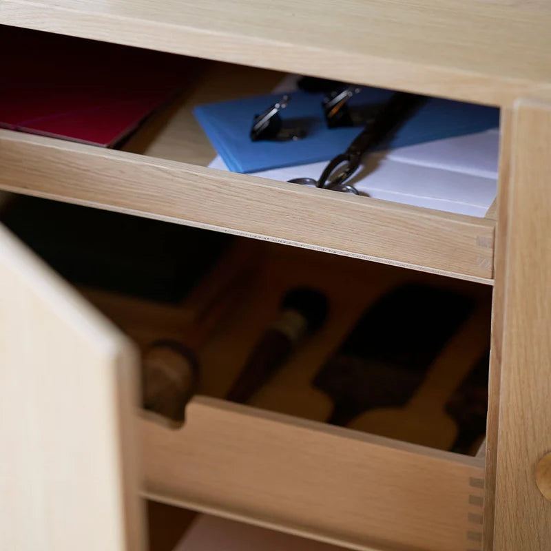 A232 stor skuffe i eg er det funktionelle tilbehør, der gør din A232 skænk endnu mere anvendelig i hverdagen. Børge Mogensen tegnede skænken med idéen om fleksibel indretning, og netop her folder systemtanken sig ud: Den store skuffe glider sikkert ind på skænkens skinner og skaber et overskueligt rum til det, der fortjener en fast plads. Bestik, dækkeservietter og lys i spisestuen, opladere og kabler i stuen, nøgler og småting i entréen eller mapper og tilbehør på hjemmekontoret – alt får orden og ro bag de plane fronter. Materialet er FSC certificeret eg med lakeret overflade, som fremhæver åretegningen og gør plejen let. Frontens rene linjer og de præcise proportioner taler samme formsprog som skænken, så helheden bevarer sit rolige, grafiske udtryk.