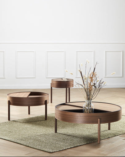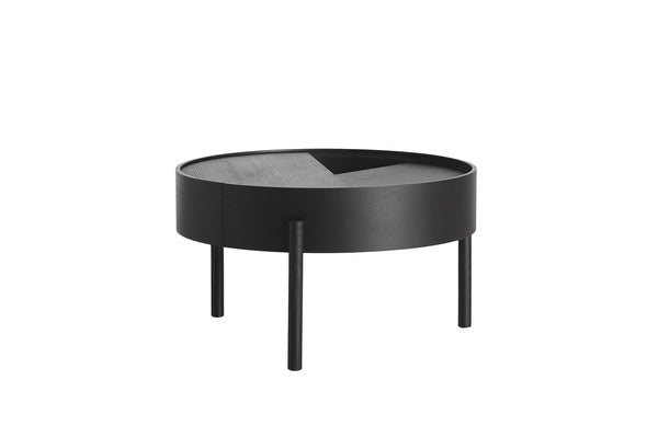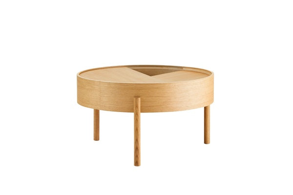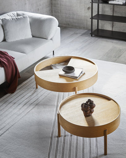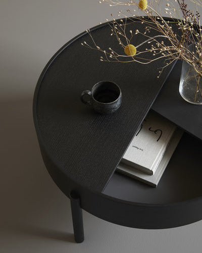 Det smarte Arc sofabord fra Woud har plads til opbevaring under bordpladen, hvor den halve del kan køres til side ind under den anden. Bordet er designet af Julie Begtrup og Ditte Vad og laves i hvidpigmenteret ask, sortmalet ask, olieret eg.