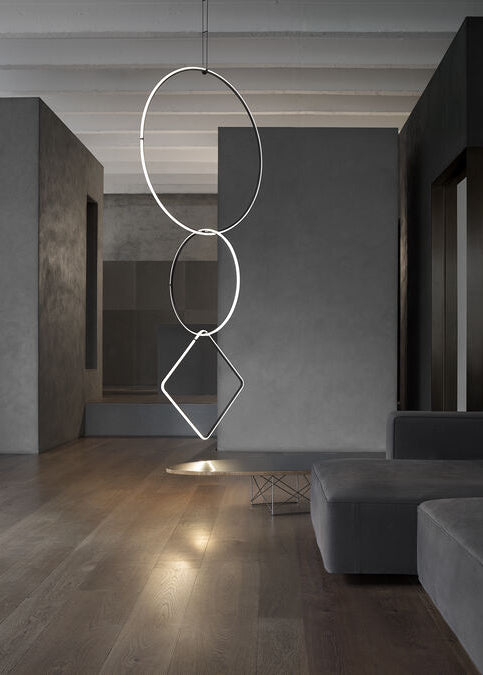 Arrangements 3 fra Flos er en lysskulptur, der føles mere som et smykke i rummet end som en traditionel pendel. De tre geometriske former hænger som en lysende kæde og skaber et roligt, grafisk udtryk, der både kan være ikonisk over spisebordet og elegant i en høj loftshøjde i entré eller stue. Kombinationen Round L, Round M og Square L giver en balanceret komposition med både bløde kurver og skarpe linjer, så lampen får karakter uden at virke tung.
