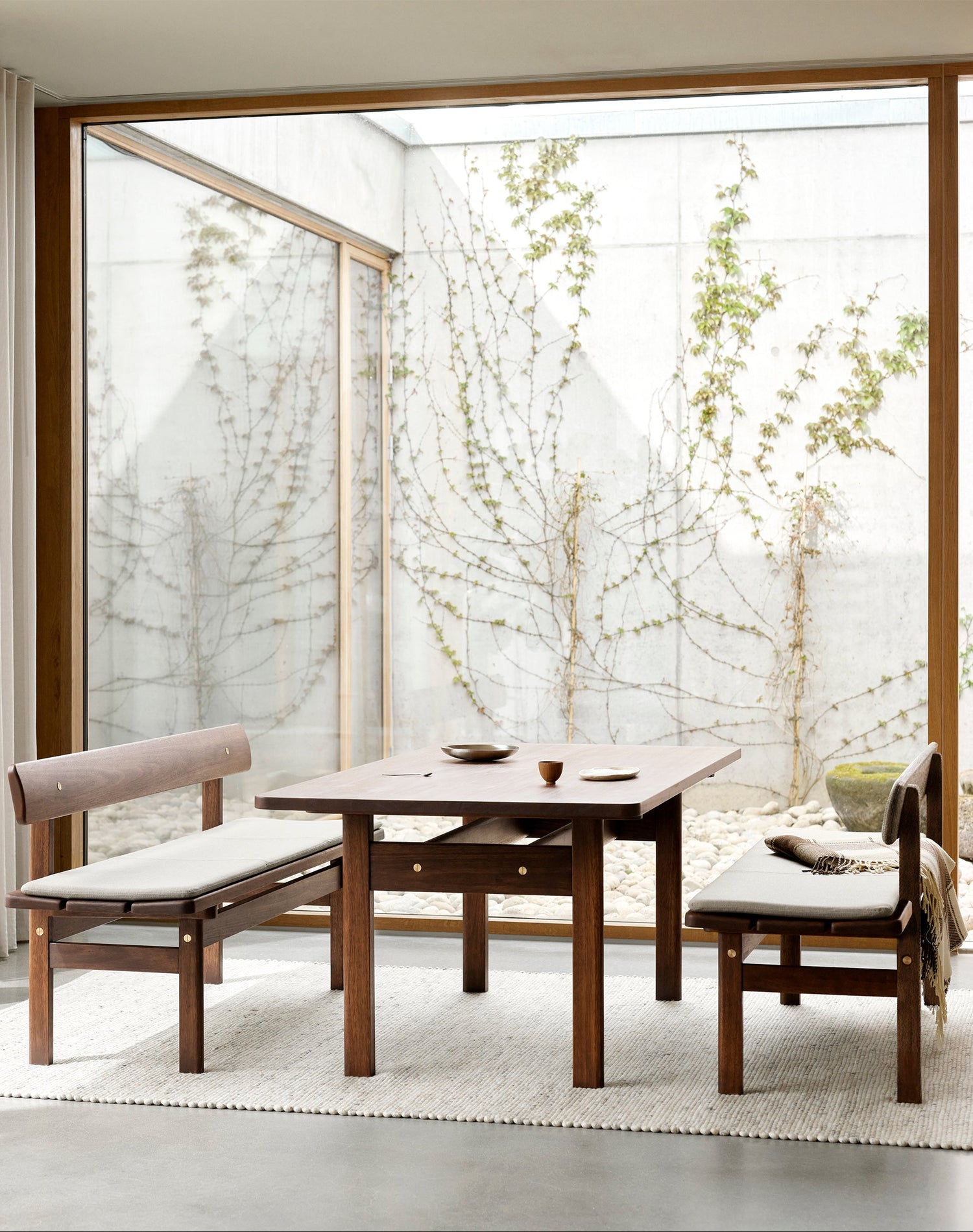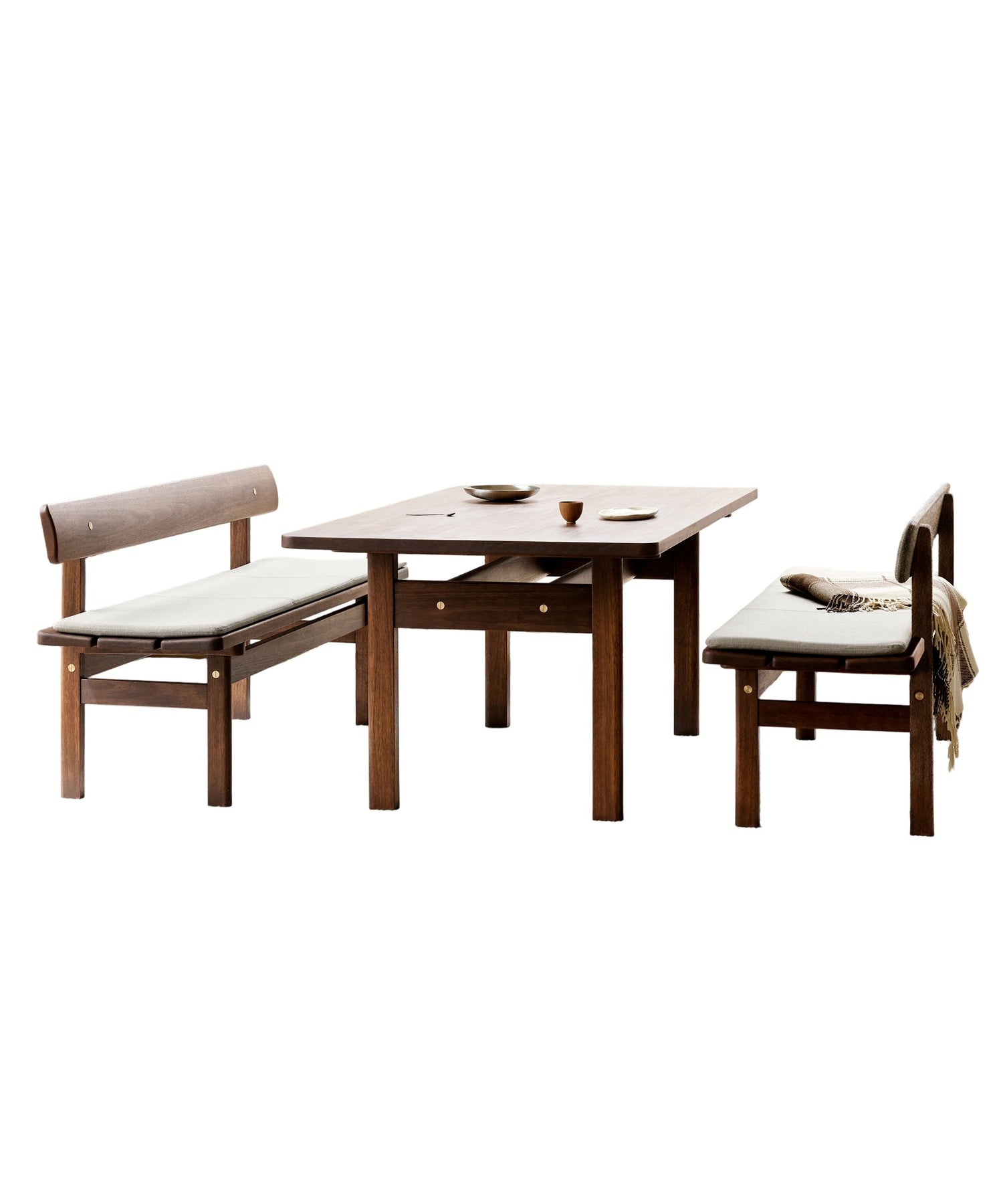 Asserbo sættet forener Børge Mogensens jordnære funktionalitet med en varm, indbydende æstetik. Det solide eukalyptustræ får en smuk glød i den mørkolierede overflade, mens de synlige skruer i børstet messing giver serien et ærligt og robust udtryk. Formen er blødt afrundet og inspireret af Shaker traditionen, skabt i 1961 til Mogensens eget sommerhus i Asserbo. Med bænke og løse sædehynder i slidstærke tekstiler bliver spisemiljøet både fleksibelt og behageligt til hverdag og gæster.