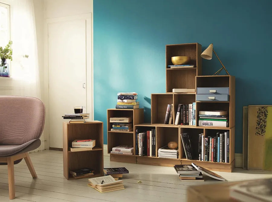 FDB sokler til B98 bogkasserne i massivt egetræ. Reolen er designet af Mogens Koch og laves af FDB Møbler. Der kan laves et pænt reolsystem ved at montere bogkasserne ovenpå soklerne. Køb B98 bogkasserne her