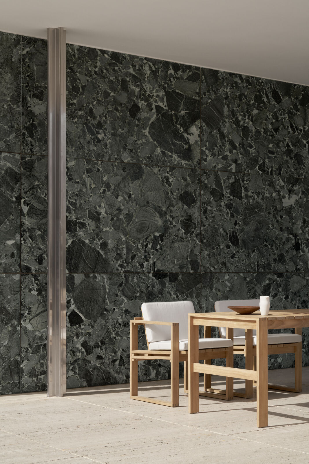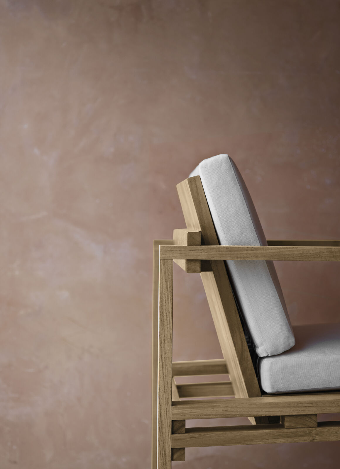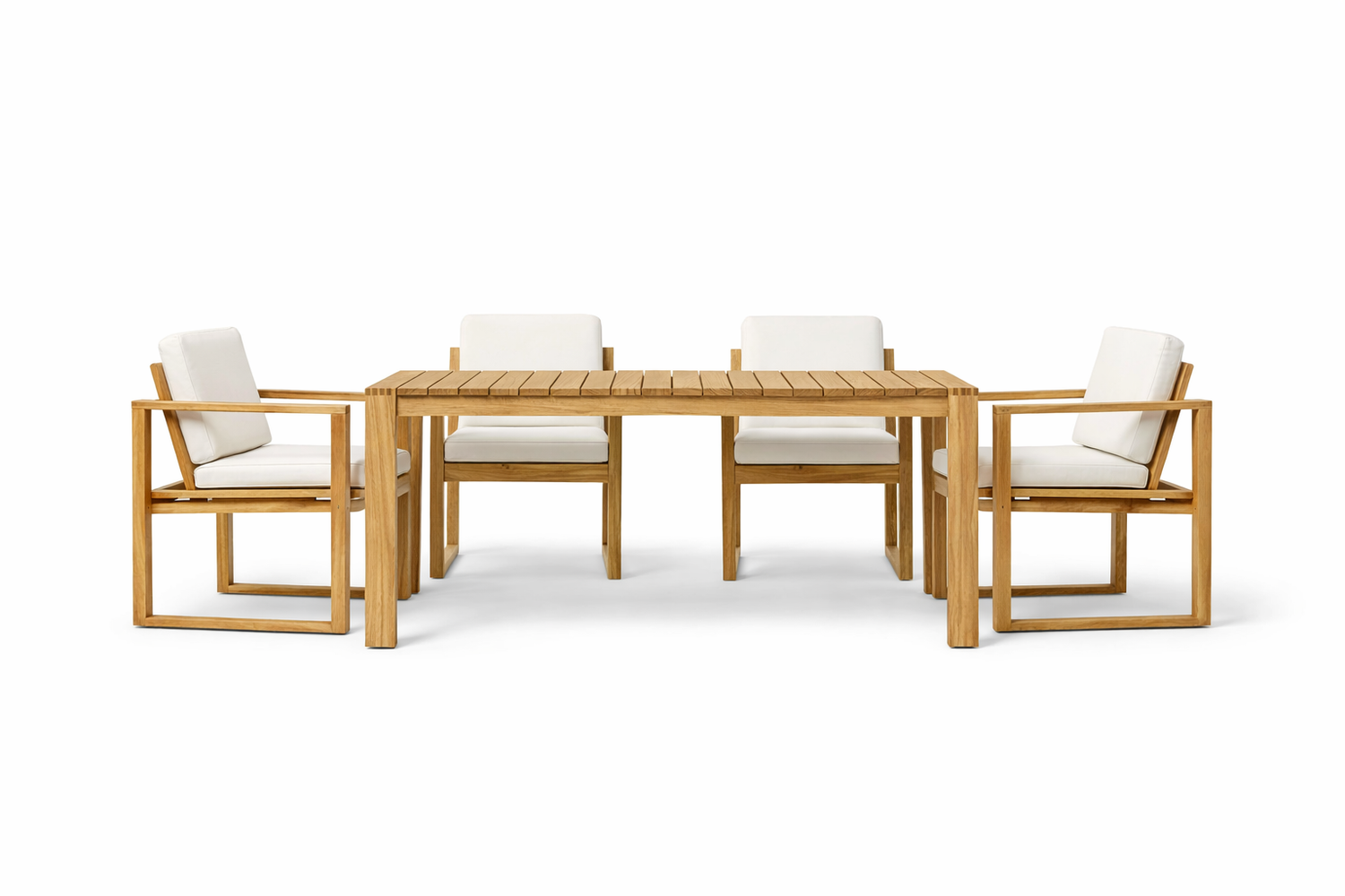 Massiv teak giver sættet en naturlig varme og en rolig eksklusivitet, der kun bliver bedre med tiden. Træet er ubehandlet og udvikler en smuk, sølvgrå patina i vind og vejr, eller du kan bevare den gyldne tone med teakolie eller sealer efter behov. De medfølgende hynder i vejrbestandigt Sunbrella stof gør siddekomforten ekstra indbydende og tilfører et let, afslappet look, som passer perfekt til Bodil Kjærs præcise linjer.