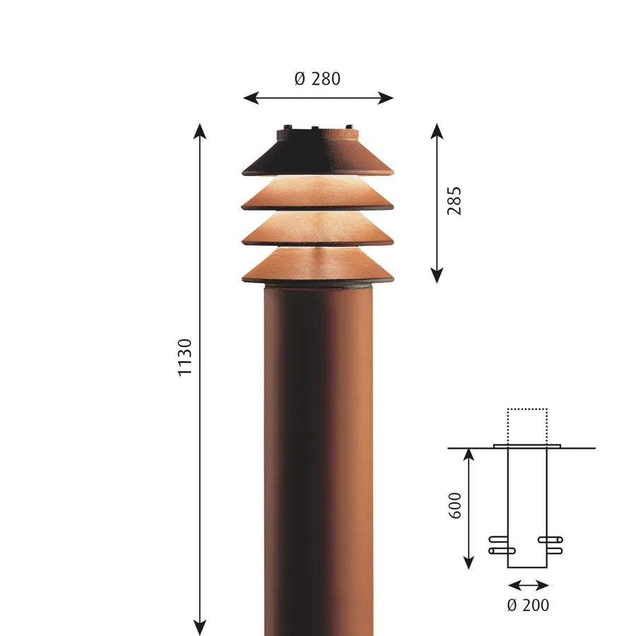 Mål: Højde: 113 cm. Diameter: Ø 28 cm. Lyskilde: LED 3000K 24W, Lumen 696. Materiale: Overflade: Corten stål, rå. Armaturhoved: Støbt jern.