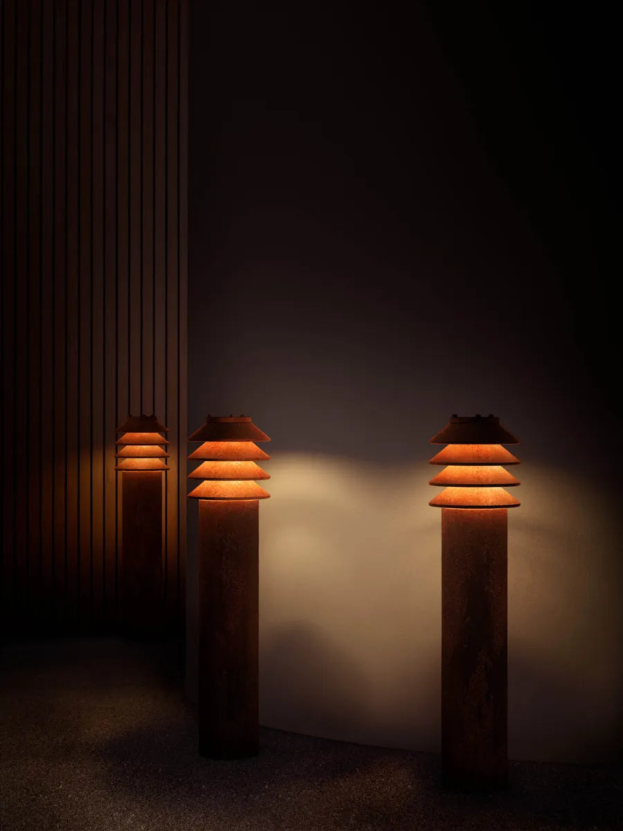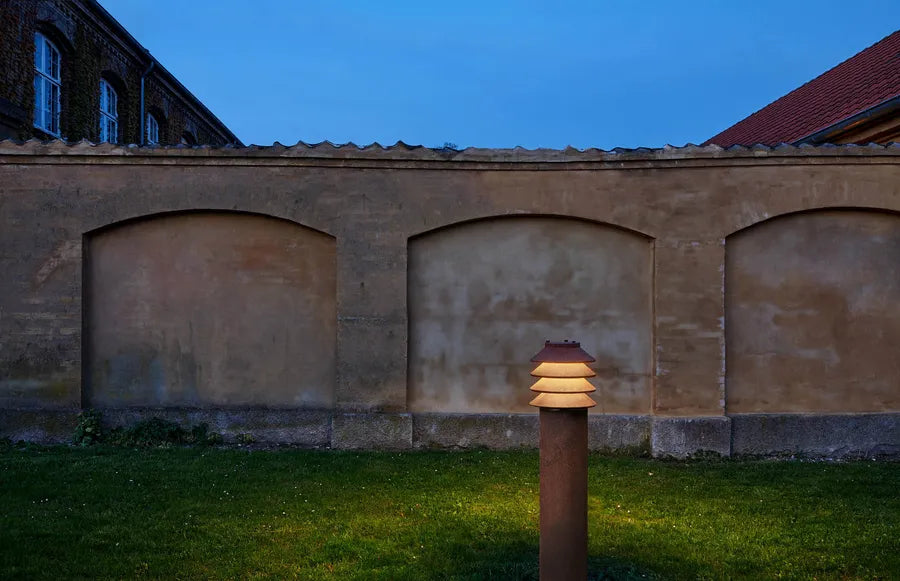 Bysted Pullert er en smuk udendørslampe i cortenstål fra Louis Poulsen. Armaturet udsender et nedadrettet lys. Lamellerne er hvidlakerede på indersiden for bedre at reflektere lyset, og der dannes et markant lysmønster symmetrisk omkring armaturet.