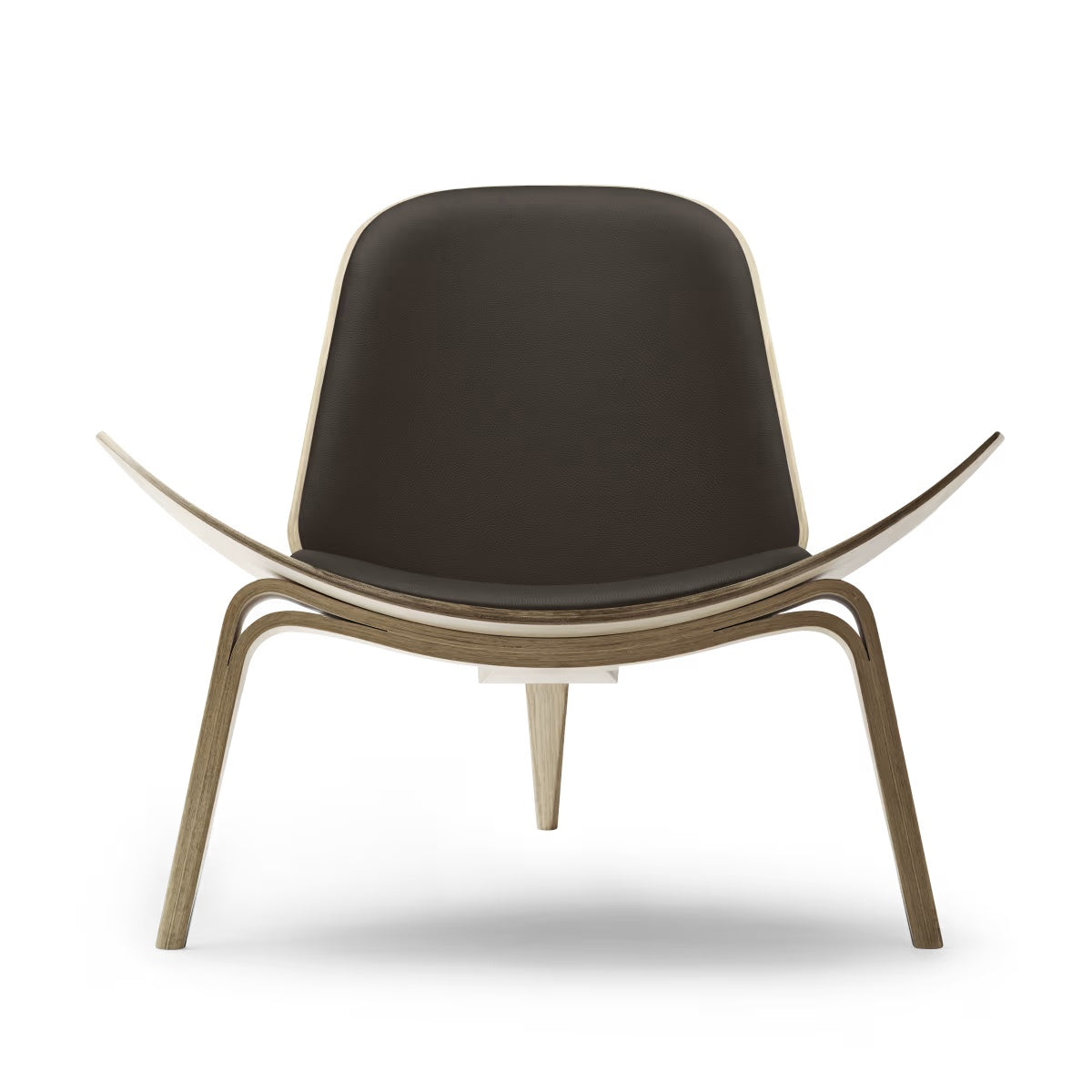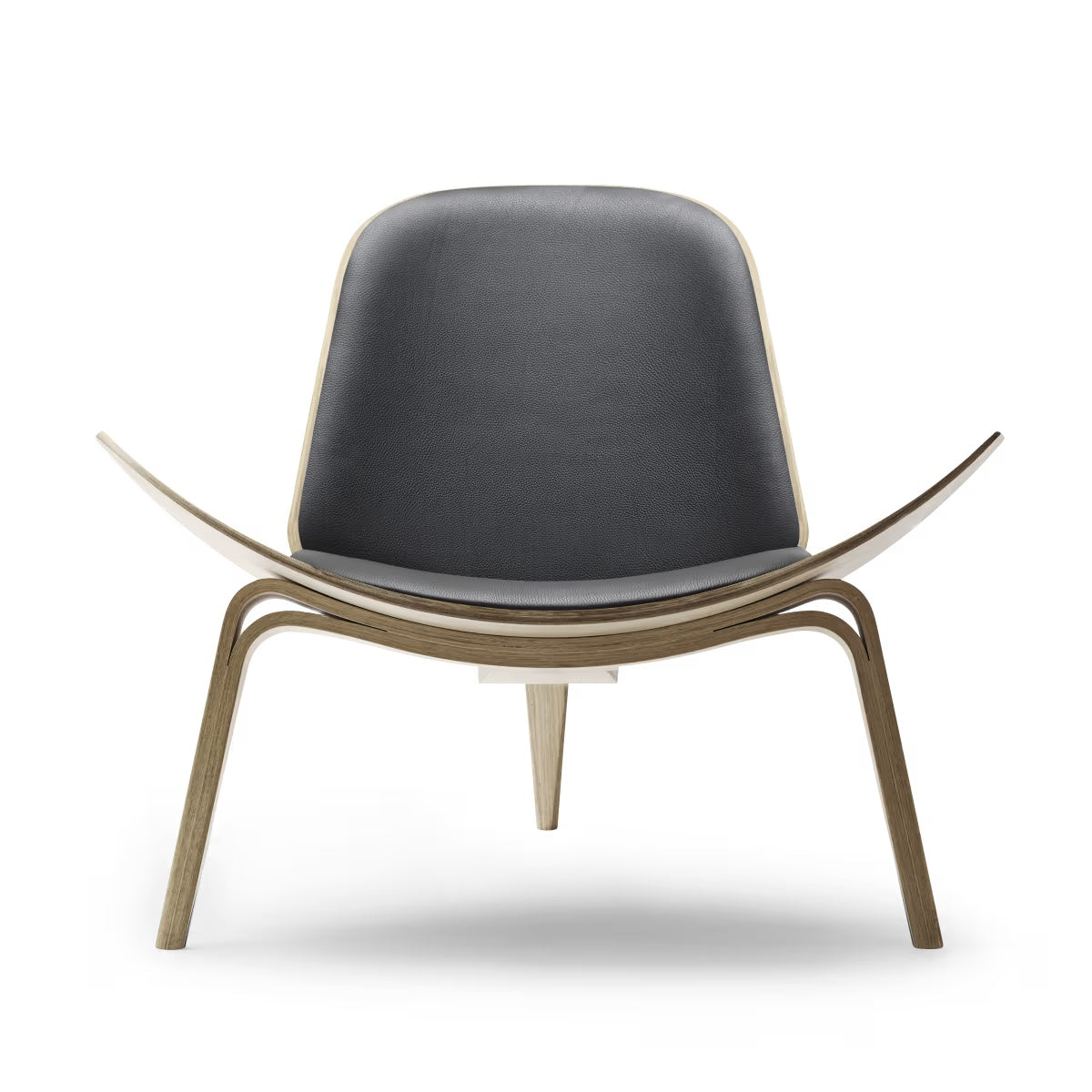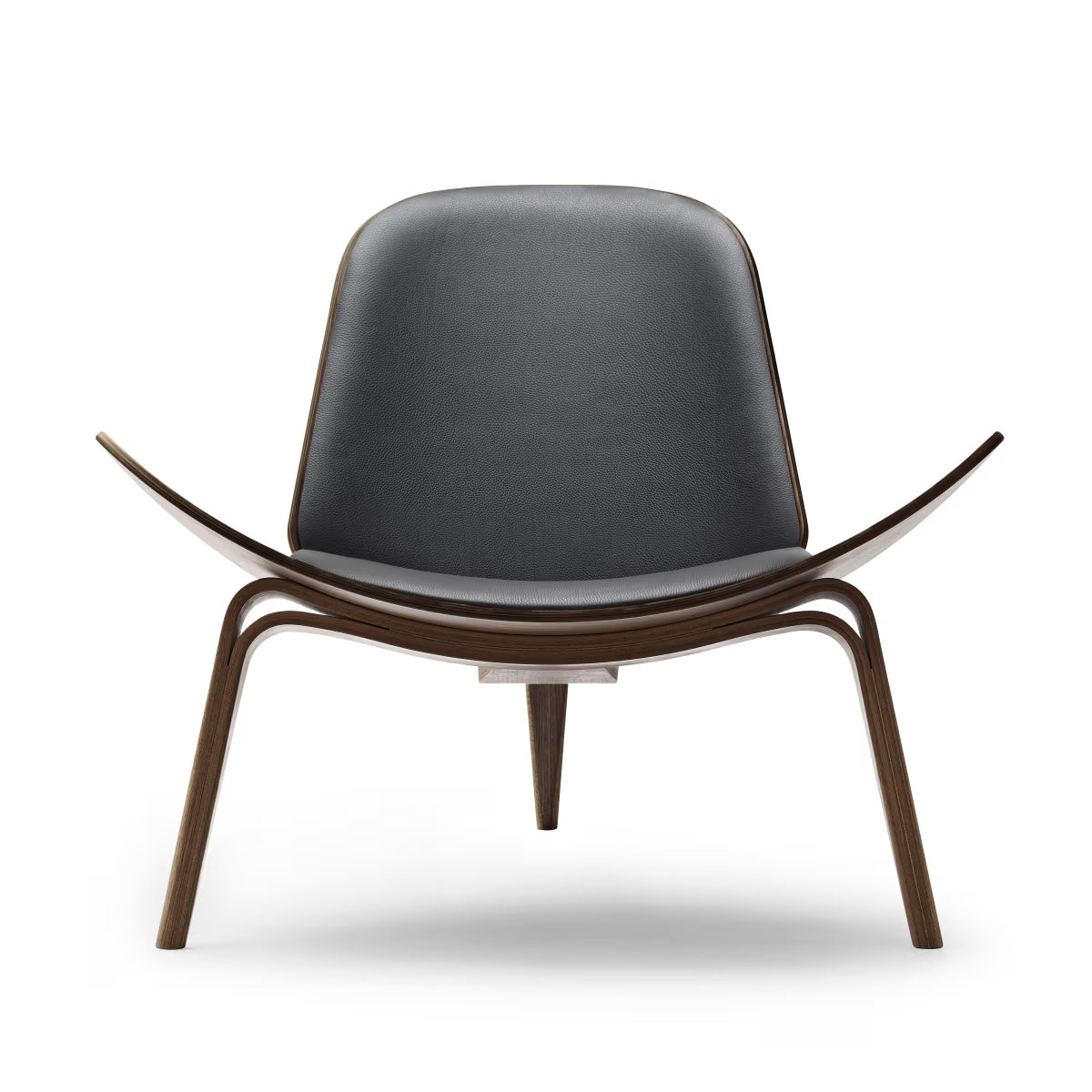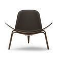 CH07 Skalstolen er Hans J. Wegners ikoniske loungeklassiker, der giver rummet et let og næsten svævende udtryk. De tre elegante, buede ben bærer den karakteristiske skalform, så stolen kan beundres fra alle vinkler, præcis som Wegner ønskede. I denne udgave får du den varme glød fra valnød, oliebehandlet så åretegningen står levende og naturlig, kombineret med Thor 306 læder, som tilfører en eksklusiv, blød komfort til både sæde og ryg.