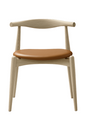 CH20 Elbow Chair er Hans J. Wegners elegante svar på den moderne spisebordsstol. Det lavt svungne ryglæn i massivt eg er dampbøjet i ét stykke og giver naturlig støtte til både albuer og lænd, mens det svævende sæde i formspændt finer sikrer lethed og stabilitet. Her får du varianten i eg sæbe med eksklusiv Sif 92 anilinlæder i en varm cognac nuance der patinerer smukt over tid. Stolen er behagelig ved bordet og fungerer lige så fint som skrivebordsstol. Designet i 1956 og sat i produktion i 2005 er CH20 blevet en nutidig klassiker der kan stables op til fire og indgår naturligt i både private hjem og restauranter.
