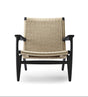 Den ikoniske CH25 i sortmalet eg med naturflet giver rummet en rolig tyngde og et elegant grafisk udtryk. De brede armlæn indbyder til at læne sig tilbage, mens den svungne ryg og lave siddestilling skaber en naturlig ergonomi. Sæde og ryg er håndflettet i et robust papirgarn, som både er behageligt og ekstremt slidstærkt. Hvert møbel kræver omkring 400 meter snor og ca. 10 timers omhyggeligt håndværk – en kvalitet, man ser og mærker fra alle vinkler. Designet af Hans J. Wegner i 1950 og produceret af Carl Hansen & Søn, er CH25 et stykke levende dansk designhistorie, der patinerer smukt og er lige så aktuelt i dag som ved lanceringen.