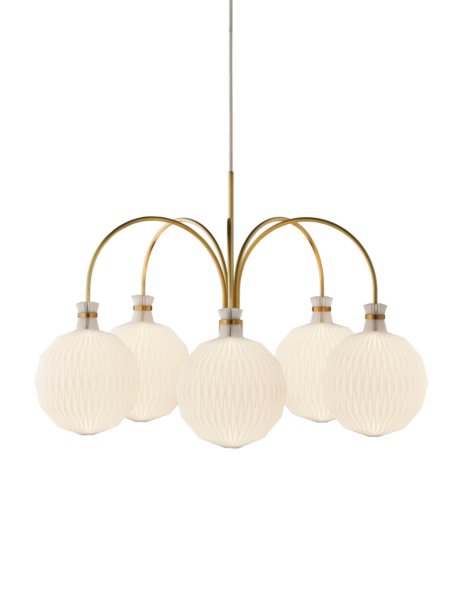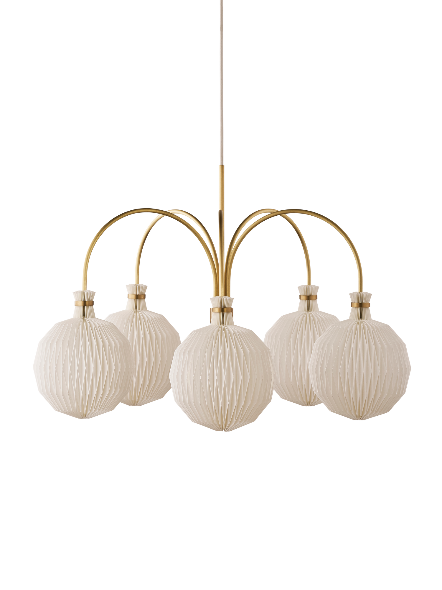 Le Klint 101 Lysekrone fra Kaare Klint Legacy er et raffineret midtpunkt til spisebord, hall eller stue. De fem blødt svungne messingarme bærer håndfoldede skærme, der giver et varmt og blændfrit lys og løfter atmosfæren med klassisk dansk elegance. Den velproportionerede højde gør den velegnet i både lavere og højloftede rum, mens materialernes kvalitet og det omhyggelige håndværk sikrer et tidløst udtryk du vil glæde dig over i mange år.