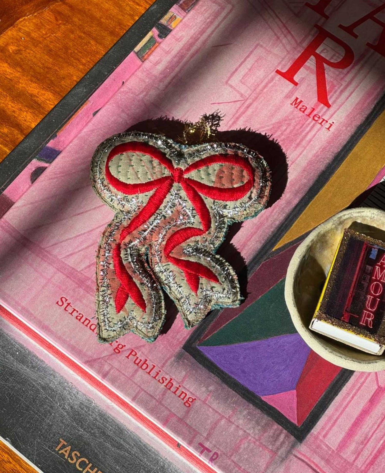 Christmas Kantha Bow fra Sissel Edelbo er et unikt juleornament, der bringer varme, historie og håndværk ind i din juleudsmykning. Hver sløjfe er fremstillet af vintage kantha-tæpper, der har fået nyt liv gennem den traditionelle indiske broderiteknik. Med sit smukke broderi i valmuerød og den fine lurex-kant spreder ornamentet en stemning af nostalgi og festlig glans. Brug det til at pynte juletræet, hænge i vinduet eller som en dekorativ detalje på en gren – et bæredygtigt og personligt valg, du vil glæde dig over år efter år.