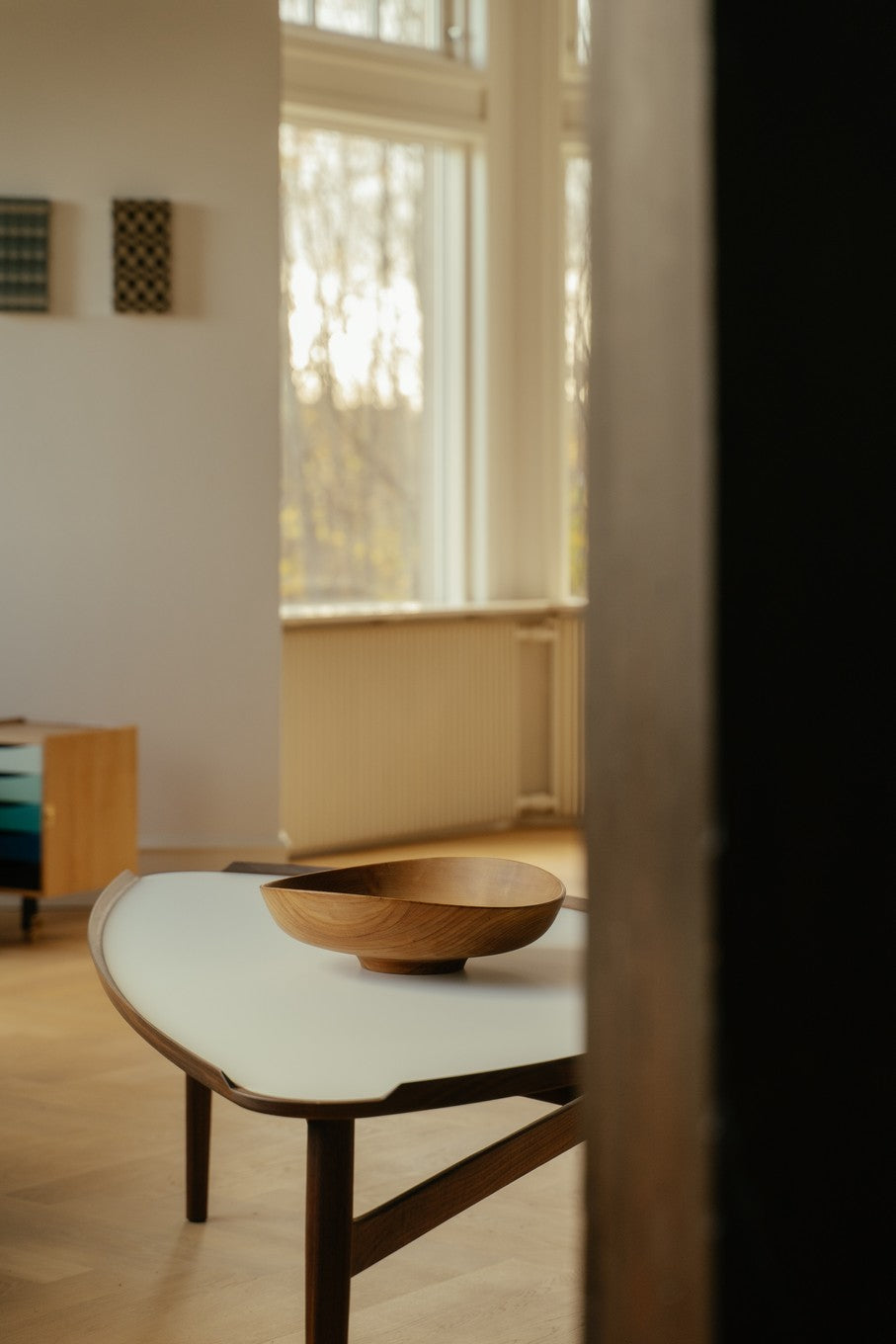 Cocktailbordet af Finn Juhl forener lethed og skulpturel elegance i et organisk formsprog, der gør bordet lige så dekorativt som funktionelt. Oprindeligt tegnet i 1951 til Baker Furniture som makker til den ikoniske Baker sofa, er bordet en større videreudvikling af Juhls øjeformede sofaborde. Den bløde kontur uden skarpe hjørner giver fri bevægelighed omkring bordet, mens de tre ben og de fint kehlede kanter afslører et udsøgt snedkeri. Bordpladen fås enten i ædel finér for et varmt og klassisk udtryk eller i hvid nanolaminat og sort linoleum for et mere grafisk look. Et tidløst midcentury statement til stuen, der stadig føles moderne i dag.
