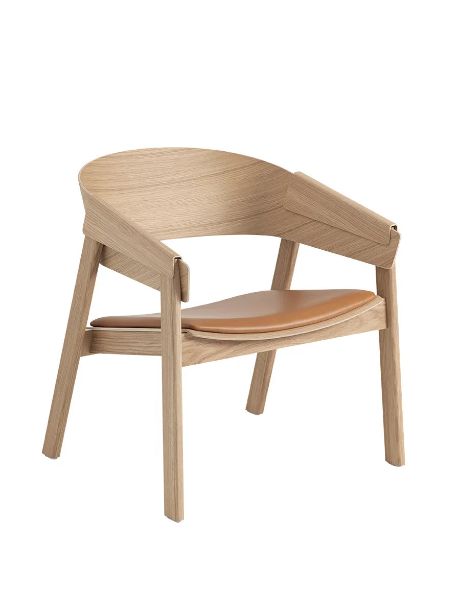 Cover serien fra Muuto er efterhånden velkendt, og er desuden en af de første serier af stole, Muuto producerede. Her er det den lave loungestol, Cover Lounge Chair.. Cover loungestolen har sæde i finér og stel i massivt træ, der giver den et sofistikeret og simpelt udtryk. Her i en smuk lakeret egetræ og med sædepolstring i cognacfarvet Refine læder.