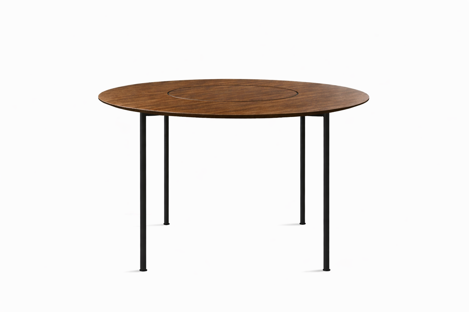 Materiale: Bordplade i finér/laminat på trækerne med indlagt messingring, stel i sort pulverlakeret stål.