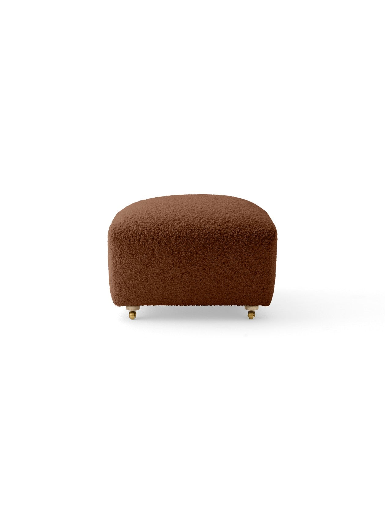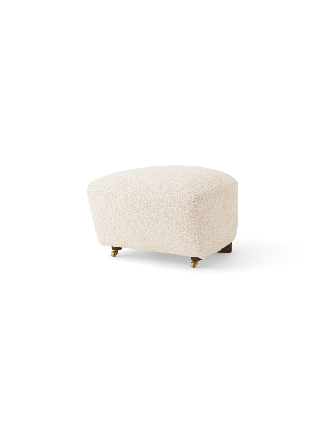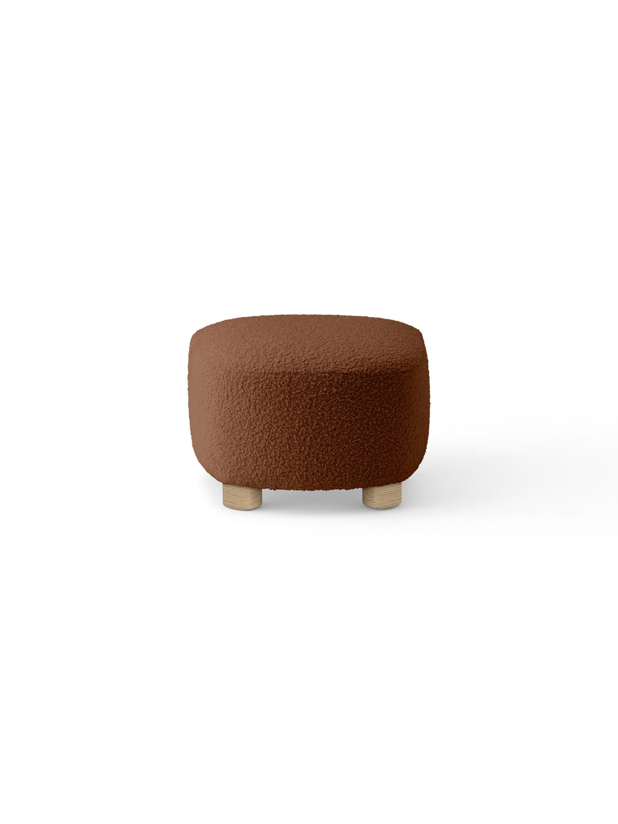 Fuldend komforten med Den Trætte Mand fodskammel i Baena 95 fra Audo Copenhagen. Den varme brunlige bouclé fremhæver de bløde, afrundede linjer og matcher lænestolen perfekt. Vælg ben i eg for et naturligt look – eller mørkbejdset eg for markant kontrast. De forreste messinghjul gør skamlen let at flytte mellem læsehjørnet, sofaen og pejsen.
