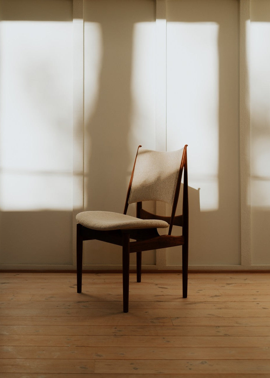 Egypterstolen er Finn Juhl i sin mest poetiske form. Den let svungne ryg, de karakteristiske horn og den frie afstand mellem polstring og træ giver et luftigt udtryk der skaber et lille rum i rummet. Stolen er inspireret af antikke egyptiske siddemøbler som Juhl studerede på Louvre, men tolket med dansk modernismes sans for proportioner og håndværk. I eg med klar olie fremstår stolen varm og naturlig, og den håndpolstrede komfort gør den oplagt omkring spisebordet eller som markant solitær i stuen. Produceret i Danmark af House of Finn Juhl med kompromisløs finish og traditionelle snedkerdetaljer.