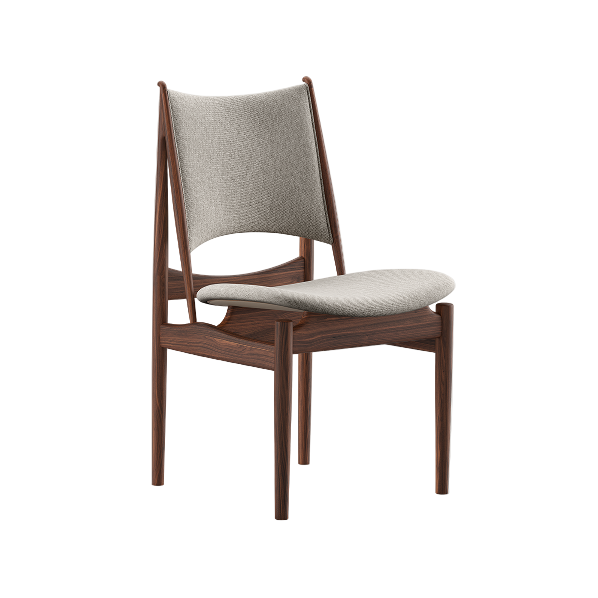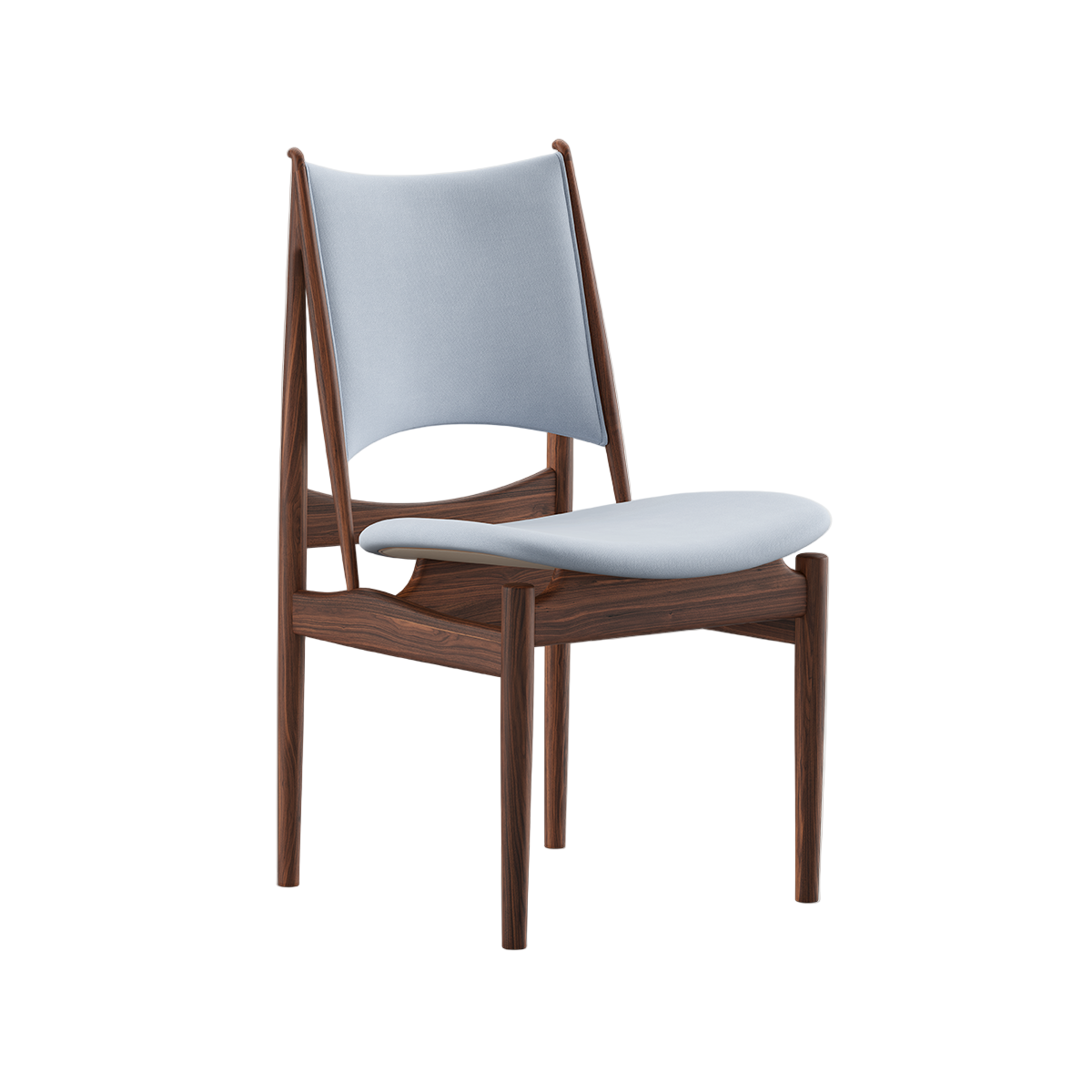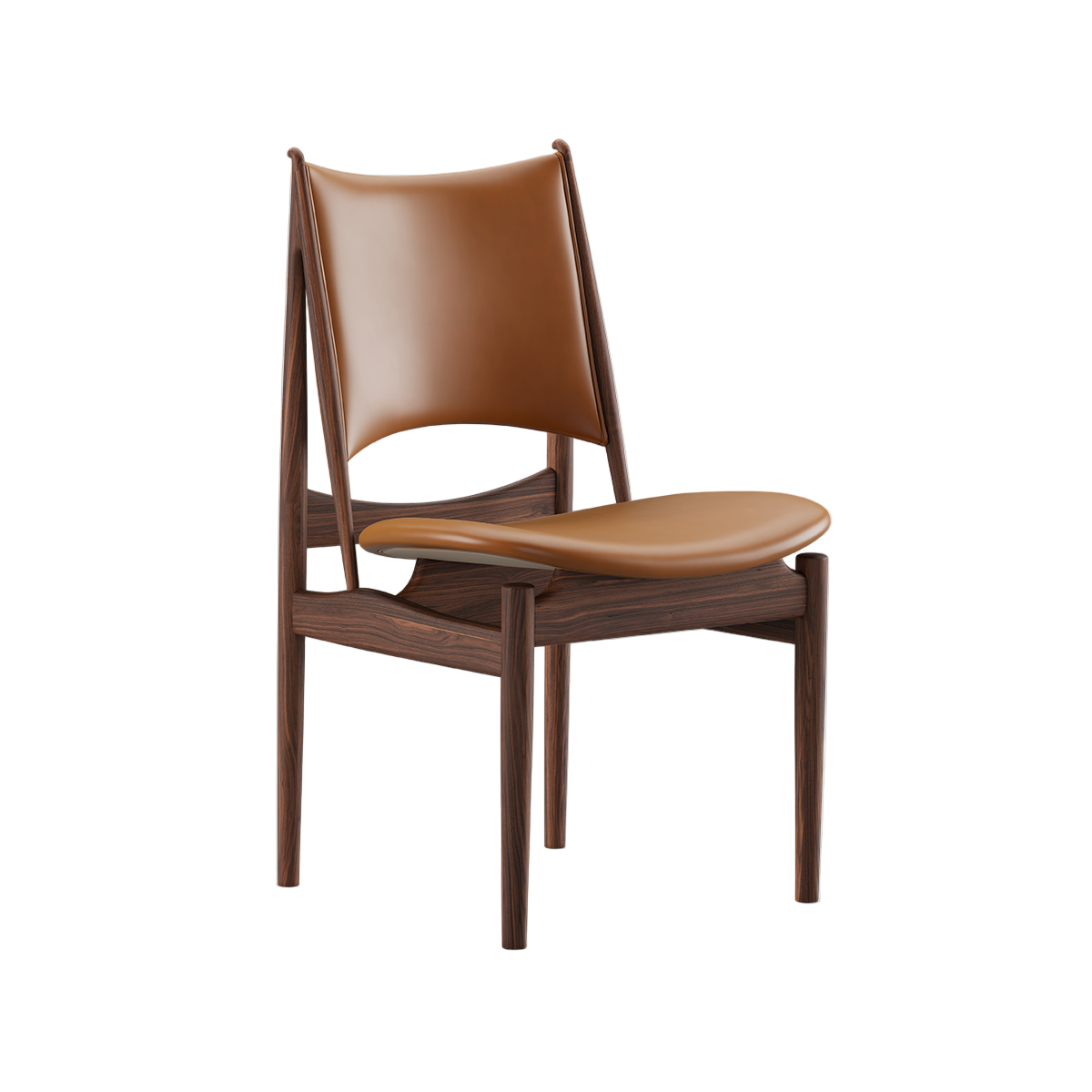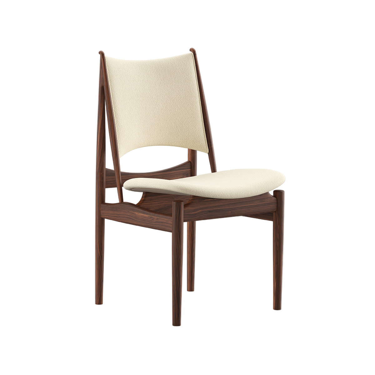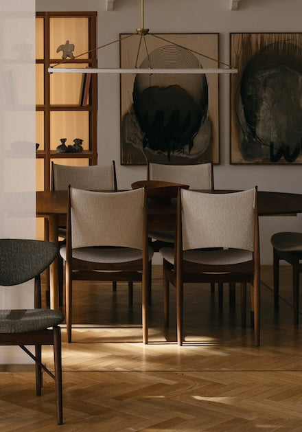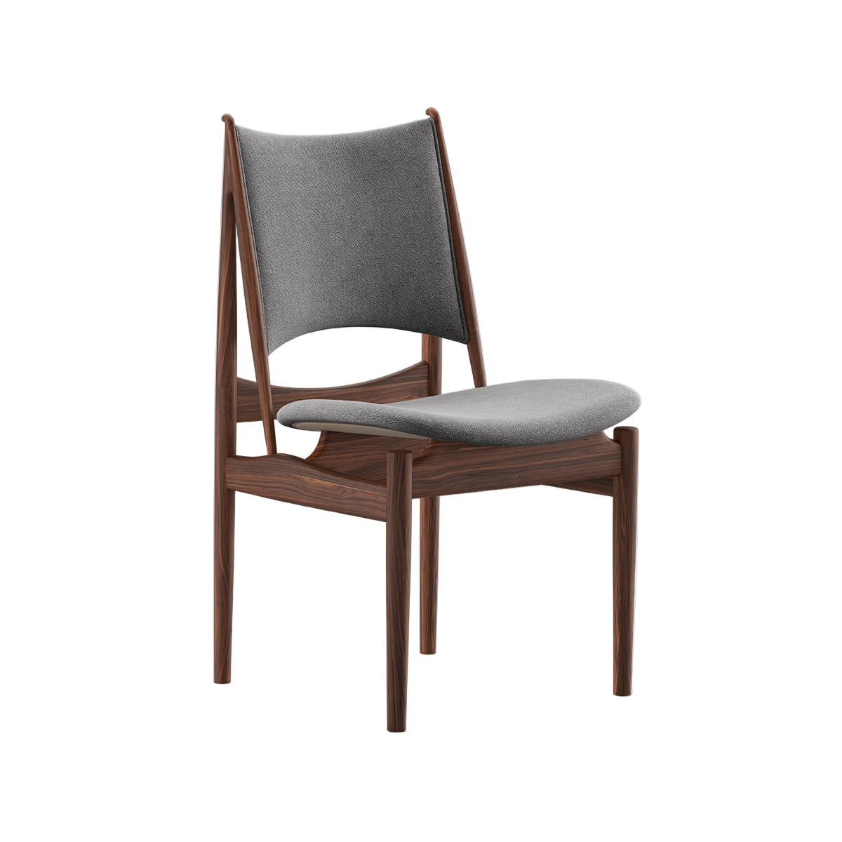 Egypterstolen i valnød forener Finn Juhls skulpturelle formsprog med en forfinet lethed, der næsten får stolen til at svæve omkring bordet. De elegante horn på ryggen, den svungne ramme og den bløde håndpolstring skaber et indbydende udtryk, som både er raffineret og afslappet. Designet blev vist første gang i 1949 og produceres i dag med samme kompromisløse håndværk i Danmark, så du får et ikon, der både tåler hverdagen og hæver rummet med karakter.