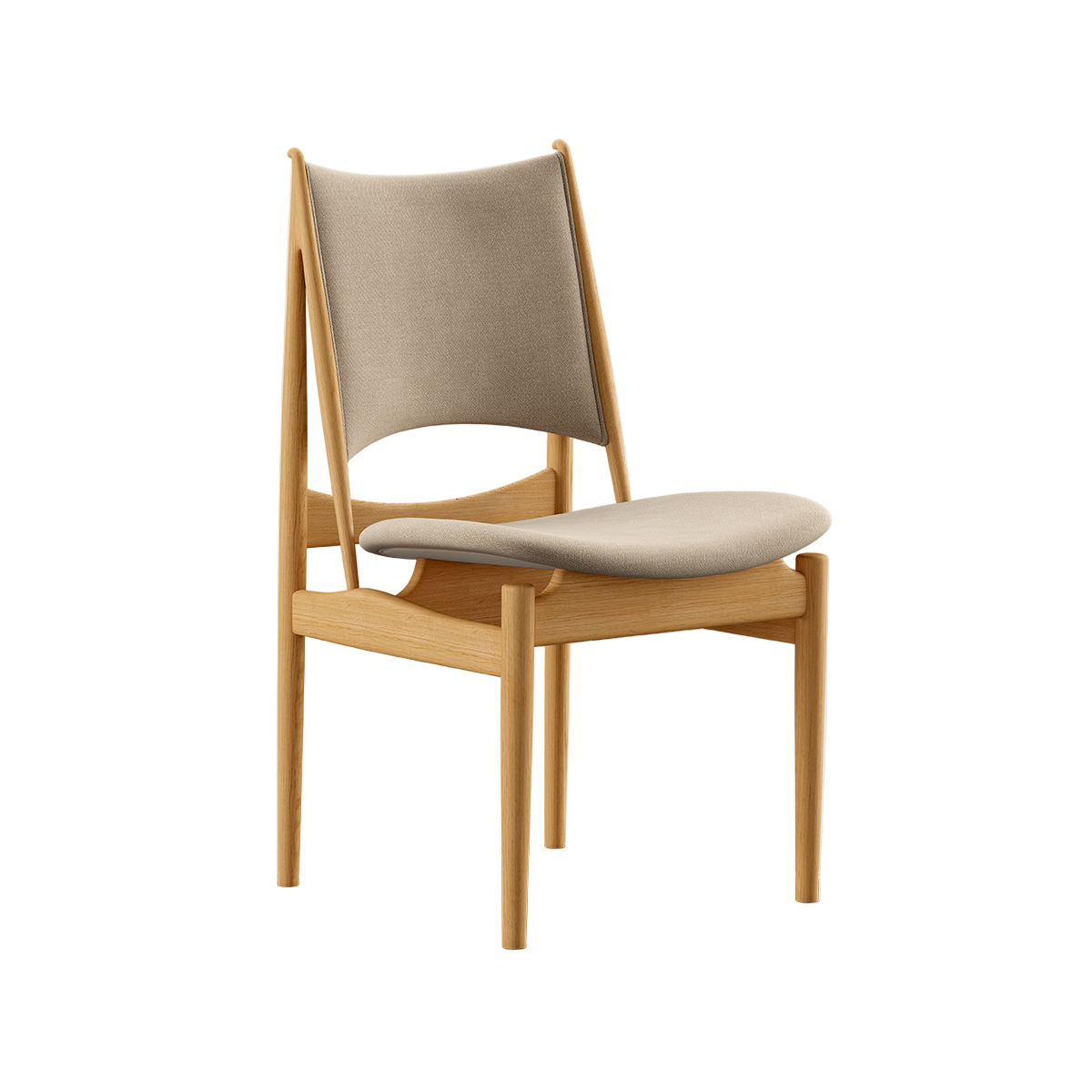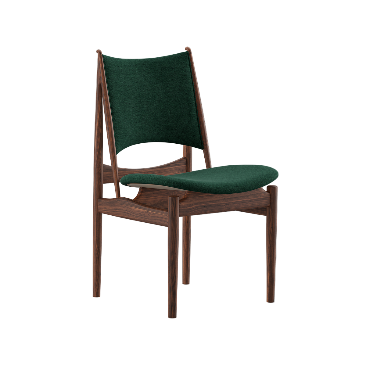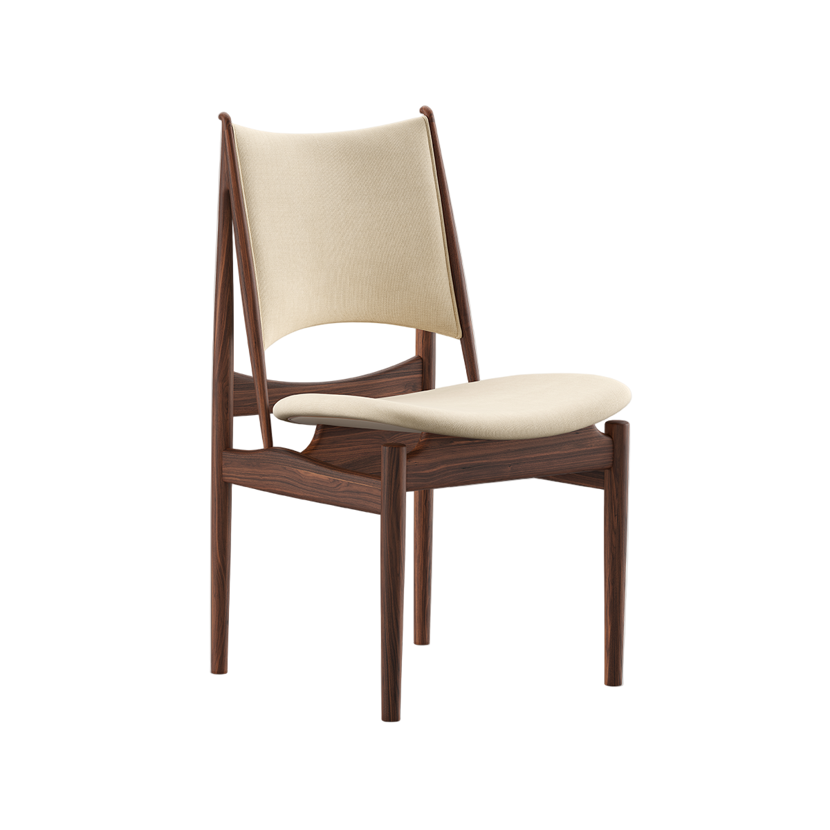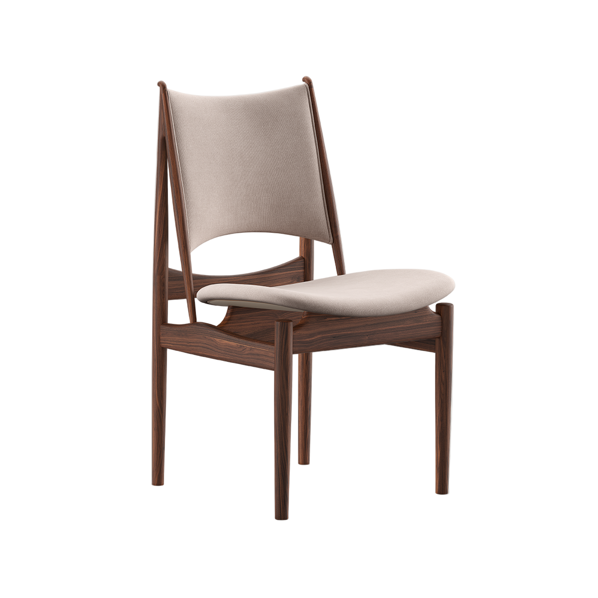 Egypterstolen i valnød forener Finn Juhls skulpturelle formsprog med en forfinet lethed, der næsten får stolen til at svæve omkring bordet. De elegante horn på ryggen, den svungne ramme og den bløde håndpolstring skaber et indbydende udtryk, som både er raffineret og afslappet. Designet blev vist første gang i 1949 og produceres i dag med samme kompromisløse håndværk i Danmark, så du får et ikon, der både tåler hverdagen og hæver rummet med karakter.