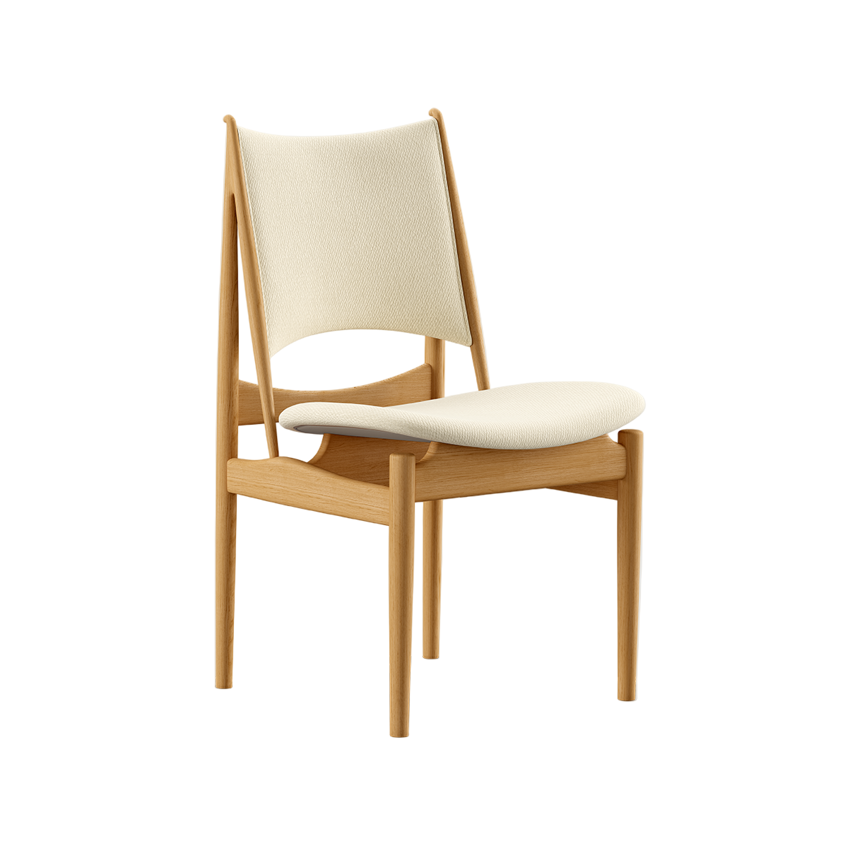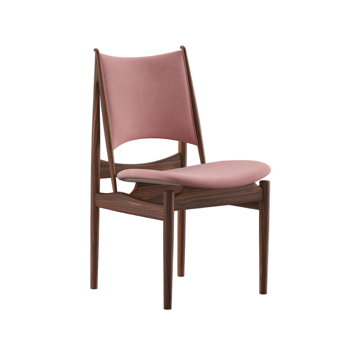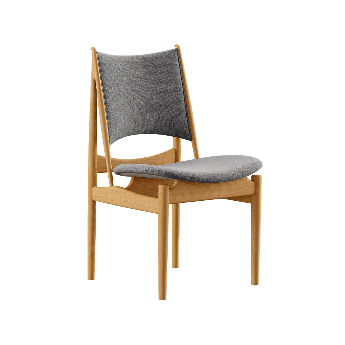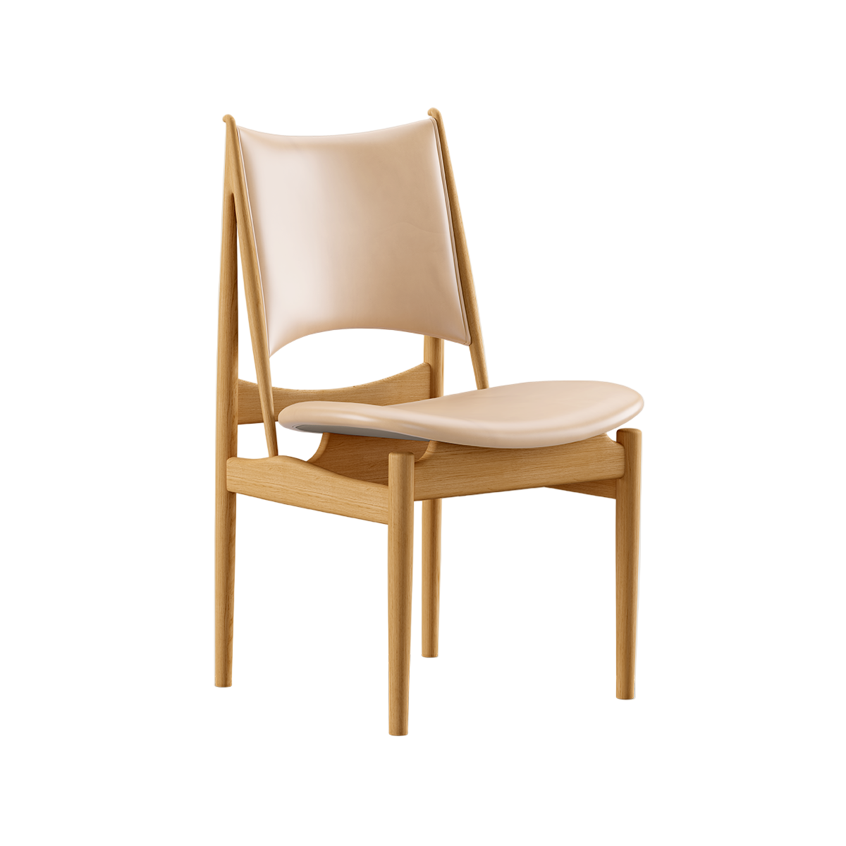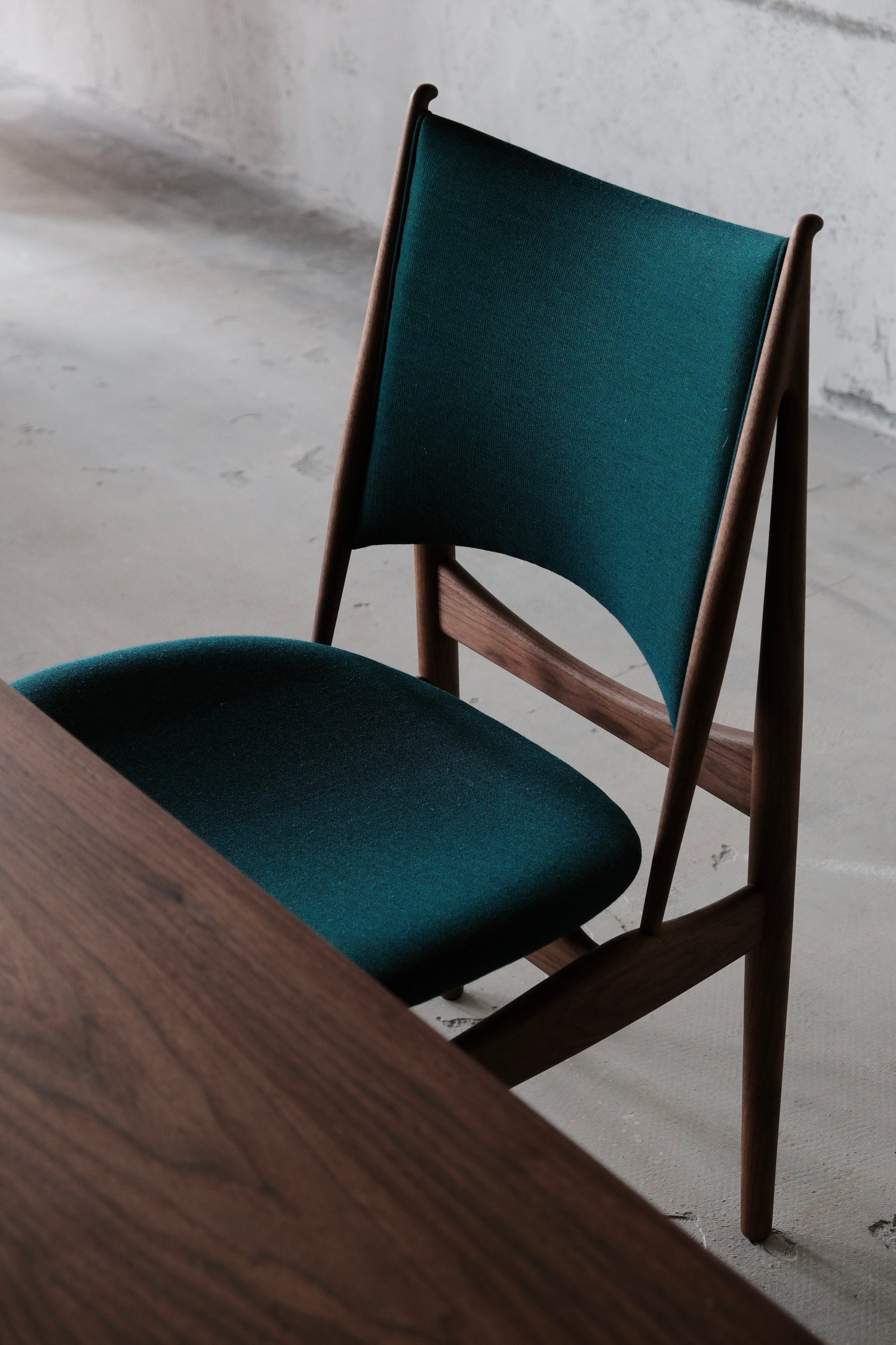 Egypterstolen i valnød forener Finn Juhls skulpturelle formsprog med en forfinet lethed, der næsten får stolen til at svæve omkring bordet. De elegante horn på ryggen, den svungne ramme og den bløde håndpolstring skaber et indbydende udtryk, som både er raffineret og afslappet. Designet blev vist første gang i 1949 og produceres i dag med samme kompromisløse håndværk i Danmark, så du får et ikon, der både tåler hverdagen og hæver rummet med karakter.