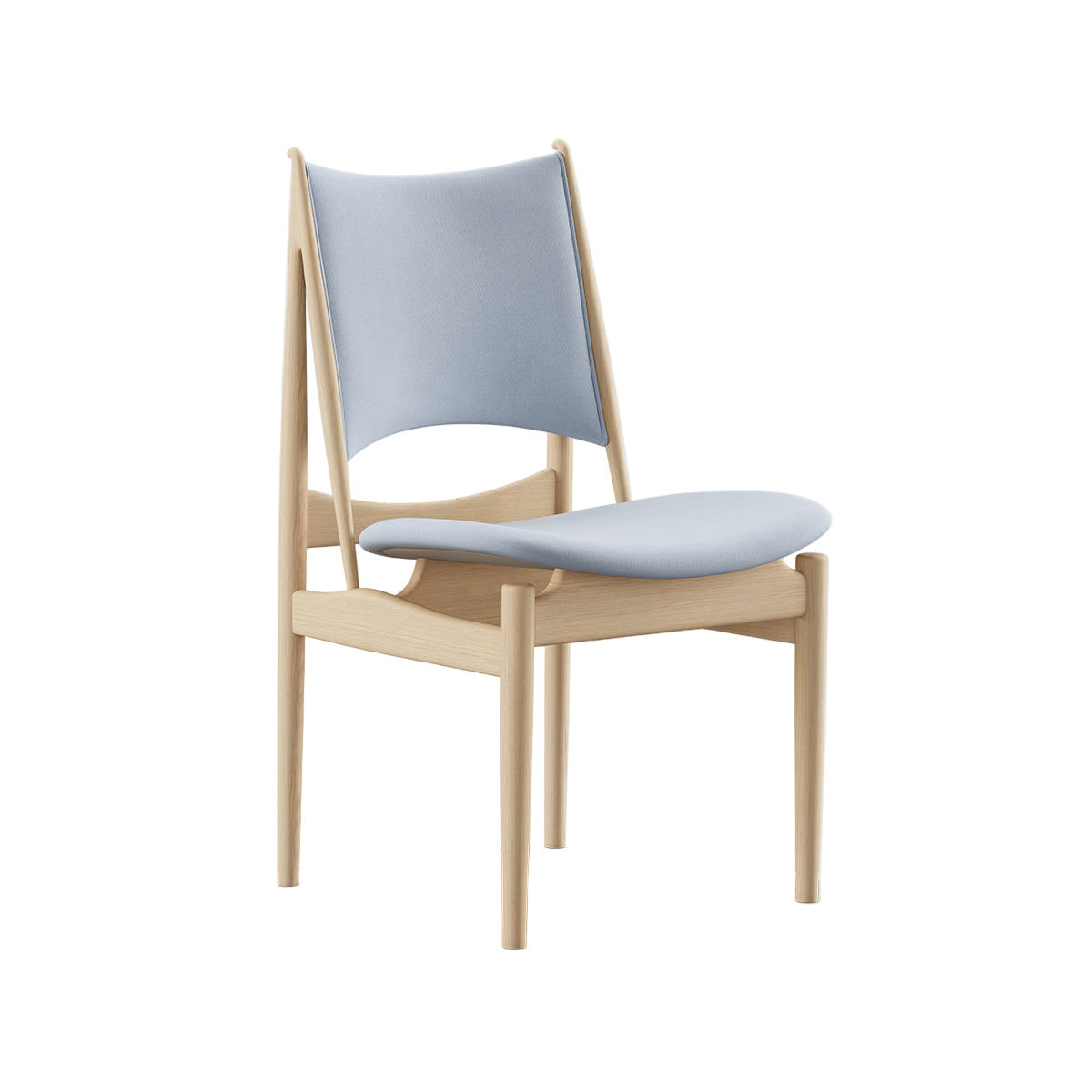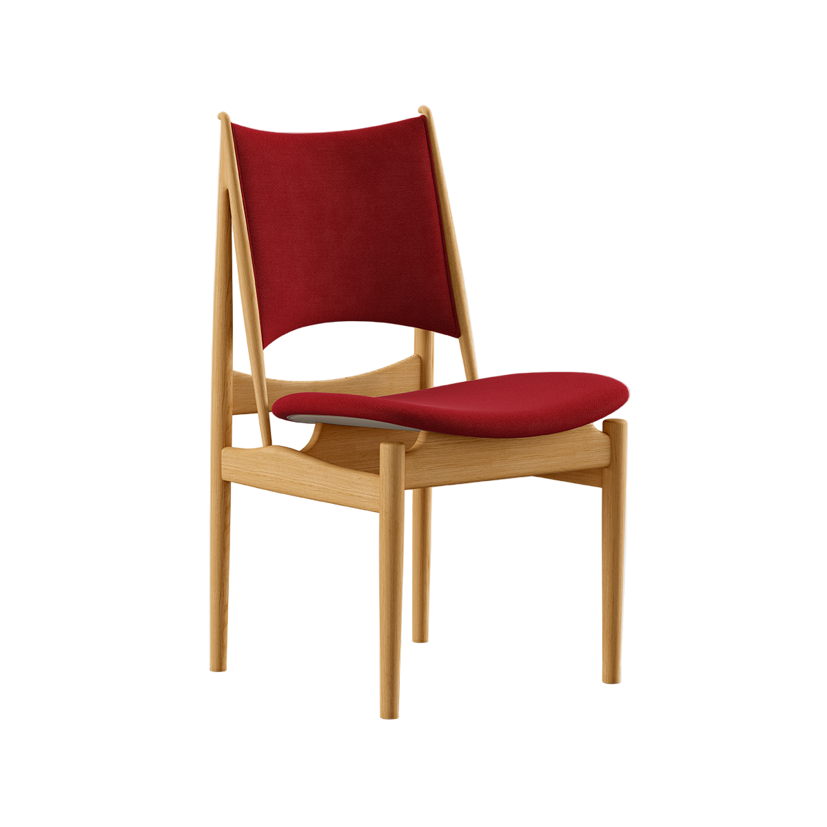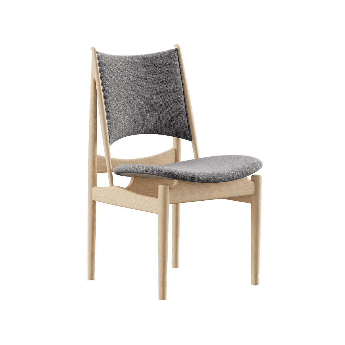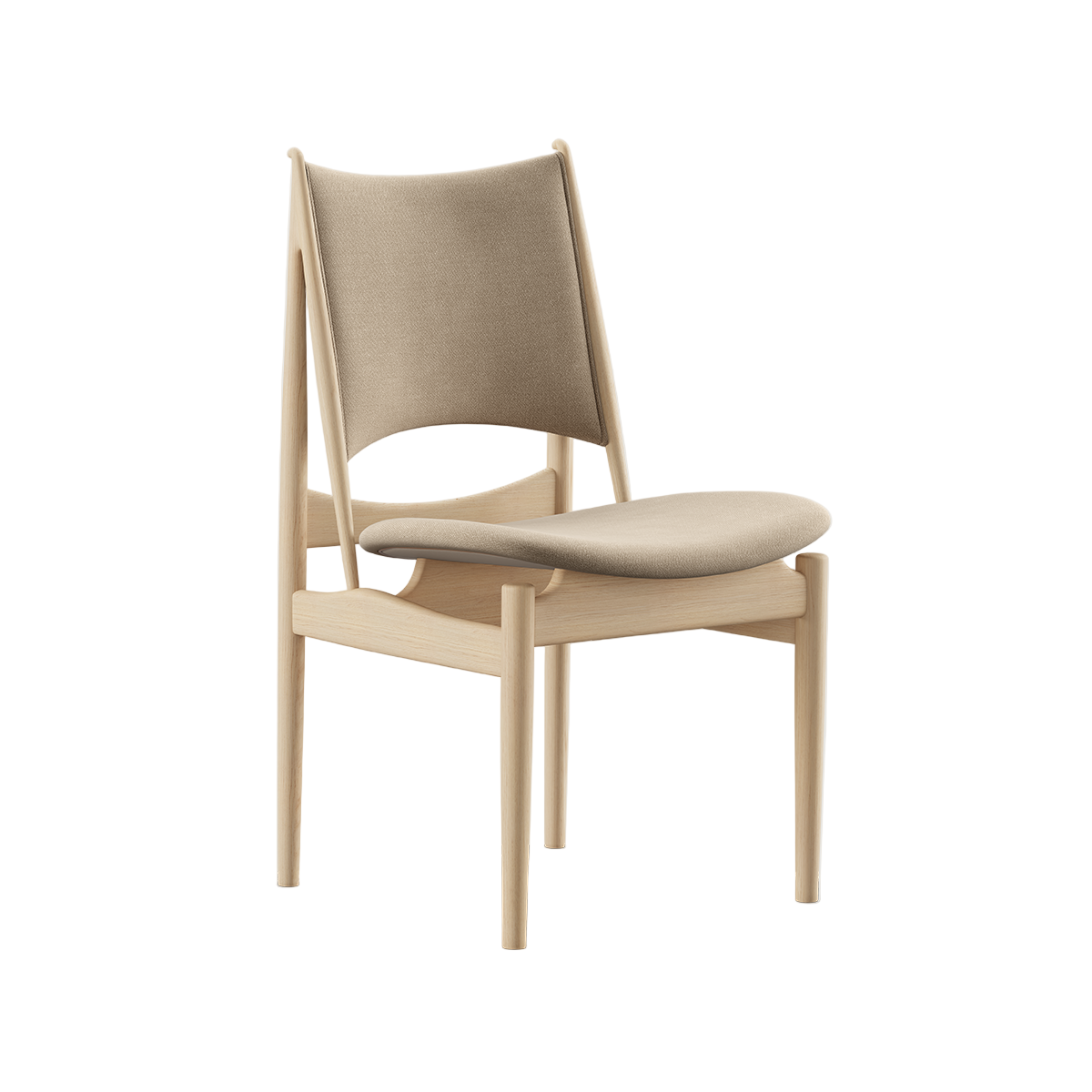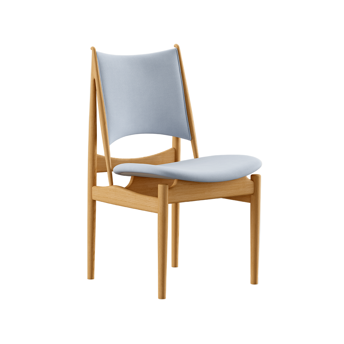 Egypterstolen i valnød forener Finn Juhls skulpturelle formsprog med en forfinet lethed, der næsten får stolen til at svæve omkring bordet. De elegante horn på ryggen, den svungne ramme og den bløde håndpolstring skaber et indbydende udtryk, som både er raffineret og afslappet. Designet blev vist første gang i 1949 og produceres i dag med samme kompromisløse håndværk i Danmark, så du får et ikon, der både tåler hverdagen og hæver rummet med karakter.