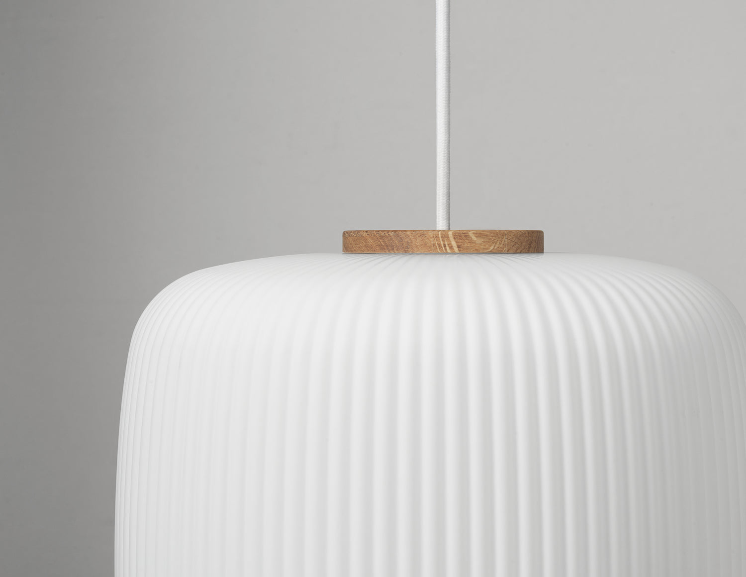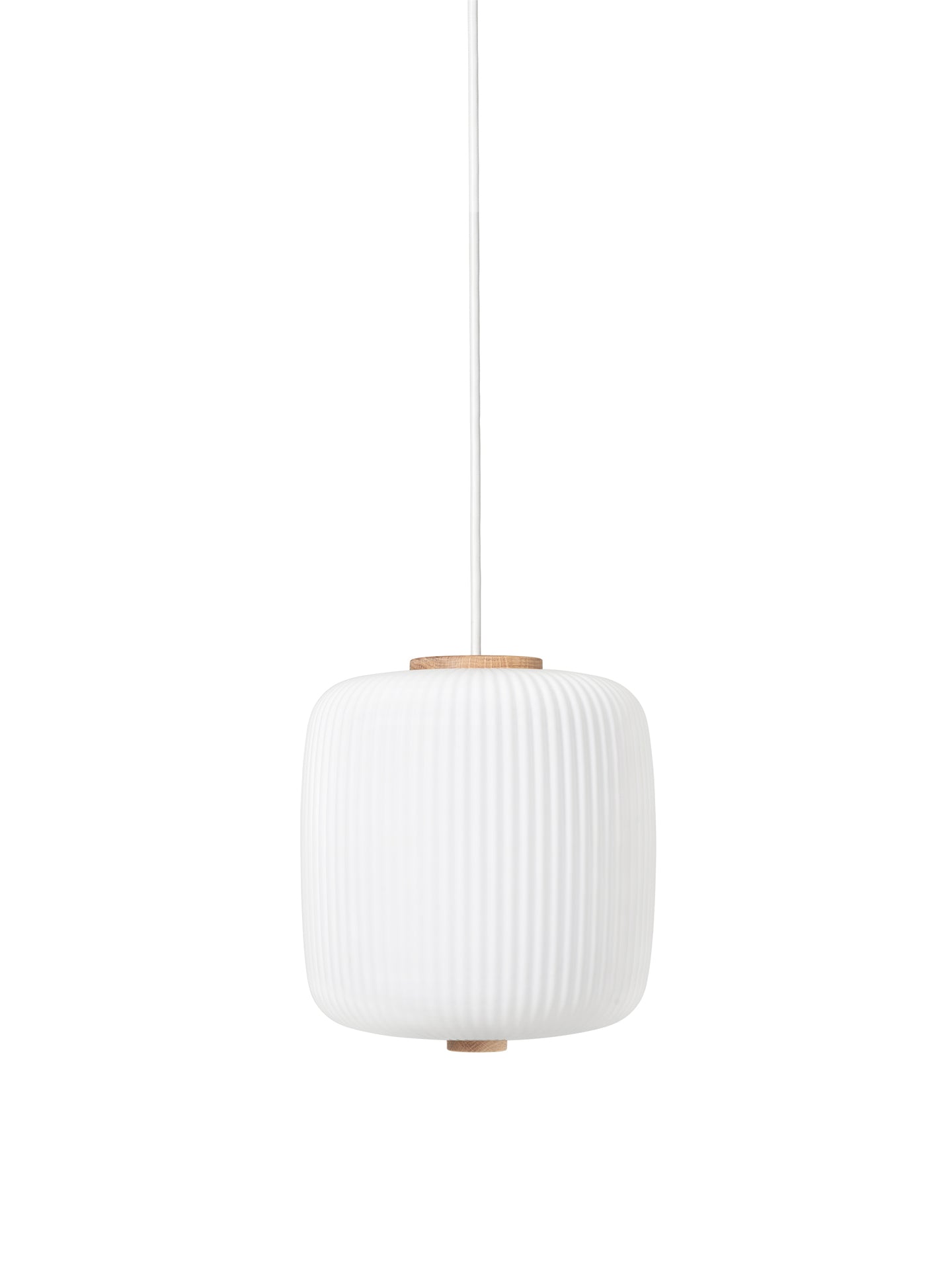 EK61 er Esben Klints underspillede hyldest til klassiske materialer og dansk formsans. Den plisserede, superelliptiske skærm i mundblæst opalglas giver et blødt, behageligt lys, mens top og bund i olieret eg tilfører varme og taktilitet. Formen er inspireret af traditionelle lanterner og fungerer både enkeltvis og i række over spisebord, køkkenø eller som stemningsfulde klynger i stuen. Lampen fås i tre afstemte størrelser, leveres med hvid baldakin og tre meter ledning og er klar til moderne LED-lyskilder for lavt energiforbrug og lang levetid.