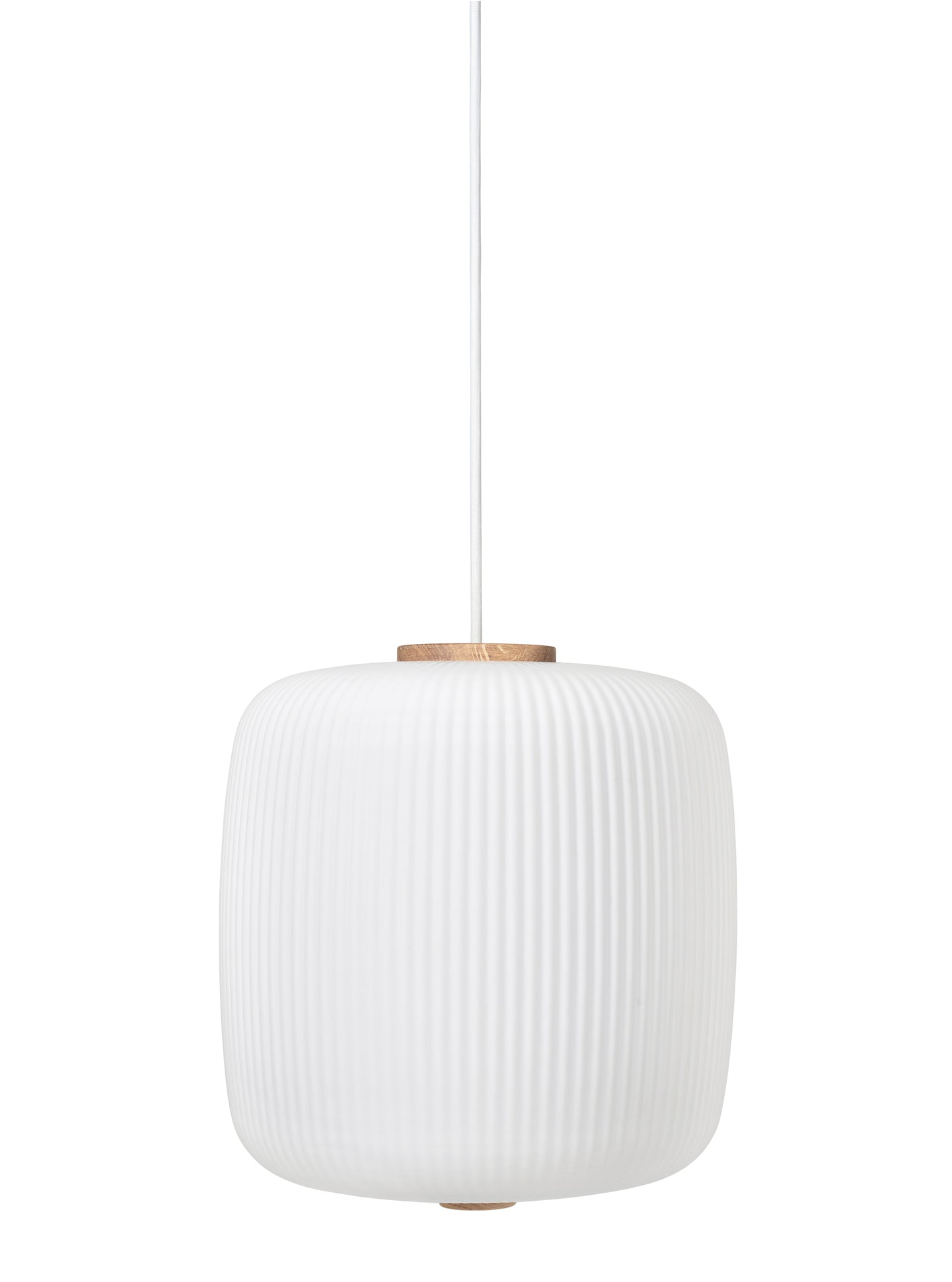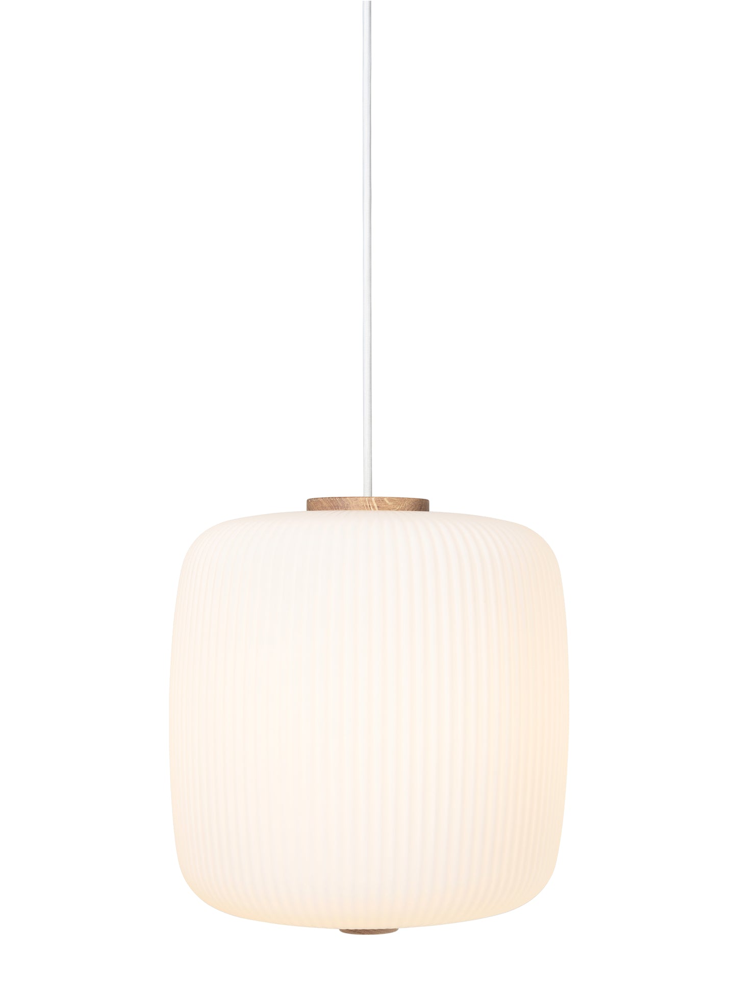 Materiale: Mundblæst opalglas, FSC certificeret eg, metalbaldakin