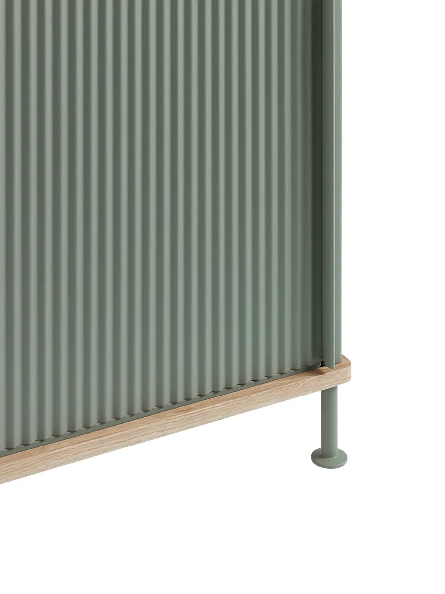 Enfold Sideboard fra Muuto er udført i industrielt design med høj klasse. Enfold skænken her er udført i lakeret stål, der omkredser bund og top i egetræ. Det flotte Enfold Sideboard fås i flere forskellige farver, så du kan finde lige netop den, der passer hjem til dig. Enfold skænken kommer med en hylde, så den er, foruden at være et smukt møbel at se på, en god mulighed for opbevaring.