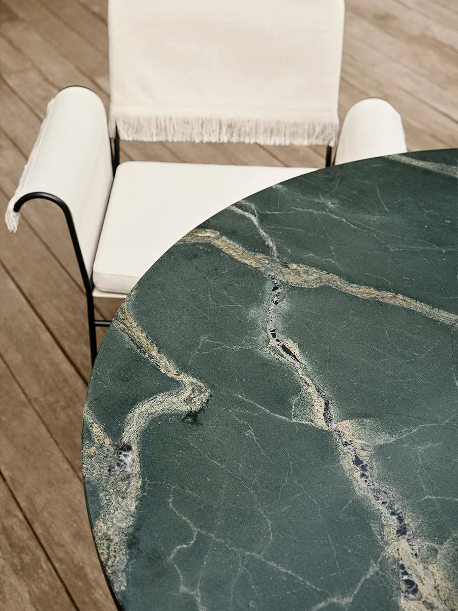 Epic Outdoor Dining Table fra GUBI er et skulpturelt møbel designet af designduoen GamFratesi. Inspirationen bag designet kommer fra antikkens græske og romerske arkitektur, hvilket afspejles i bordets monolitiske silhuet og materialevalg. Bordet er fremstillet af kvartsit, en naturlig sten kendt for sin exceptionelle holdbarhed og modstandsdygtighed over for vand og ekstreme temperaturer, hvilket gør det ideelt til udendørs brug. Den anvendte kvartsit er kendetegnet ved sin dybe grønne farve med sorte årer, grå hvirvler og spredte hvide krystalklynger, hvilket giver hvert bord et unikt udtryk. Leveringsoplysninger: Grundet størrelse og vægt kan denne vare kun leveres til kantsten eller levering med indbæring i stueplan uden trapper. For levering med indbæring i etageejendom eller hvor adgangsforholdene kræver det, starter fragten på 2.500 kr. Kontakt os inden levering på telefon, email eller chat for tilbud på fragten i etageejendom. Design: GamFratesi Mål: Ø 130 x H 74 cm Vægt: 130 kg Materiale: Botanic Green Quartzite