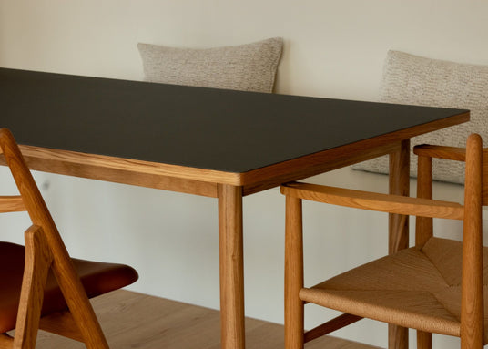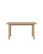 ESSENTIAL OAK i udgaven med egetræsfinér er tænkt som en rolig base for hverdagens rytme. Bordpladen i oak veneer viser en varm, finmasket åretegning der skifter smukt med lyset og giver en sanselig ramme om måltidet. De slanke ben i massivt egetræ løfter helheden og holder udtrykket let. Med en længde på 140 centimeter og en bredde på 90 centimeter får du et format der giver god plads til fire faste pladser og en ekstra gæst uden at stjæle for meget gulv. Proportionerne er nøje afstemt så bordet står stabilt men aldrig virker tungt. Den lakerede træfinish gør overfladerne nemme at tørre af og bevarer det rene udtryk gennem daglig brug. Vælg oak veneer når du ønsker et spisebord hvor materialernes ærlighed og et præcist snedkeri arbejder sammen i en diskret, tidløs helhed der er lige så velegnet til stille hverdage som til dækkede borde med tekstiler, keramik og glas.