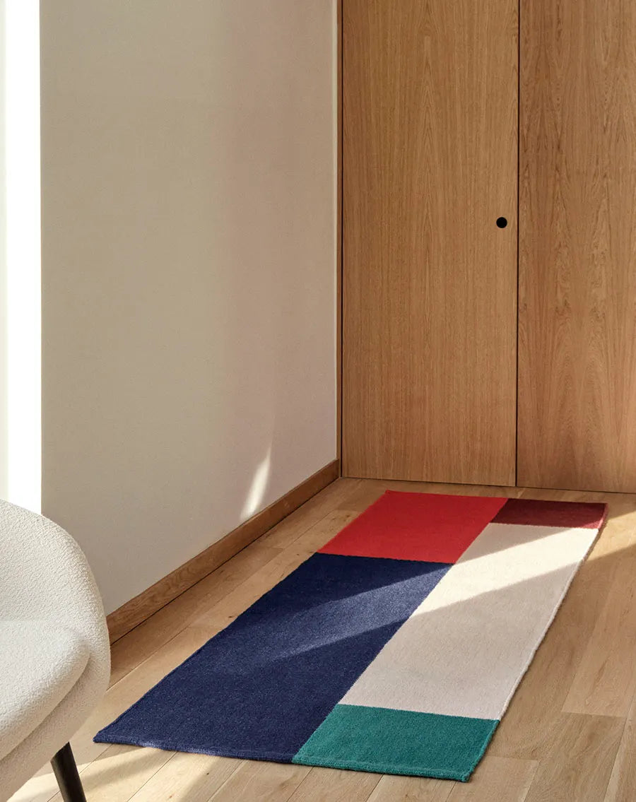 Ethan Cook's Flats Works er vævede løbere, tæpper og vægkunst. Kelimtæpperne er håndlavet i samarbejde med Hay, og har det smukkeste geometrisk abstrakte design. Tæpperne kan bruges som gulvtæppe i stuen, entréen eller soveværelset, hvor de vil skabe hygge og varme. Du kan også bruge tæpperne som vægpynt, hvor de både vil være et anderledes stykke kunst, som både skaber blikfang og god akustik.