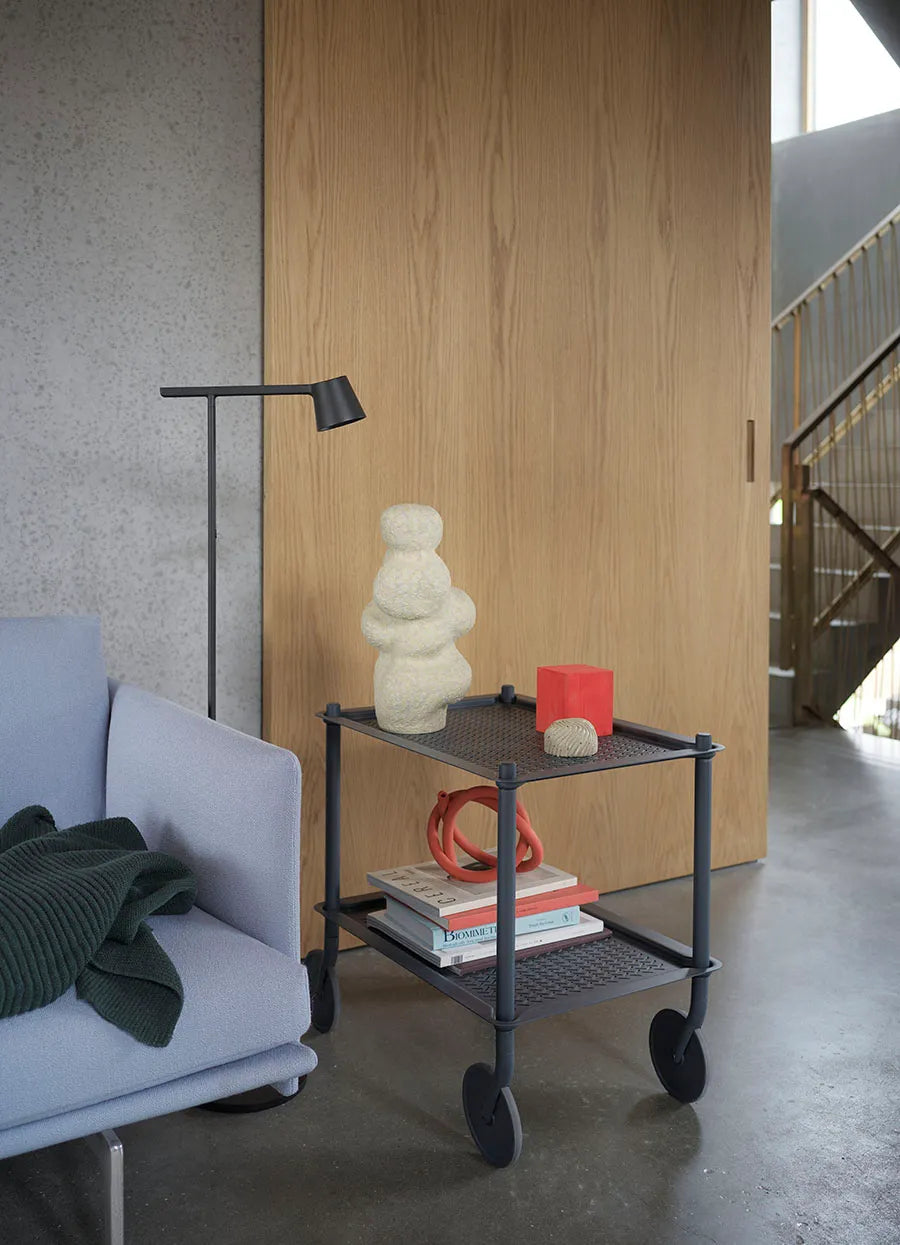 Flow Trolleyen fra Muuto er et fint, lille rullebord der kan bruges i ethvert rum. Brug rullebordet med planter for et naturligt og eksotisk udtryk. Bakkerne i Flow trolleyen er perforeret stål, som giver et meget industrielt udtryk. Flow Trolleyen her er med tre bakker.