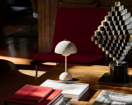 Den populære Flowerpot VP9 portable bordlampe fra &Tradition, designet af Verner Panton i 1968, er et fremragende eksempel på dansk design og viser den danske designers innovative tilgang til belysning. Flowerpot VP9 lampen er nu tilgængelig i en genopladelig og trådløs udgave. Denne lille, bærbare Flowerpot VP9 bordlampe gør det nemt at skabe hygge og atmosfære både indendørs og udendørs, uanset hvor du befinder dig.