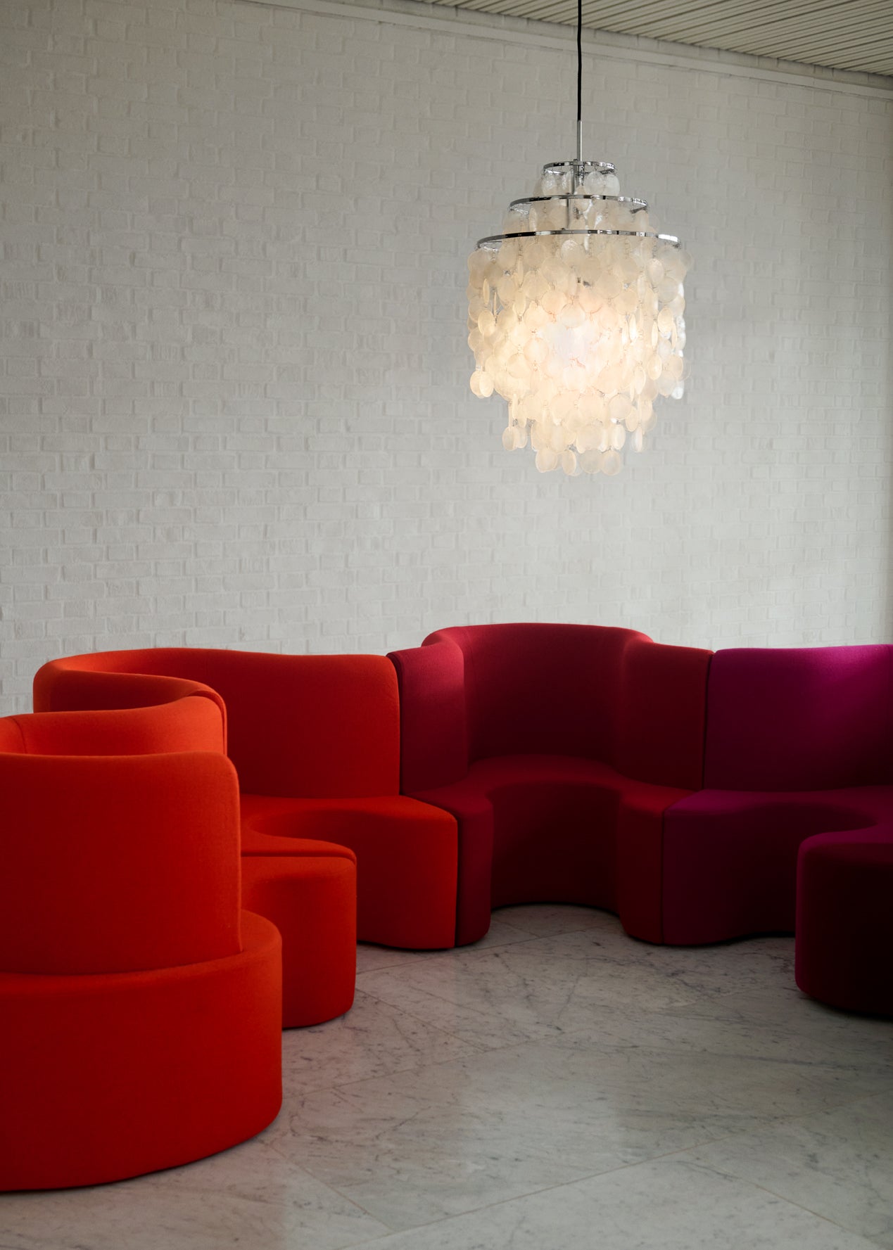 Fun 11DM pendel. Lamper laves ved Verpan og er designet af Verner Panton. Hængelampe med fem-rings stel, hvorfra perlemors-skallerne er monteret. Skallerne er forbundet med små runde metalkæder/ringe.