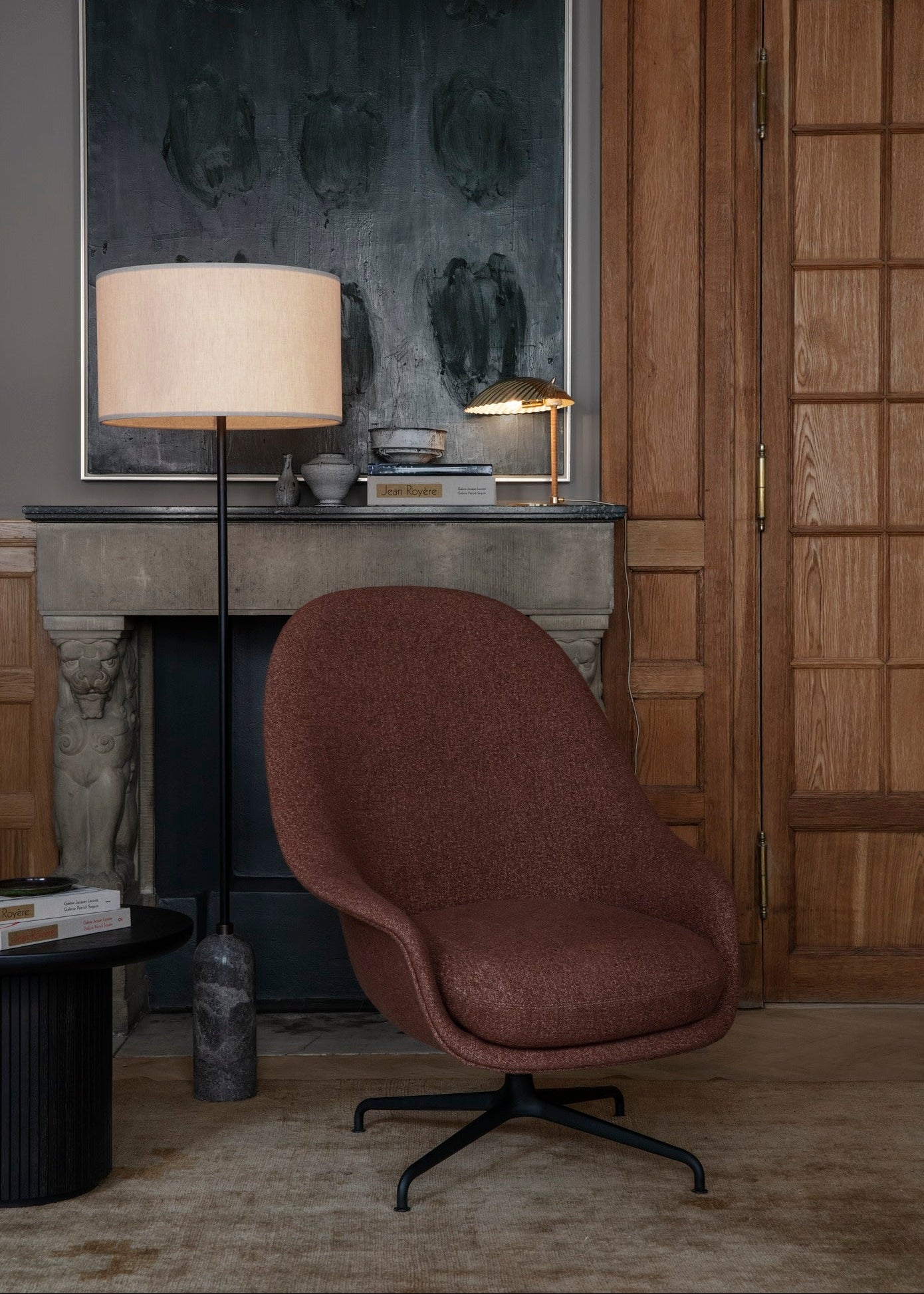 GUBI Gravity gulvlampen er designet af Space Copenhagen. Standerlampen laves i sort marmor, grå marmor eller sort stål med hvid eller kanvas skærm. Lampen har lysdæmper på basen.