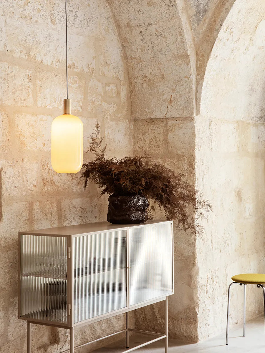 Haze Sideboard fra Ferm Living er en elegant skænk, som er perfekt til opbevaring af i stuen eller andre steder i hjemmet. Siderne og dørene er i trådglas, hvilket giver et sofistikeret udtryk og slører samtidig indholdet bag lågerne.