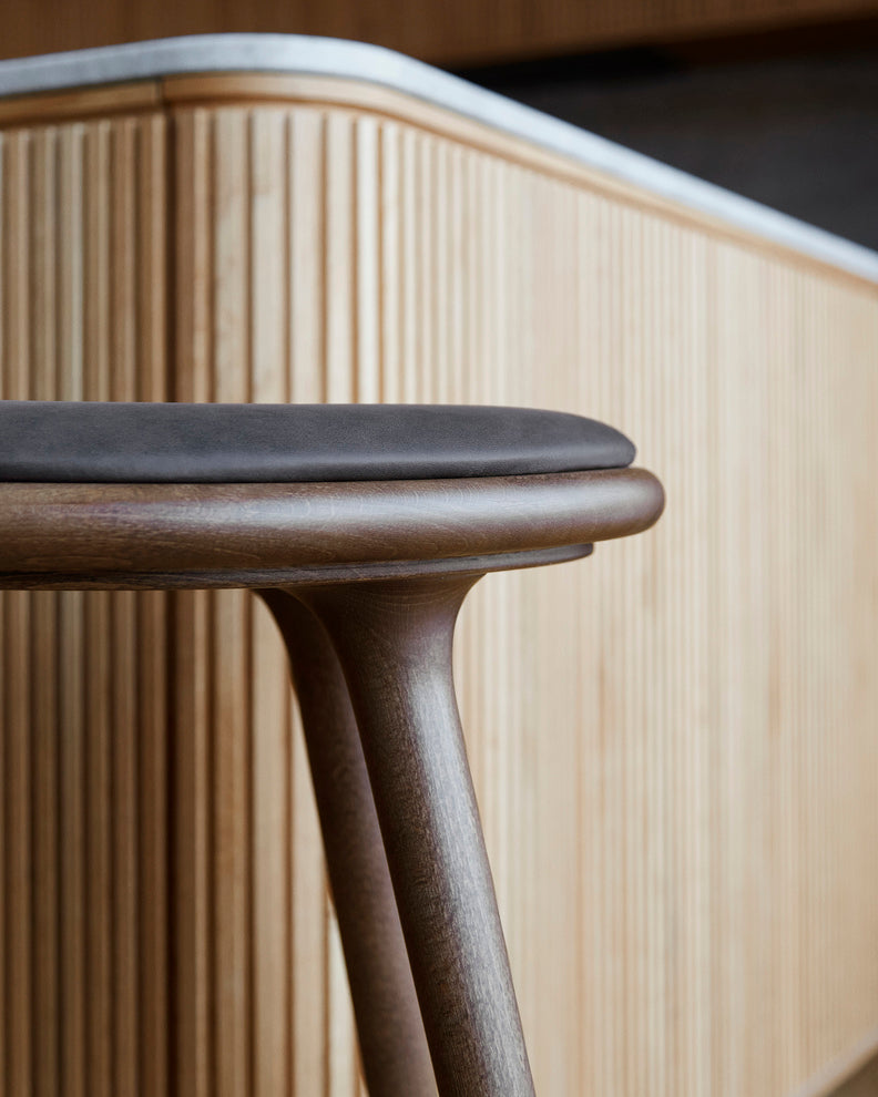 Premium Edition udgave i Sikra Grey, gråbejdset egetræ. Den høje barstol fra Mater er designet af den danske arkitekt duo Space Copenhagen. Stolene er produceret udelukkede af FSC certificeret træ. Sædet er polstret i sort læder. Der findes tre udgaver af denne model. Barstol i H: 74 eller 69 cm eller som skammel. Dette er den høje barstol.