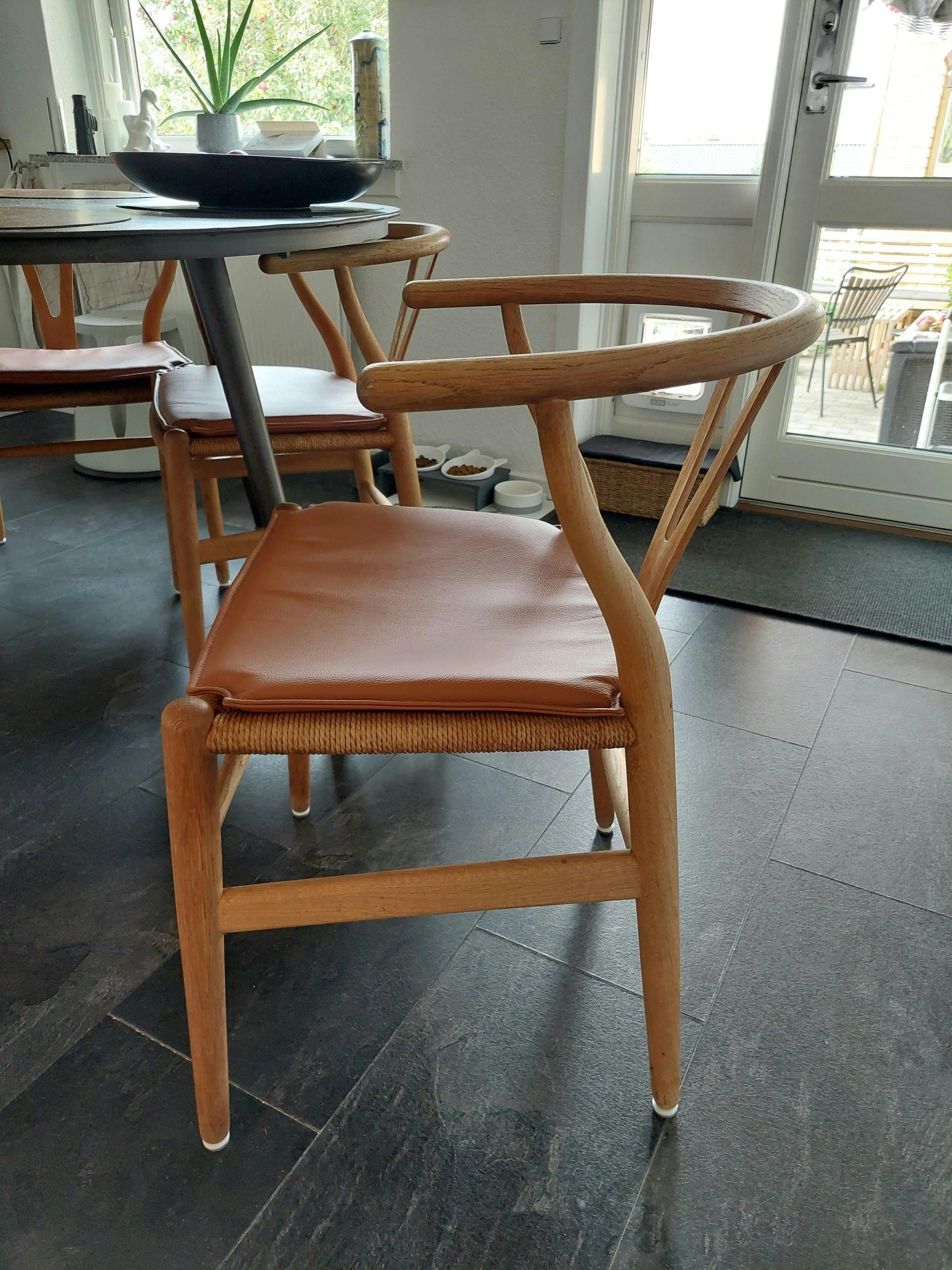 Hynde i slidstærkt læder, der passer til Hans J. Wegners populære og ikoniske Y-stol. Denne hynde er i en cognac læder, der har fået overfladebehandling, således den er let at holde og samtidig enormt slidstærk. Overfladebehandlingen af læderet gør, at hynden let kan tørres over med en fugtig klud og at hynden ikke behøver behandling i form af læderfedt. Hynden er lavet specifikt til CH24 Y-stolen. Brug hynden i Y-stolen for at øge komforten og for at skåne flettet på stolen. Jacobsen Plus har i samarbejde med en lokal leverandør af lædervarer fået fremstillet hynderne. Jacobsen Plus' hynder til Y-stolen kommer også i en overfladebehandlet sort læder samt to hynder i anilin læder.