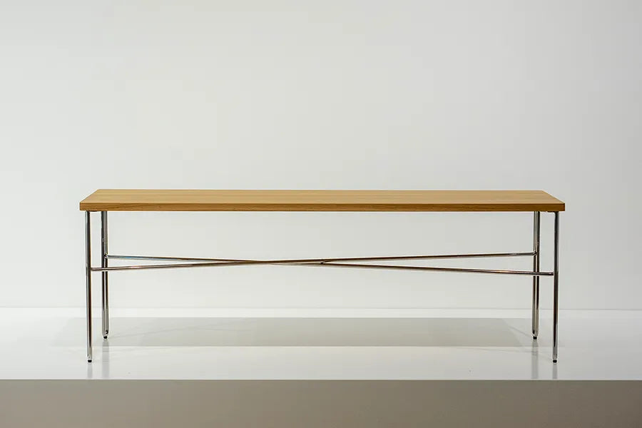 Inline er en serie af sofaborde og reolsystemer defineret af parallelle linjer i rustfrit stål.